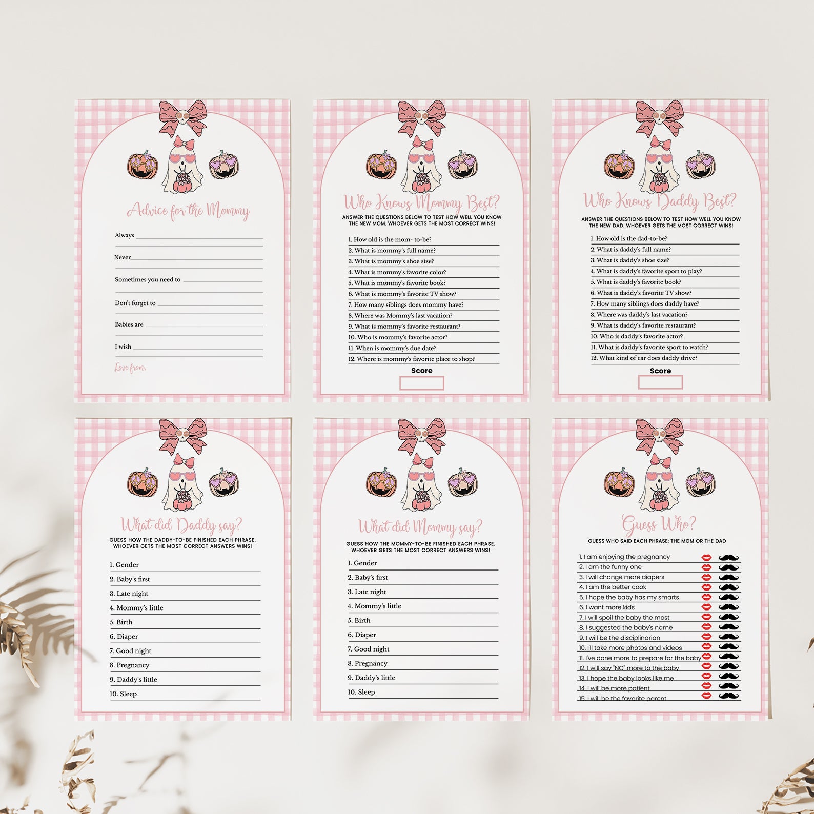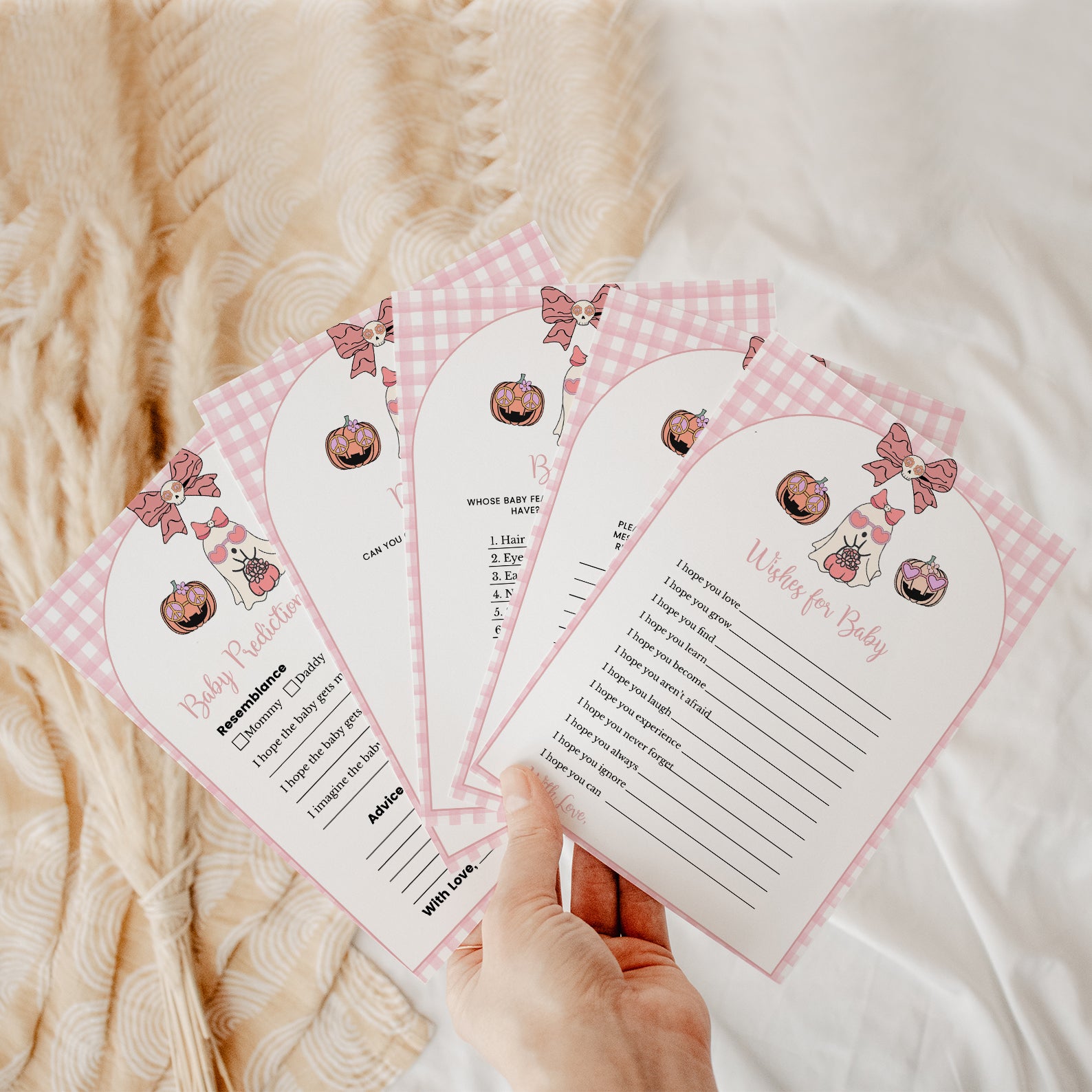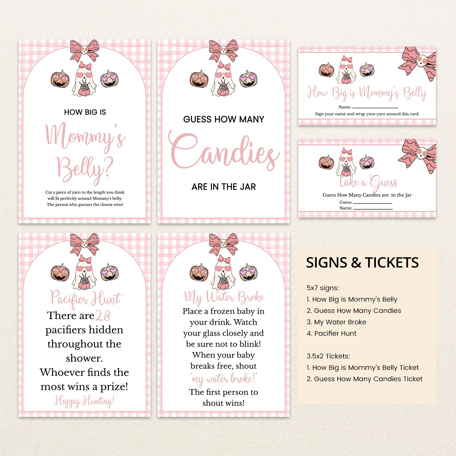 - Purchase this Pink Halloween Baby Shower Game Bundle with Cute Ghost & Pumpkins template