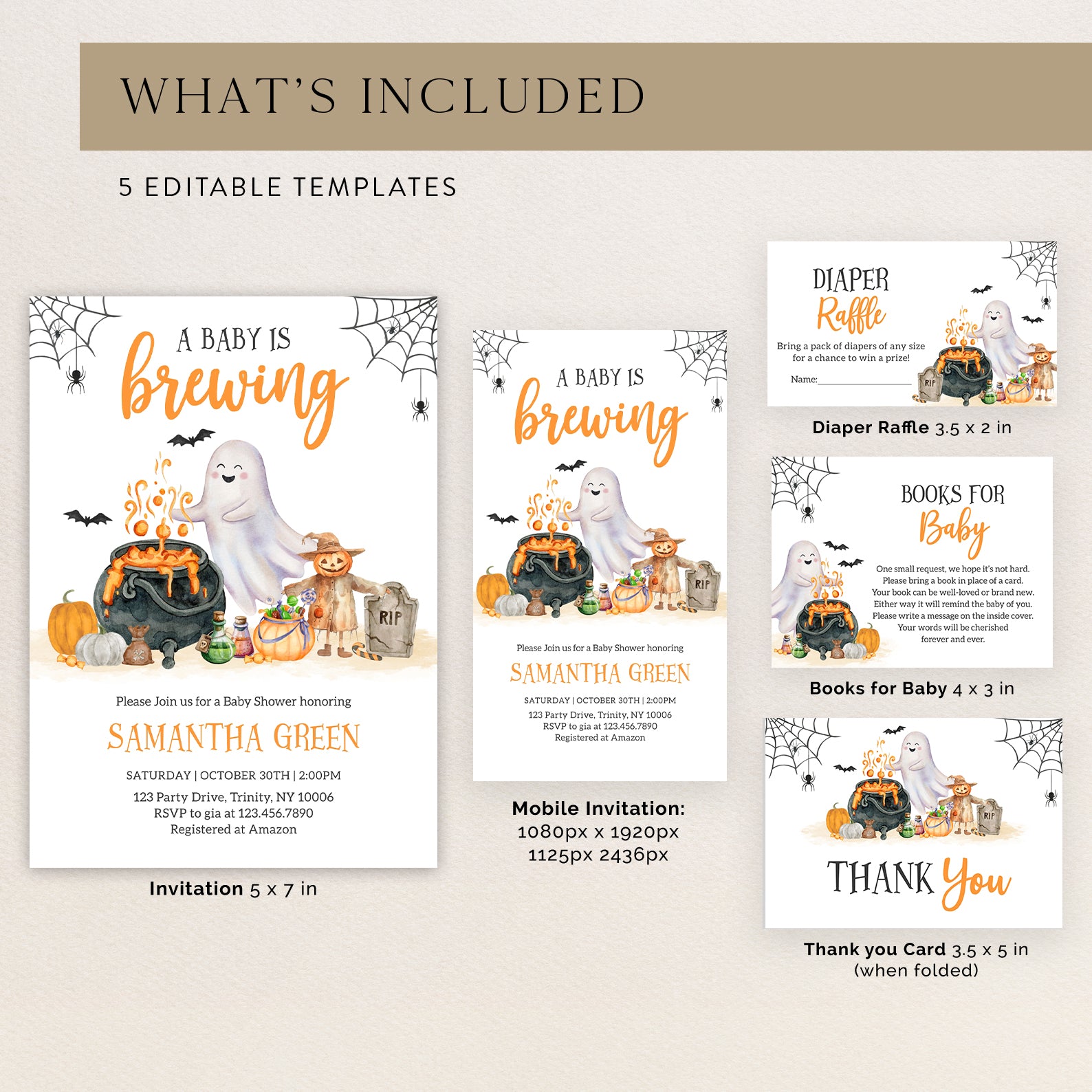 1. Purchase this Halloween Baby Shower Invite Bundle: A Baby Is Brewing, Orange Theme template