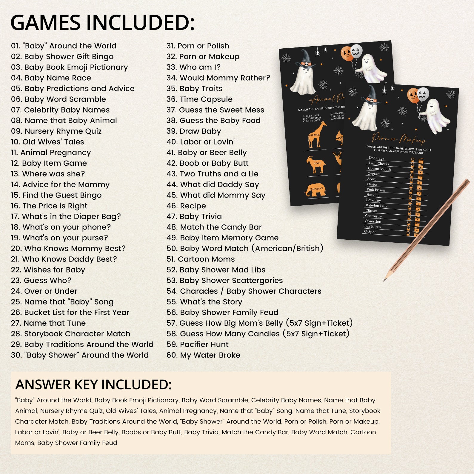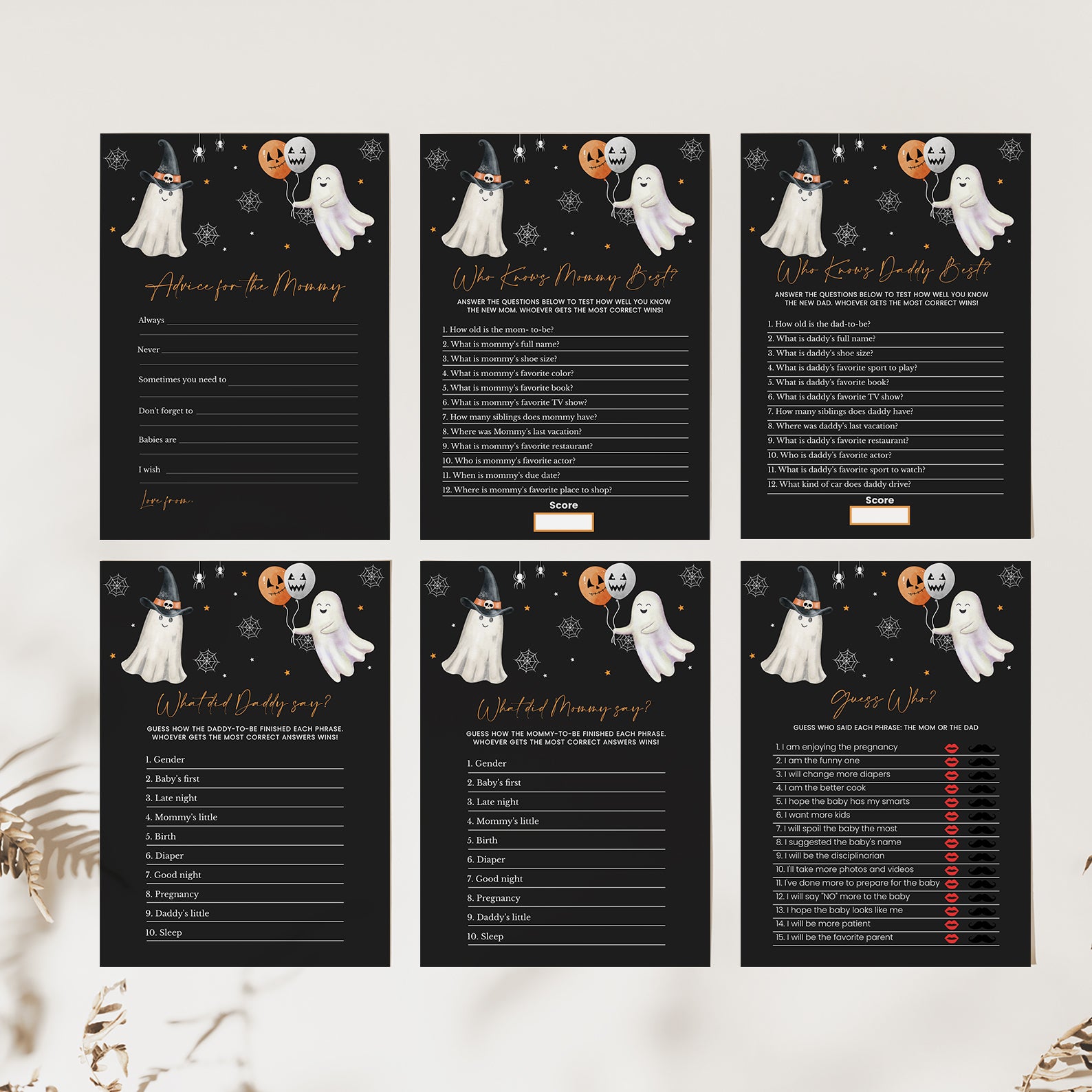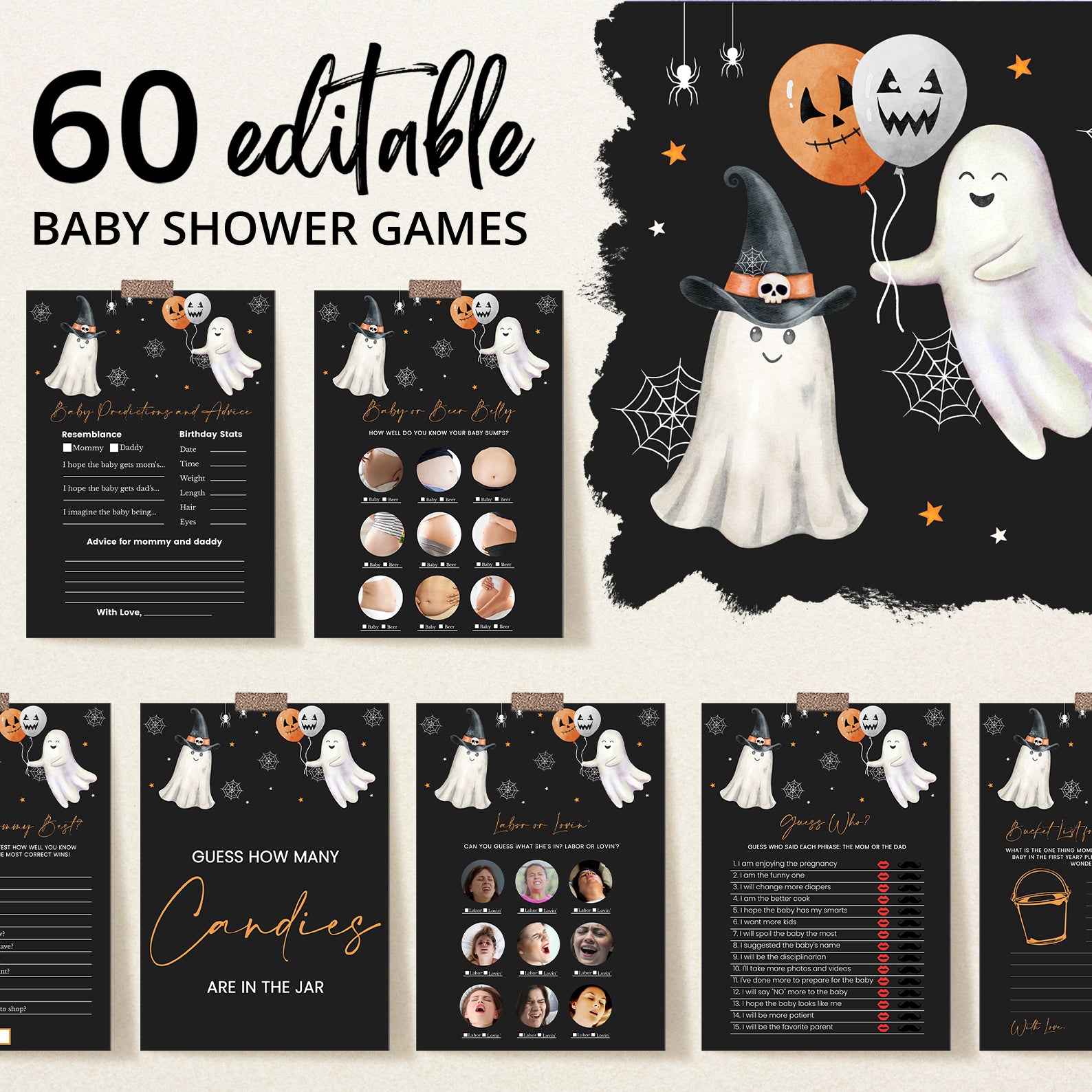 Add some spooky fun to your baby shower with this Halloween-themed game bundle, available in black or white versions! Featuring 60 editable baby shower games, this set is perfect for keeping guests entertained. Decorated with playful ghosts, spider webs, and stars, each game complements your “little boo” theme. From Baby Bingo to Who Knows Mommy Best, this bundle is easy to personalize and makes your celebration extra memorable.