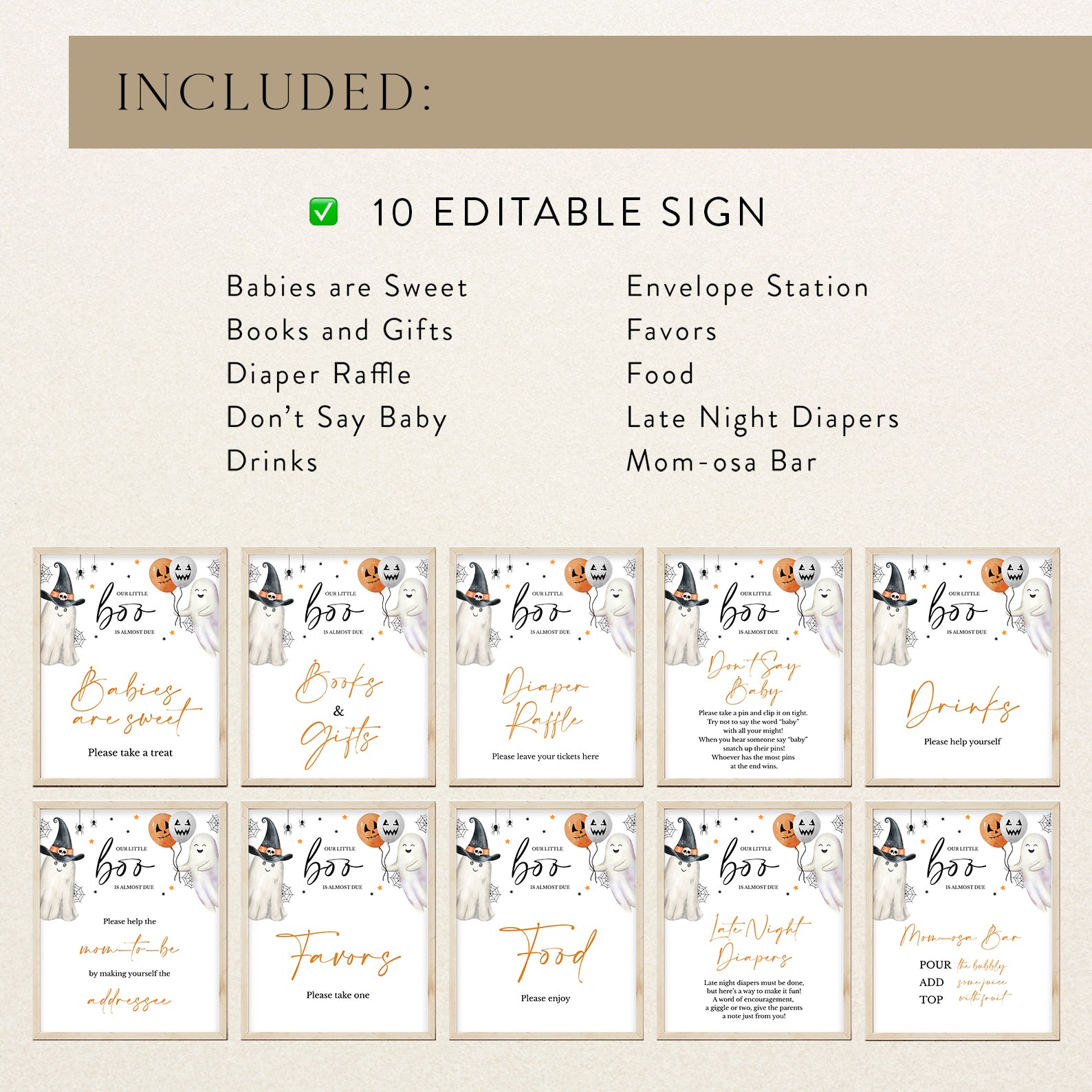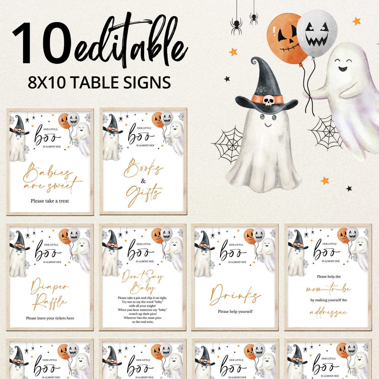 Add a festive Halloween touch to your baby shower with this set of ten editable table signs available in black or white versions! Each design features playful ghosts, twinkling stars, spider webs, and dangling spiders, perfectly capturing a sweet and spooky vibe. With signs like “Babies Are Sweet,” “Mom-osa Bar,” and “Don’t Say Baby,” this set brings both function and charm to your little boo’s celebration.