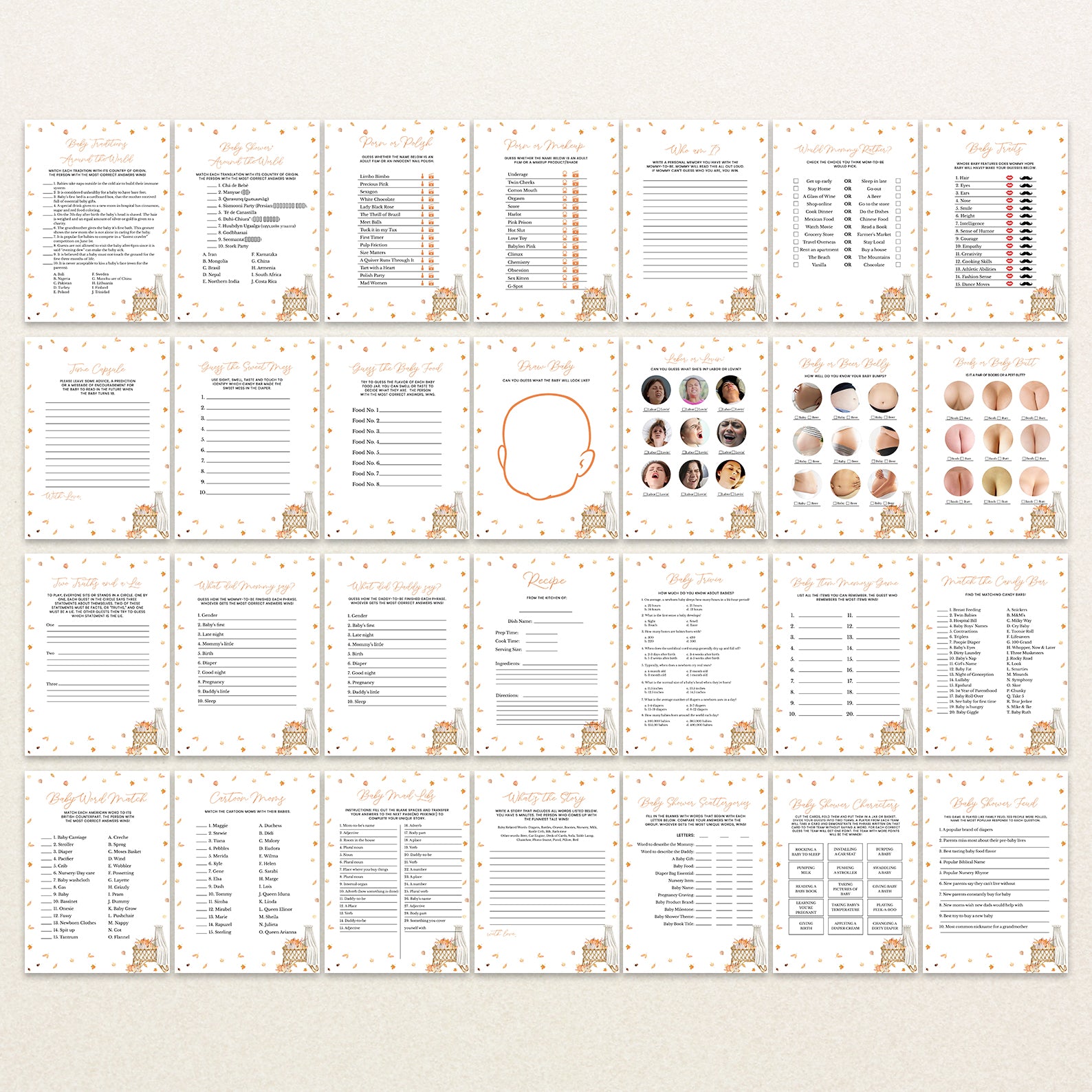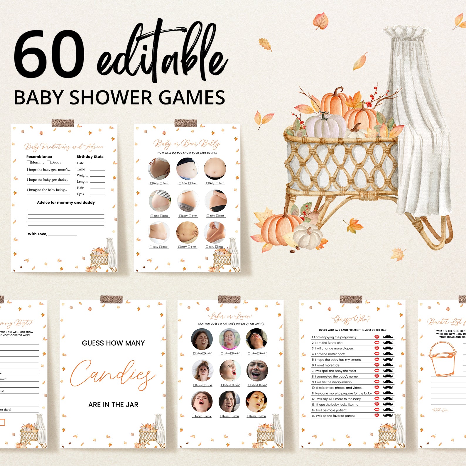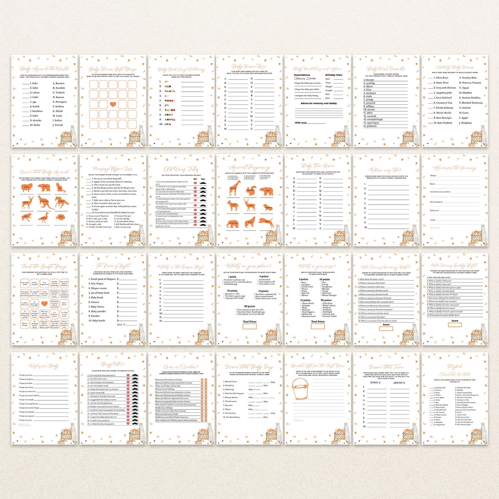 Make your fall baby shower extra fun with this charming bundle of 60 editable baby shower games! Designed to match a cozy autumn theme, each game features soft orange tones, falling leaves, and seasonal flair to complement your celebration. From classic favorites to unique challenges, this collection is perfect for entertaining guests and creating lasting memories. Easy to customize and print, it’s a must-have for your festive gathering!