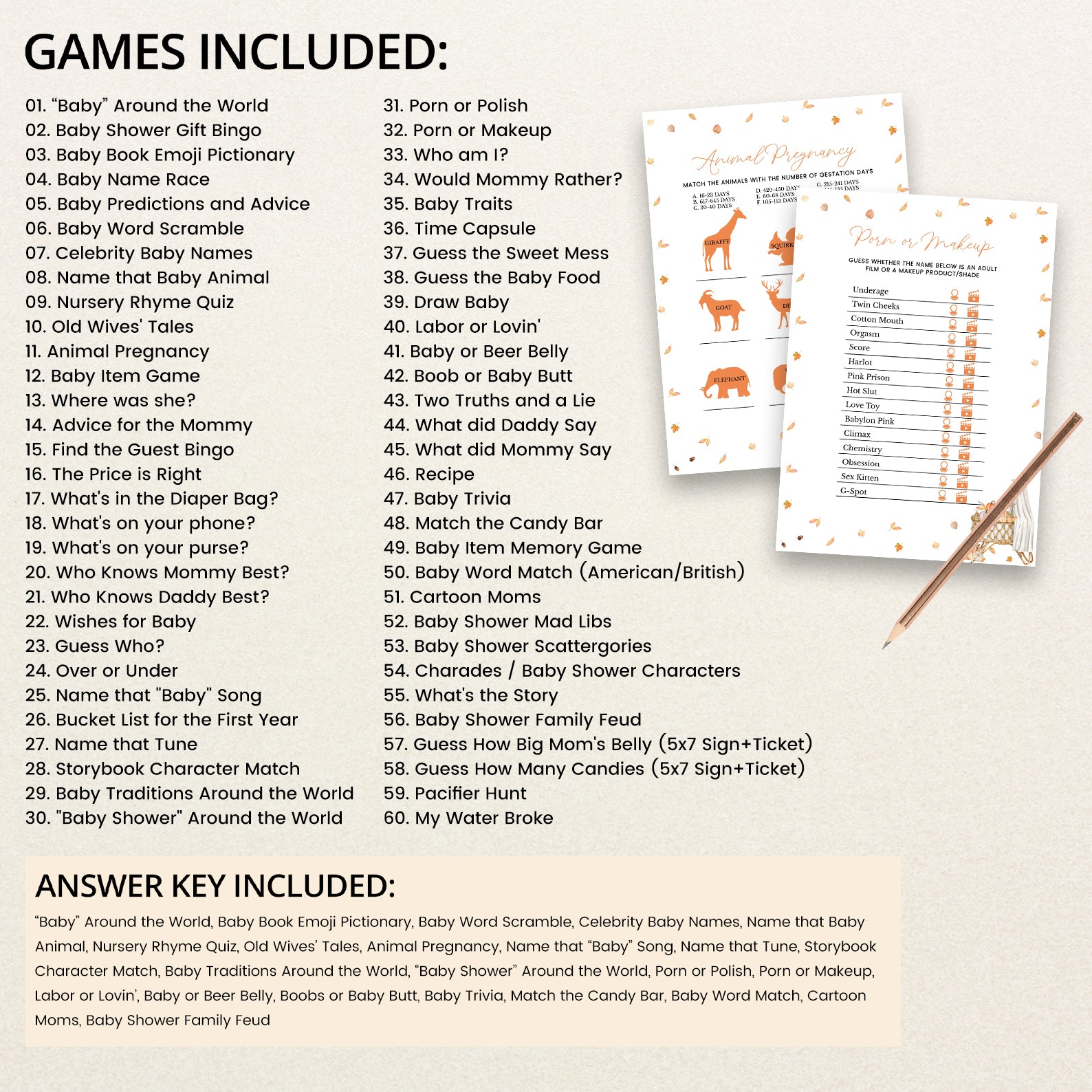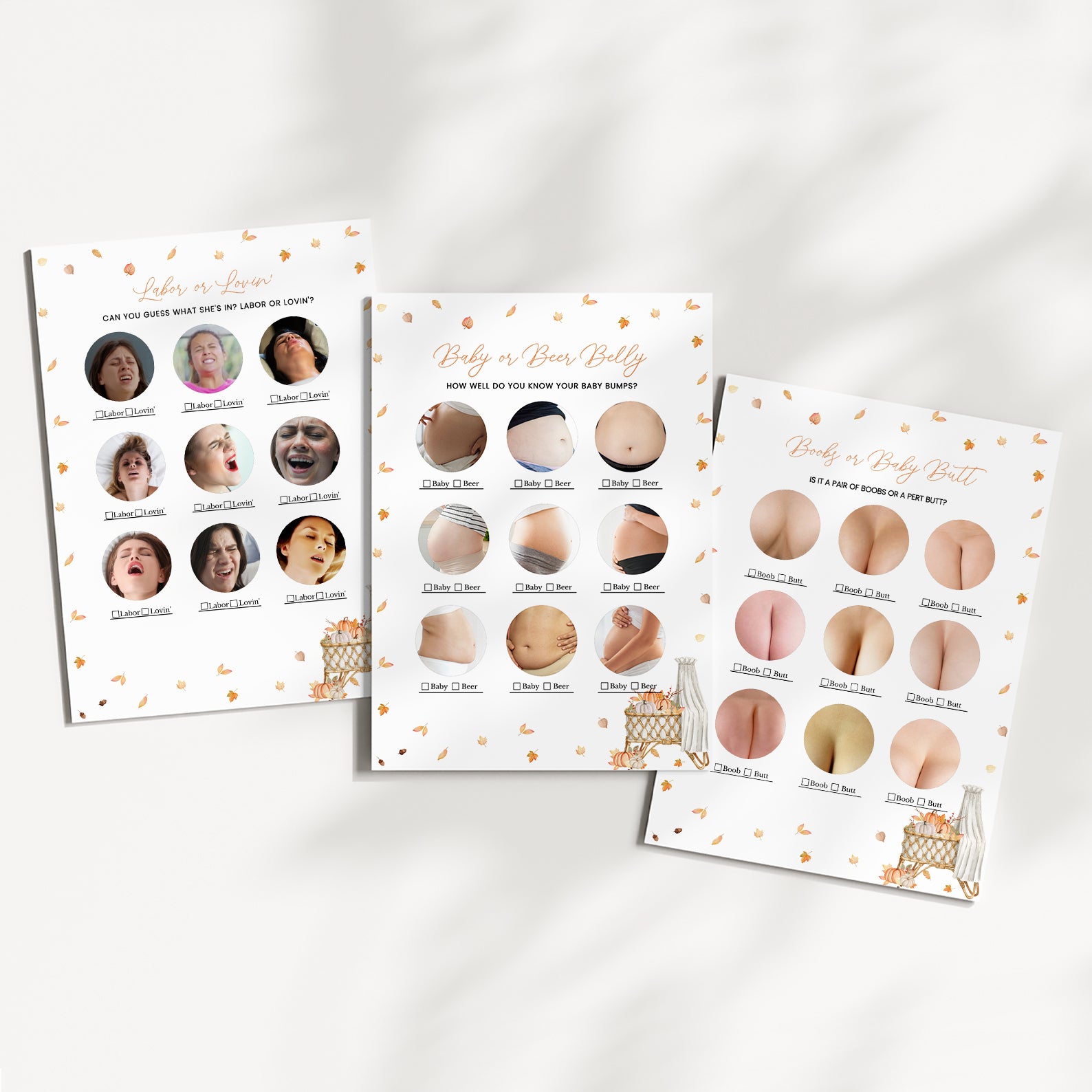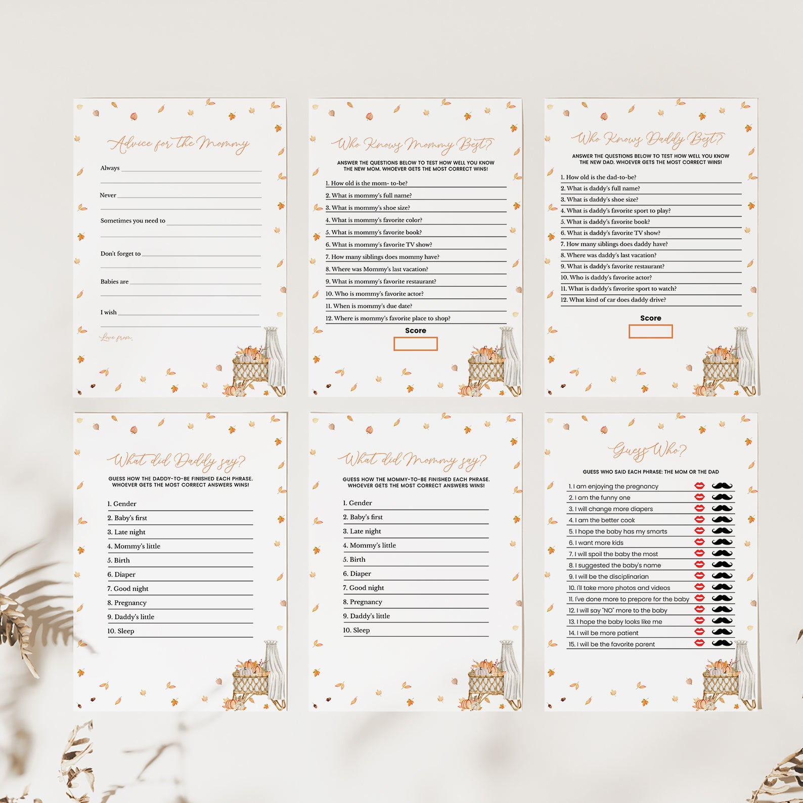 Make your fall baby shower extra fun with this charming bundle of 60 editable baby shower games! Designed to match a cozy autumn theme, each game features soft orange tones, falling leaves, and seasonal flair to complement your celebration. From classic favorites to unique challenges, this collection is perfect for entertaining guests and creating lasting memories. Easy to customize and print, it’s a must-have for your festive gathering!