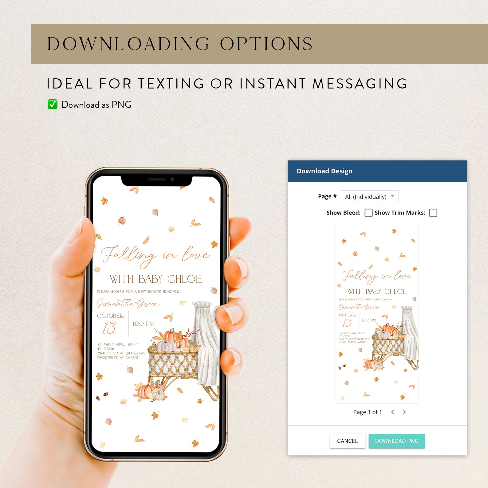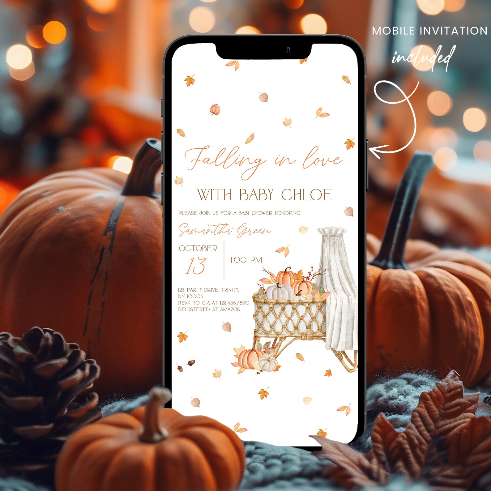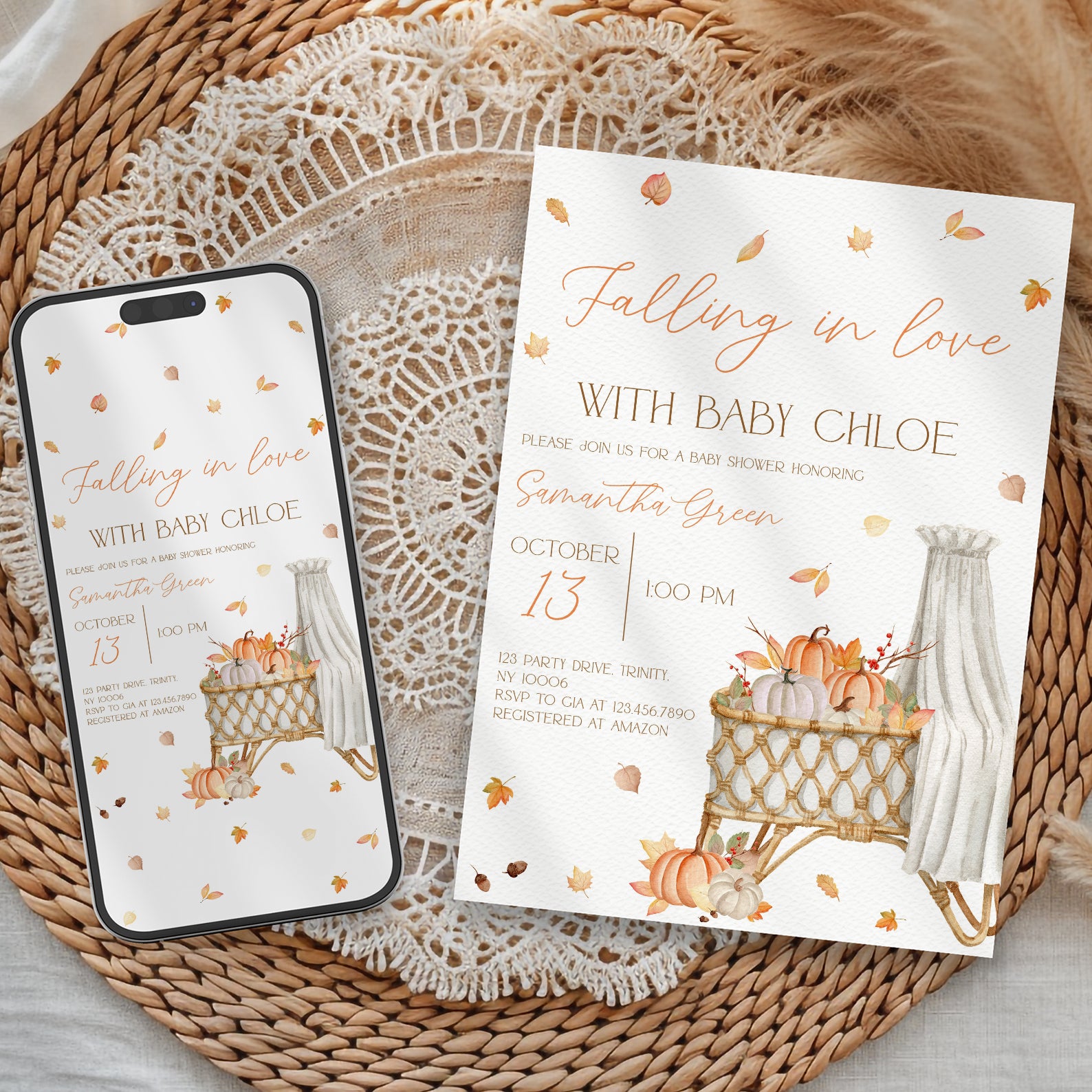 Celebrate the arrival of your little pumpkin with our enchanting Fall Baby Shower Digital Invitation! Featuring a charming orange theme adorned with falling leaves, this invitation showcases a delightful baby crib filled with pumpkins and draped in a whimsical princess canopy curtain. Perfect for setting the tone for a cozy autumn gathering, this digital invite is easy to customize and share, ensuring your loved ones are ready to fall in love with your upcoming celebration. Make your baby shower unforgettable with this beautifully designed invitation that captures the essence of the season!