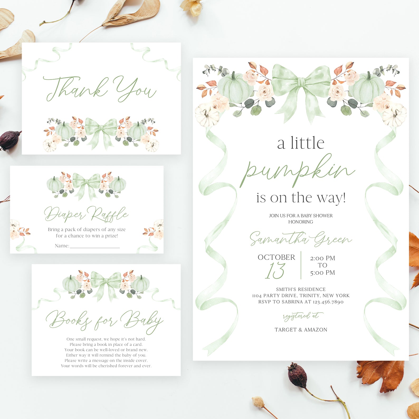 Fall Baby Shower Invite Bundle: Green Ribbon Frame with Pumpkin & Florals