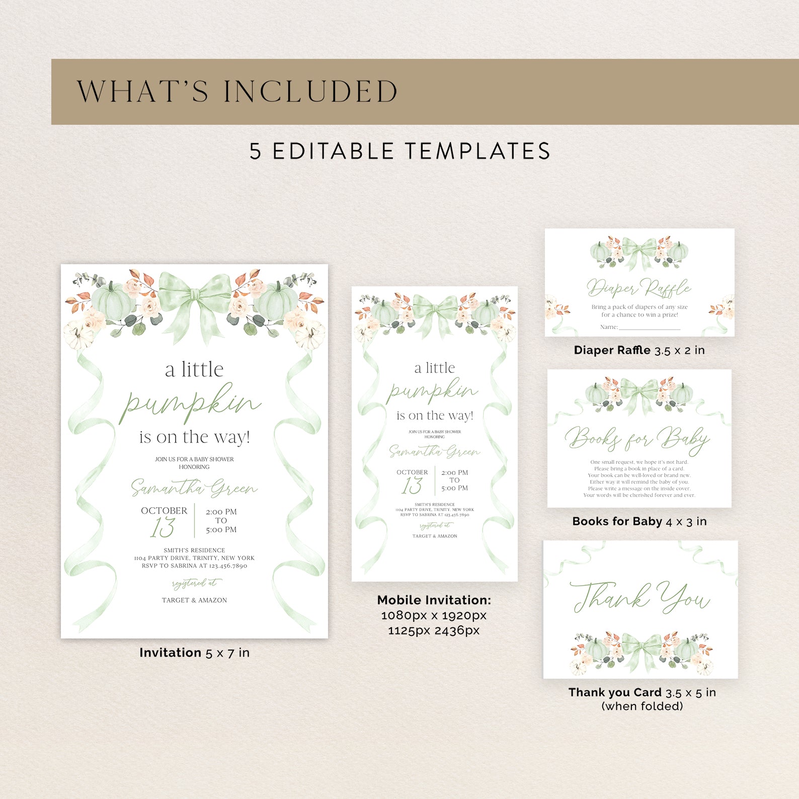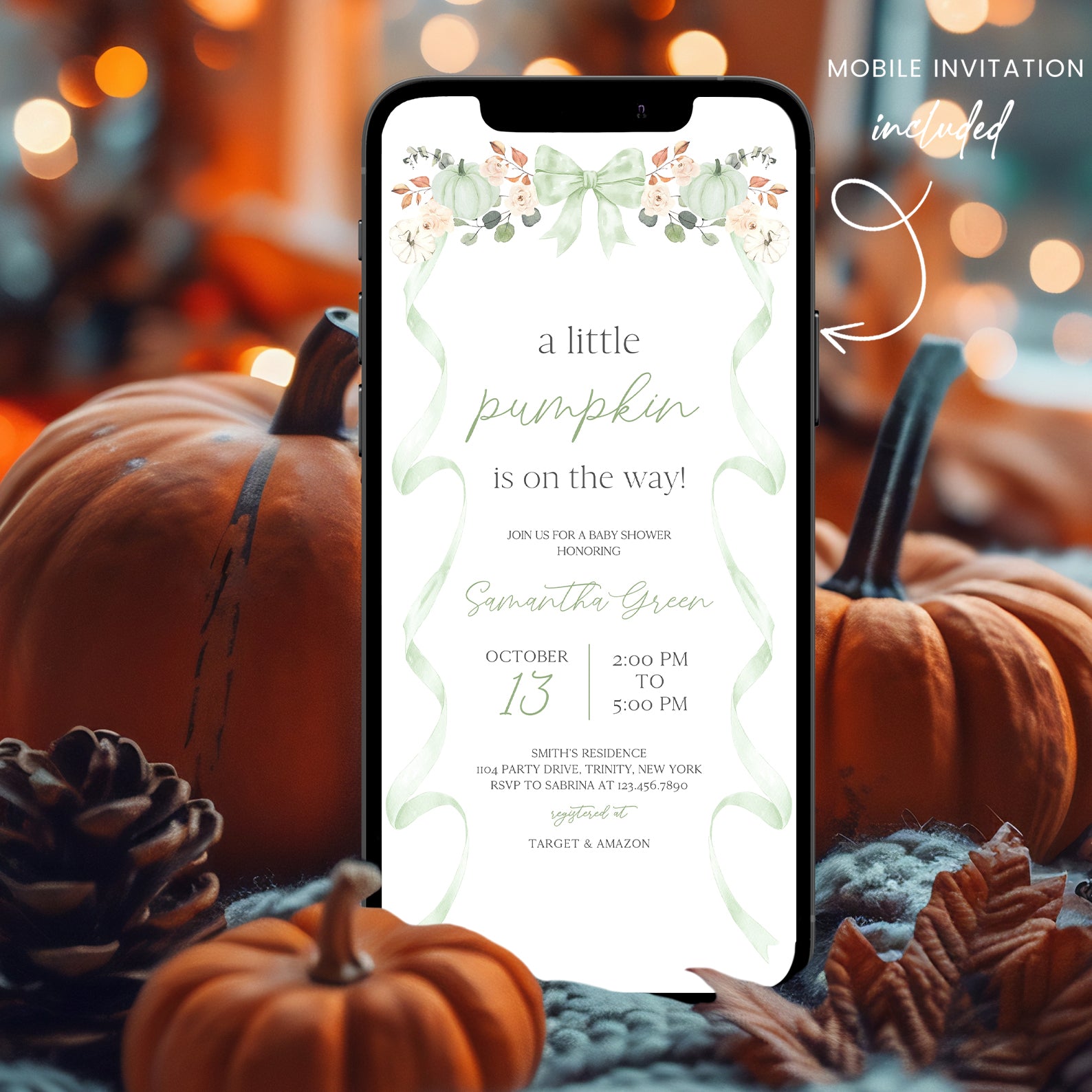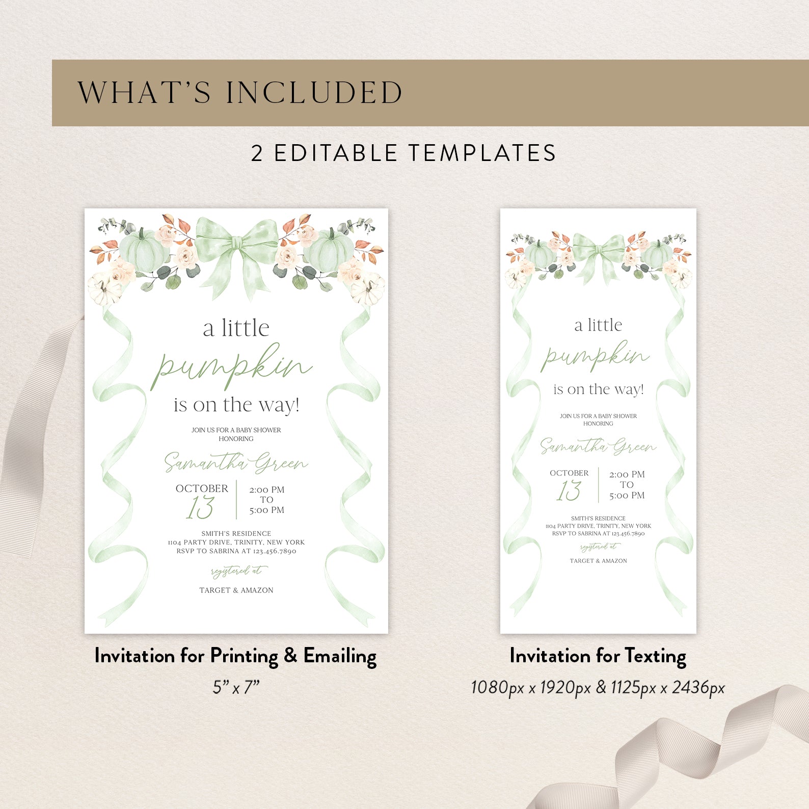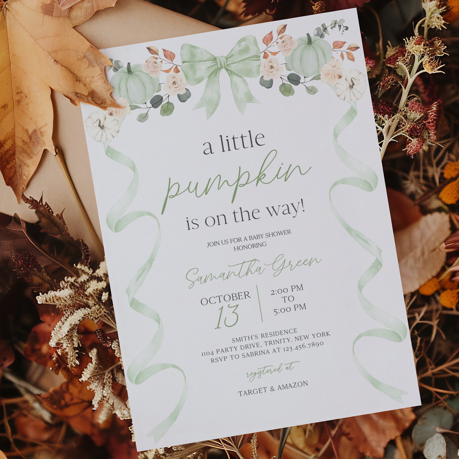 - Purchase this Fall Baby Shower Invite Bundle: Green Ribbon Frame with Pumpkin & Florals template