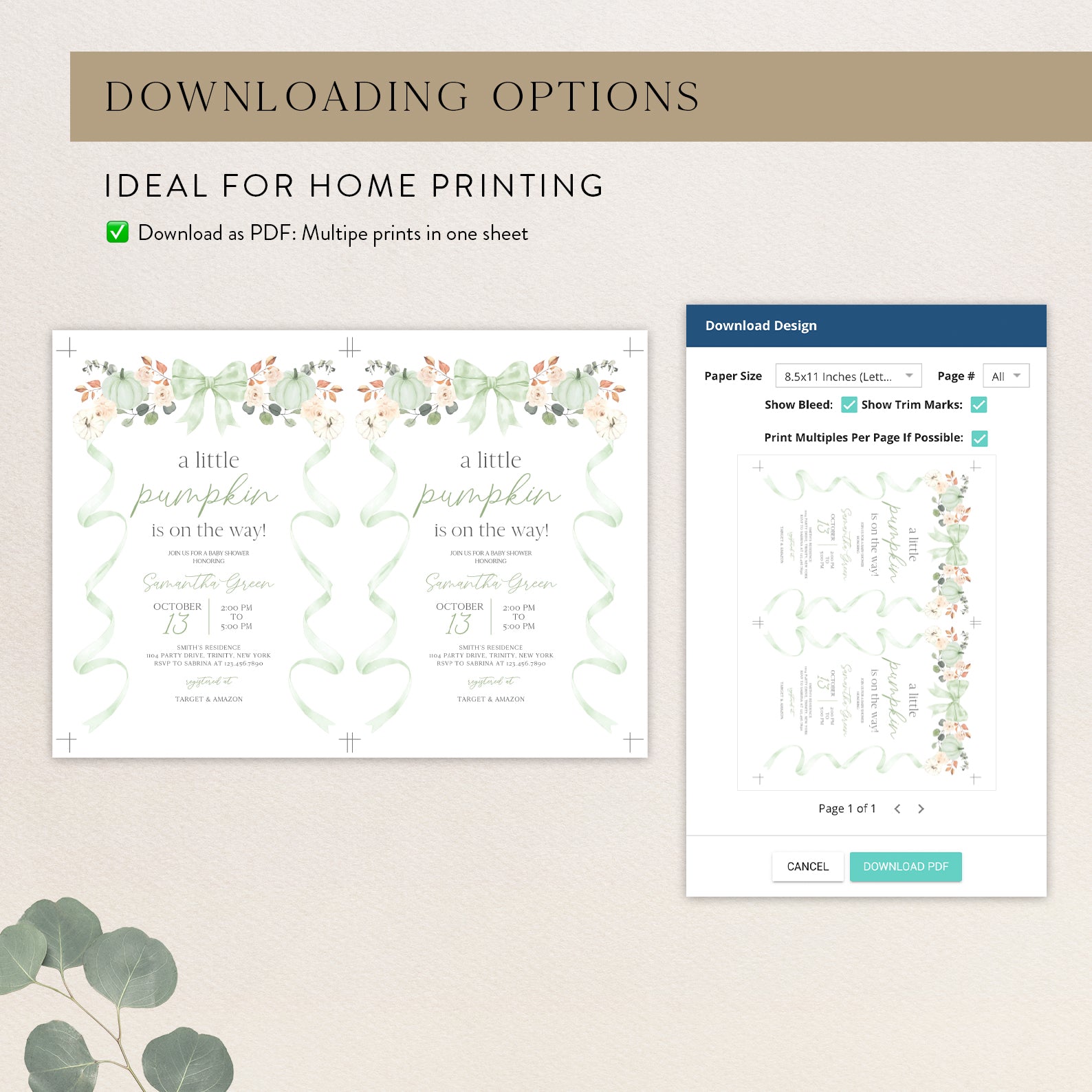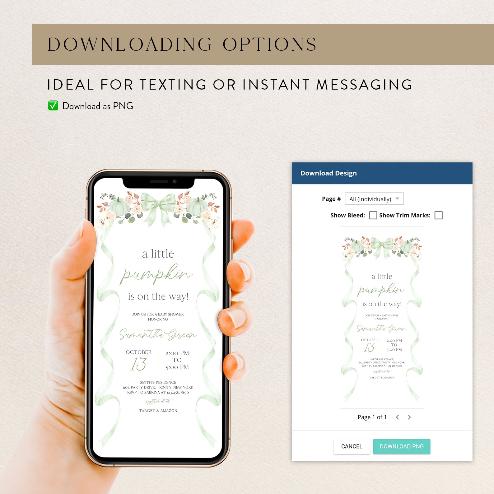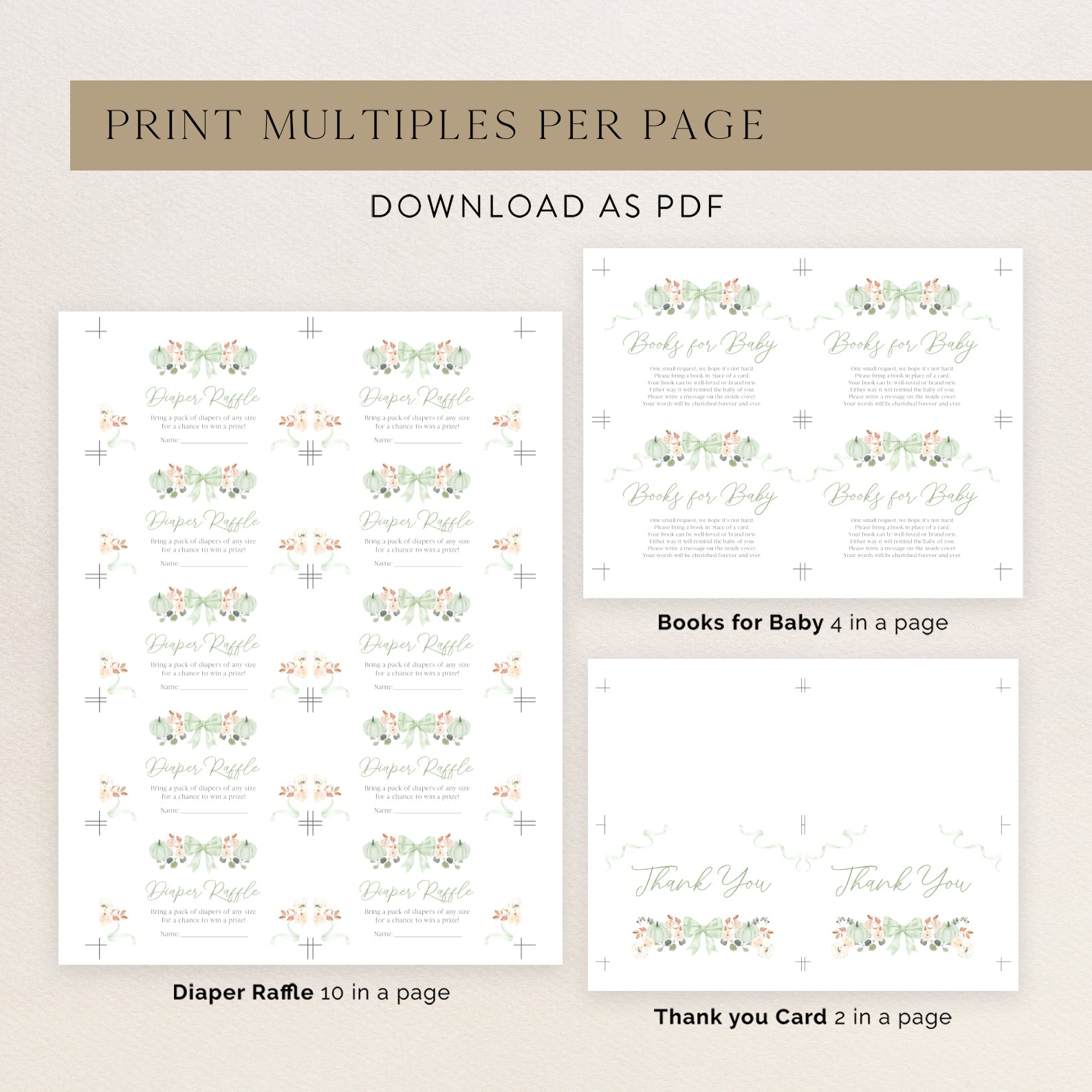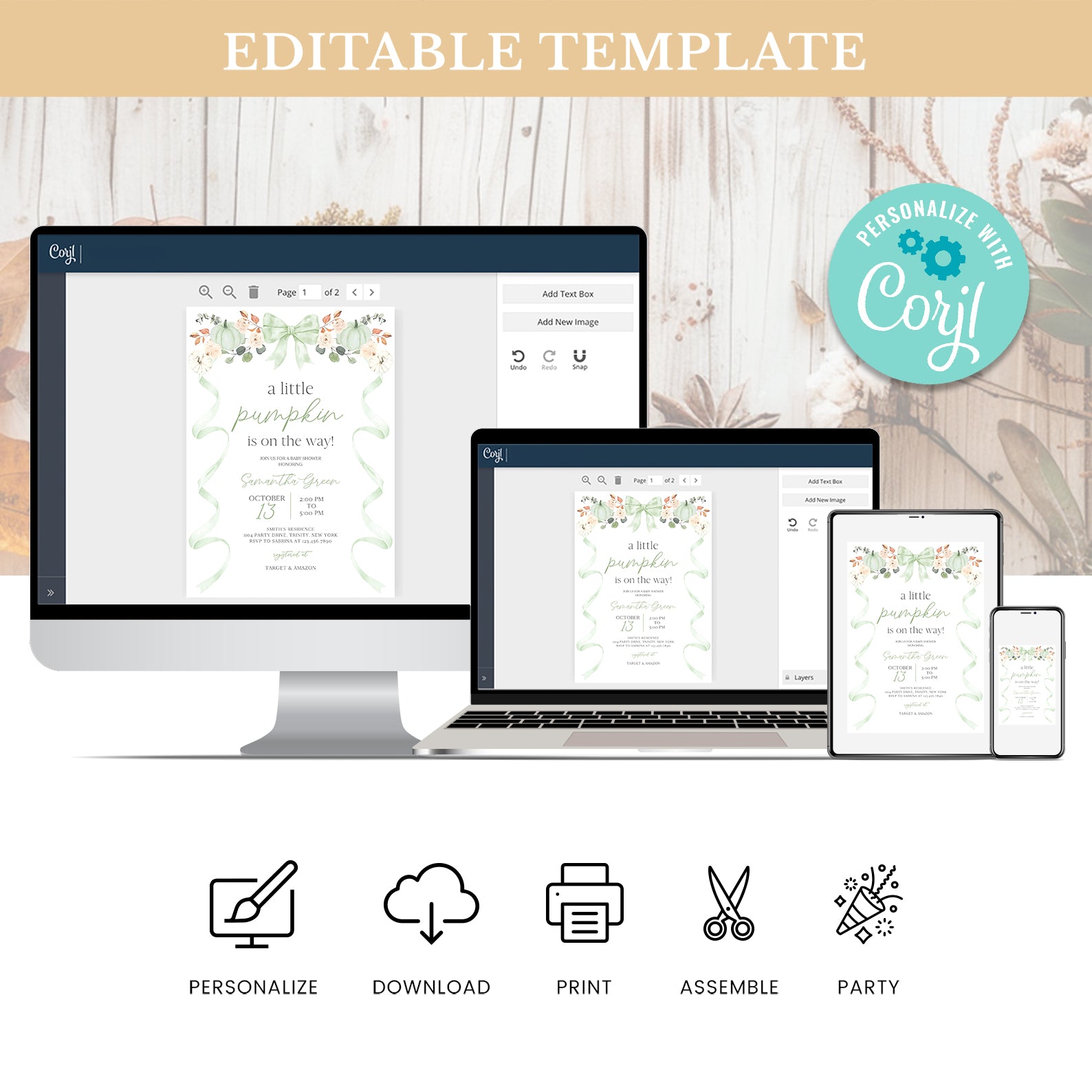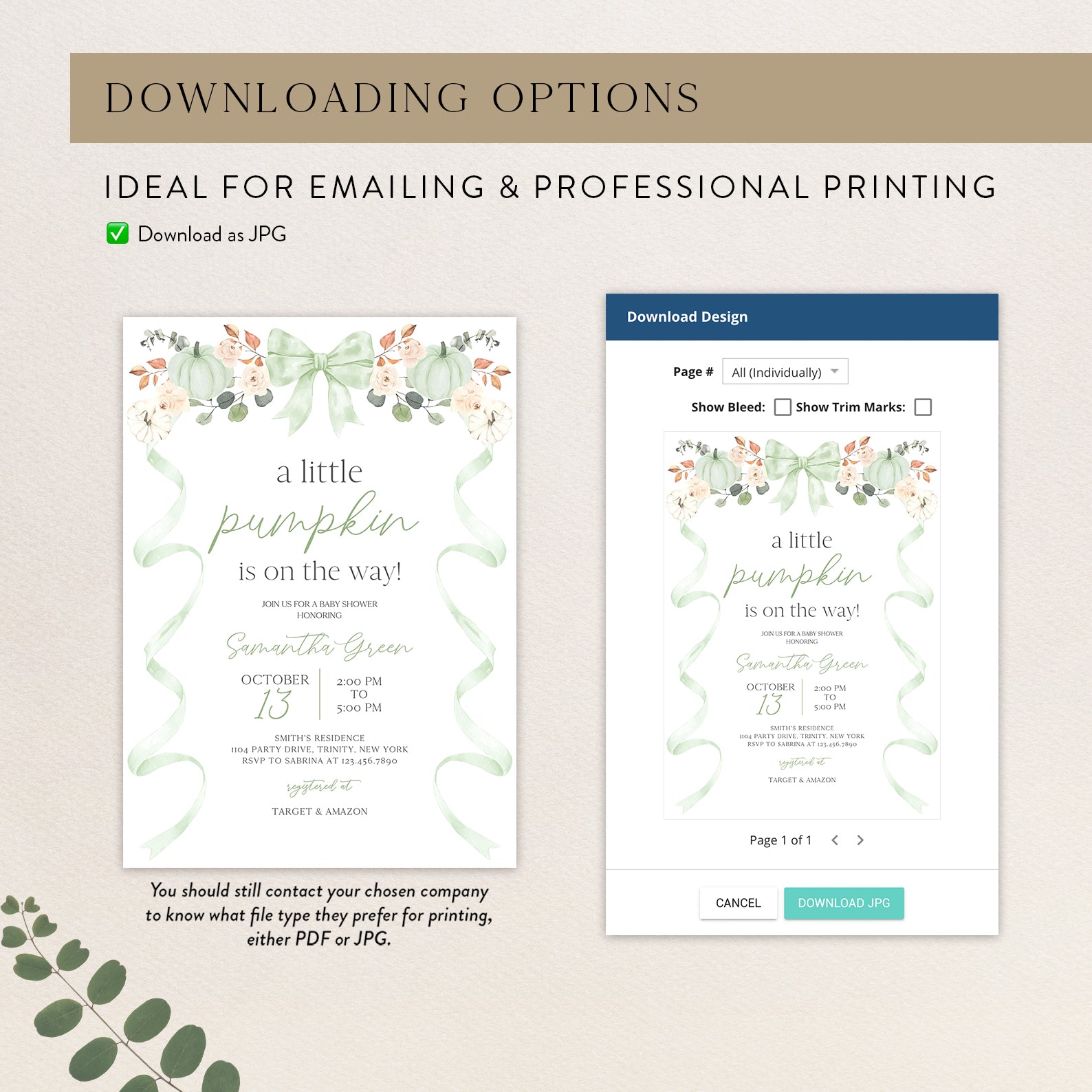 - Purchase this Fall Baby Shower Invite Bundle: Green Ribbon Frame with Pumpkin & Florals template