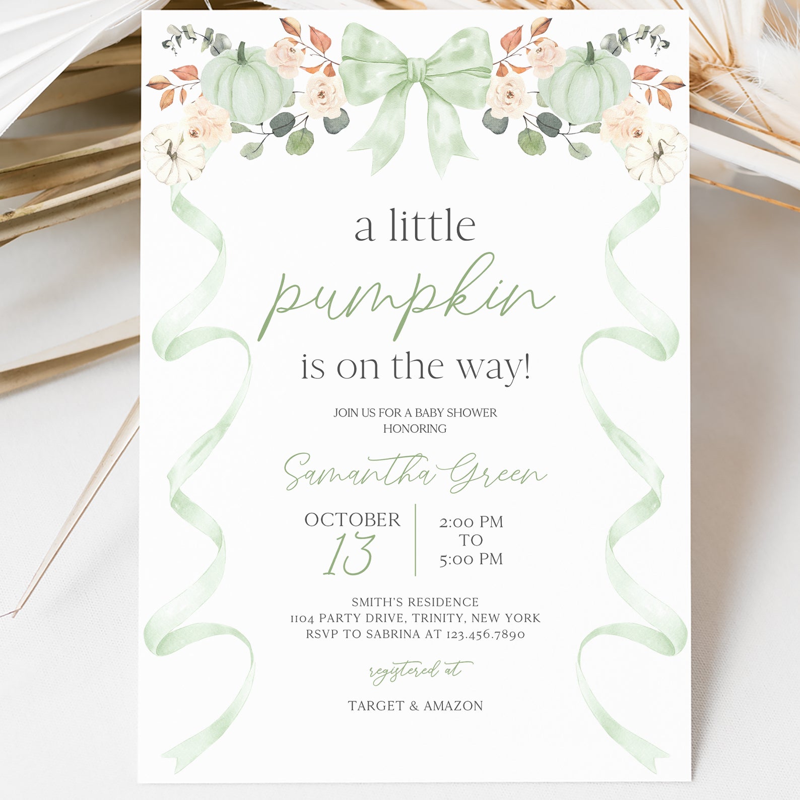 - Purchase this Fall Baby Shower Invite: Green Ribbon Frame with Pumpkin & Florals template