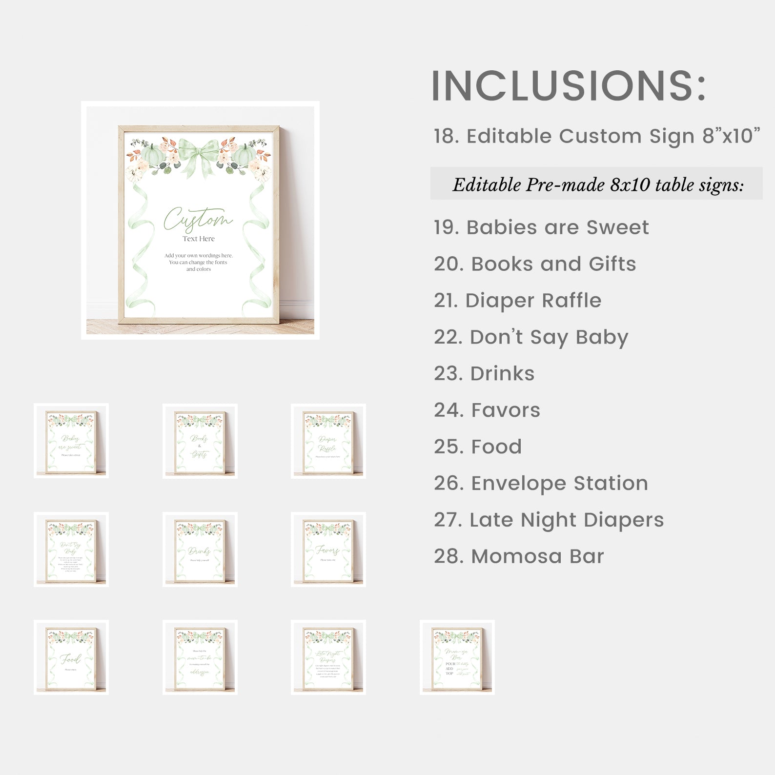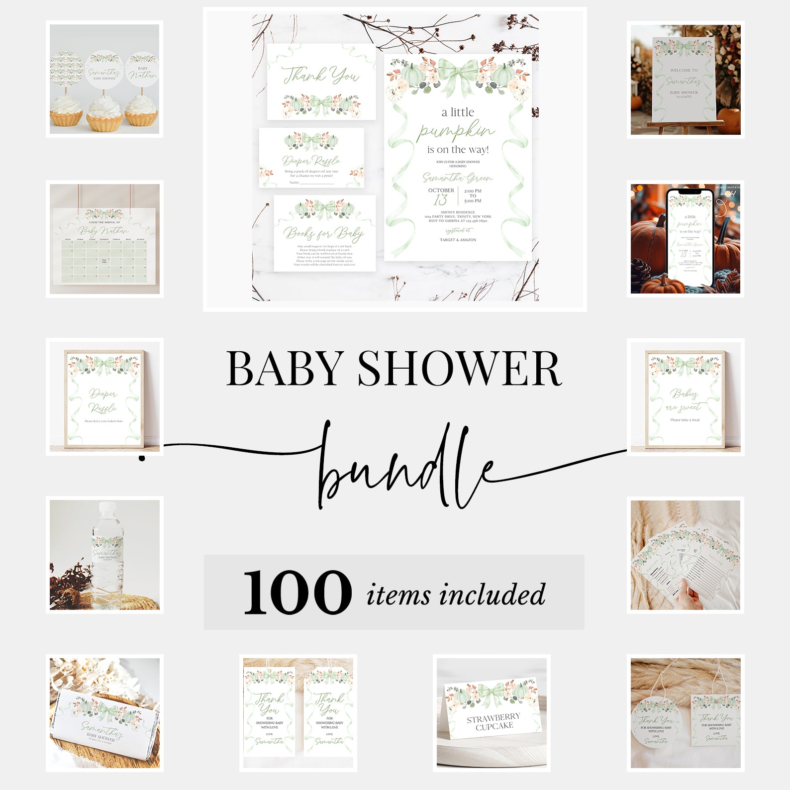 Celebrate your little pumpkin in style with this all-in-one Fall Baby Shower Mega Bundle! Featuring 100 editable items including invitations (with mobile version and backside), diaper raffle, books for baby, thank you card, welcome sign, table signs, favor tags, labels, toppers, wrappers, and 60+ games. Each design showcases a wavy ribbon border and pumpkin with floral accents in your choice of green, orange, pink, or blue. A charming and cohesive setup made easy!