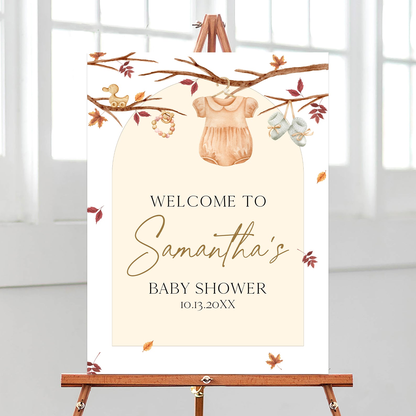 Greet guests in autumn style with this cozy fall baby shower welcome sign! Featuring a soft orange arch on a crisp white background, it’s adorned with whimsical fall tree branches, a hanging orange baby dress, teether beads, a wood duck push toy, and baby shoes tied with orange ribbon. Falling autumn leaves complete the look, making it a charming way to set the tone for your heartwarming celebration.