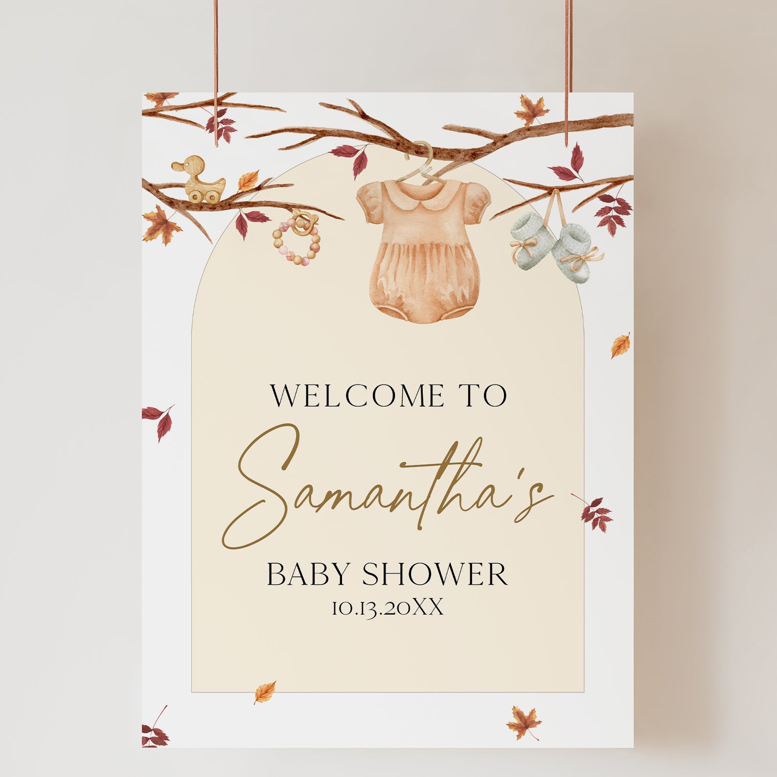 1. Purchase this Fall Baby Shower Welcome Sign: Orange Baby Dress & Leaves template
