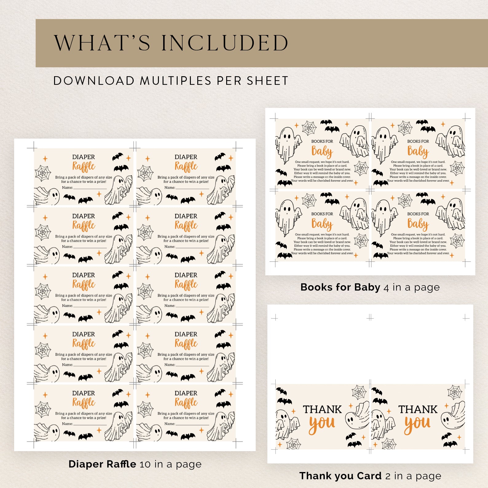 Celebrate your little boo with this charming Halloween-themed baby shower invitation bundle! Designed with flying ghosts, bats, spider webs, and stars, this spooky-sweet set includes a printable and mobile invitation, diaper raffle card, books for baby insert, and thank you card. With its playful design and easy-to-edit format, it’s the perfect way to kick off a memorable baby shower full of fun, fright, and fall magic.