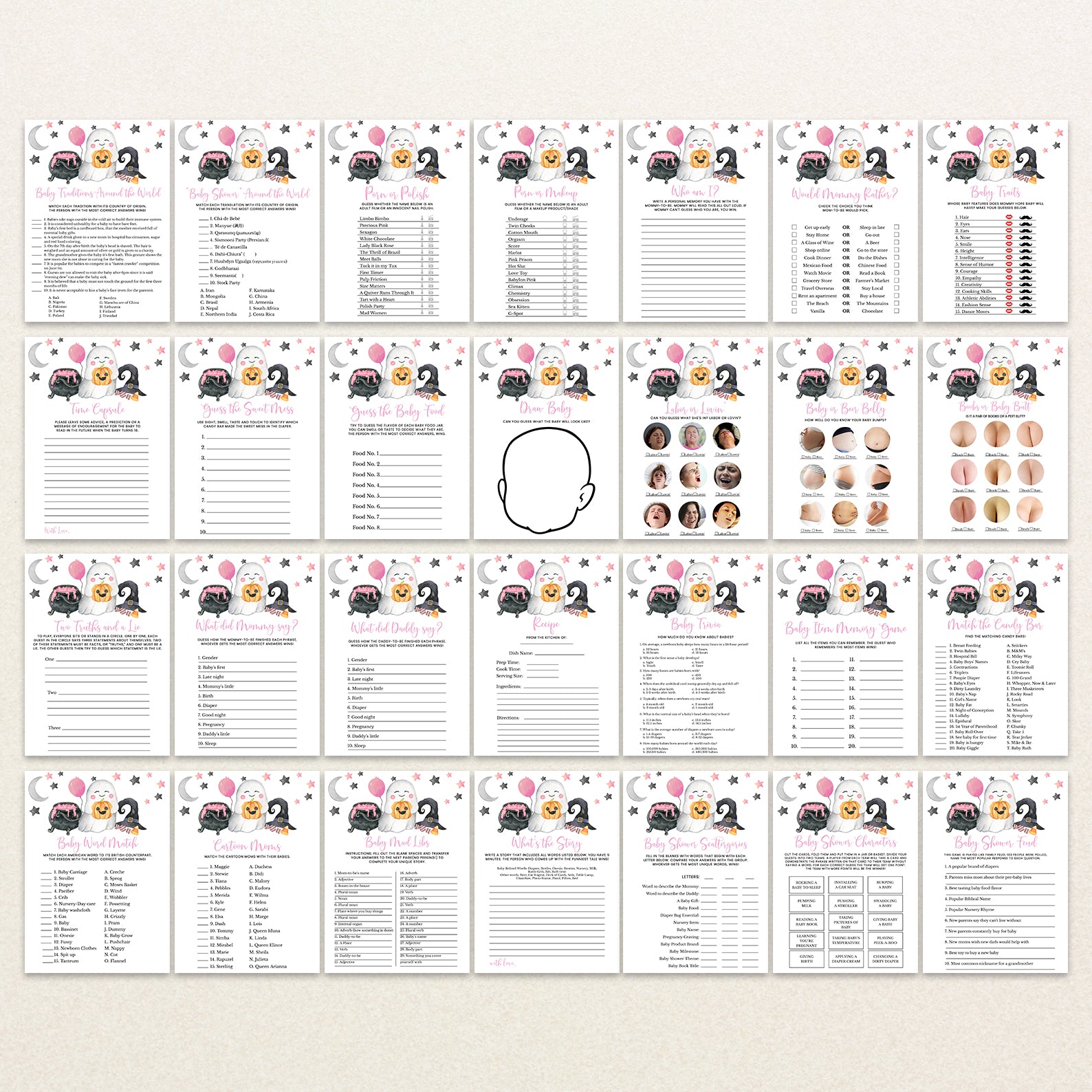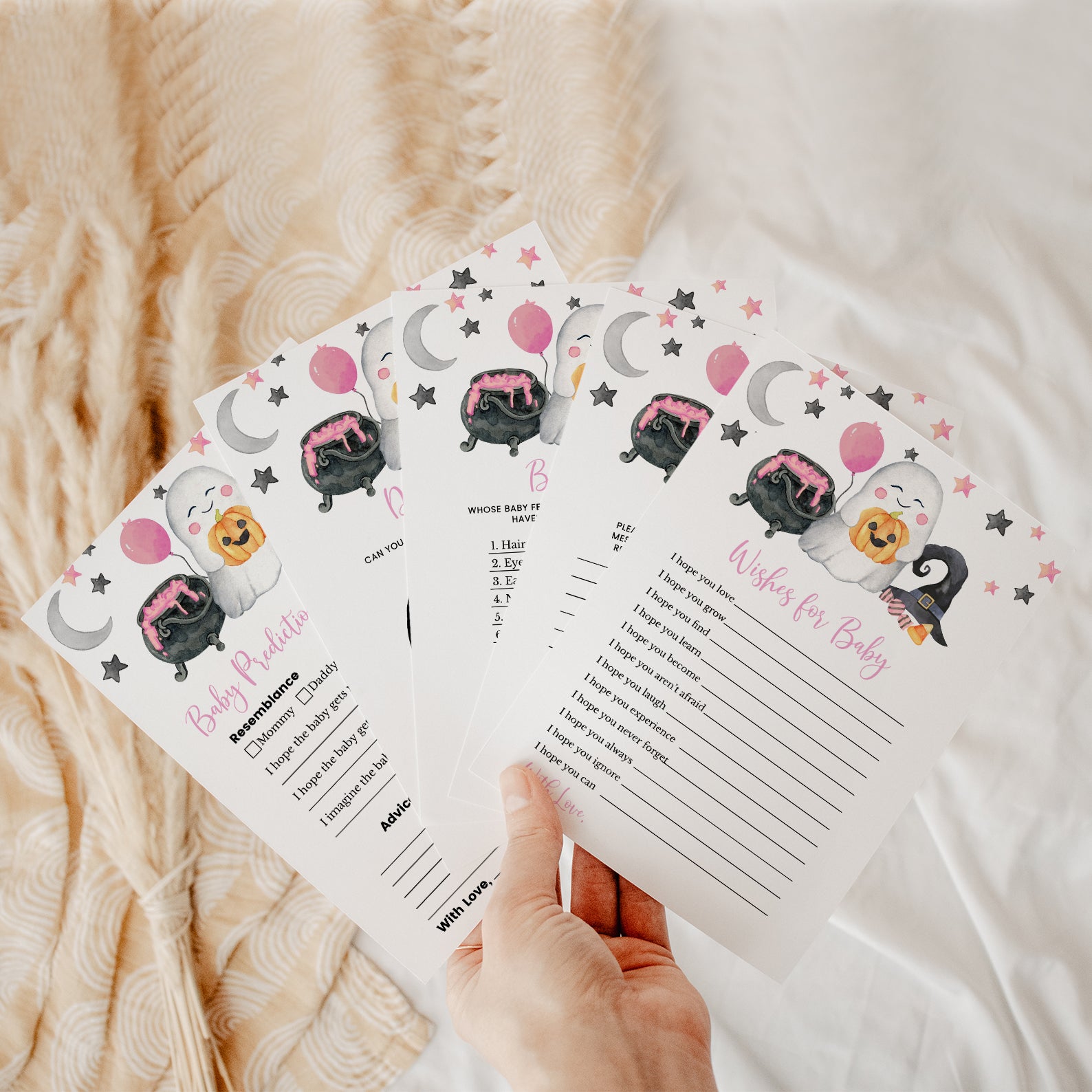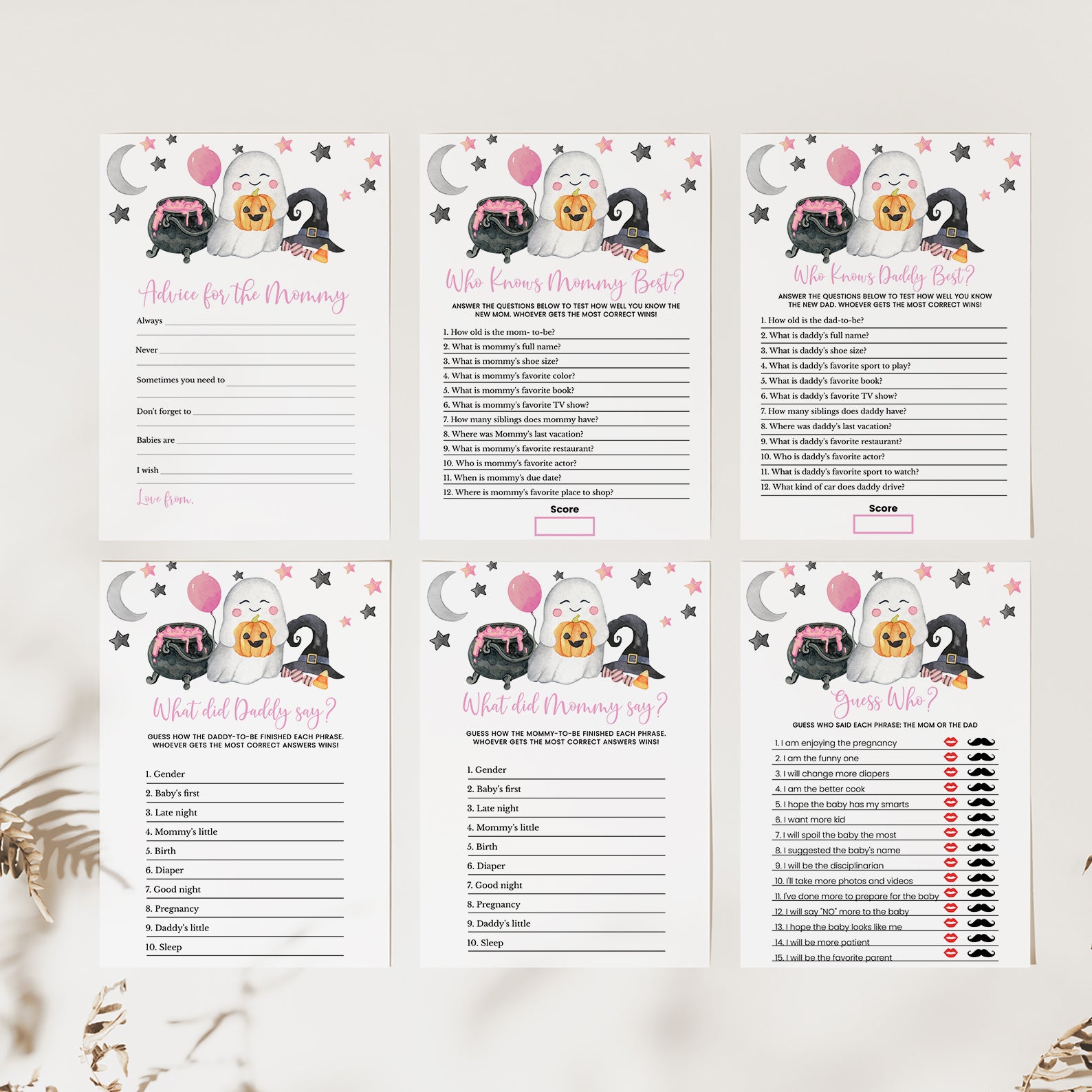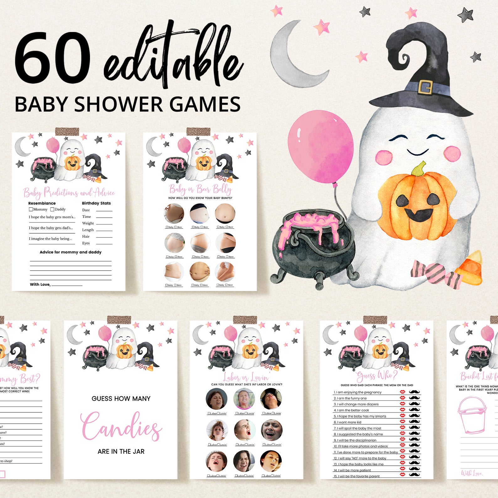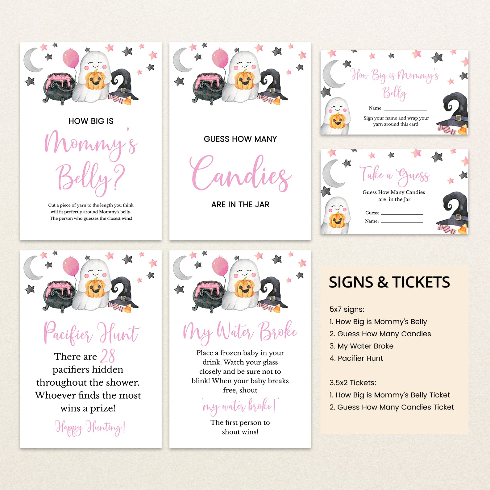 - Purchase this Halloween Pink Baby Shower Game Bundle: Charming Smiling Ghost Design template