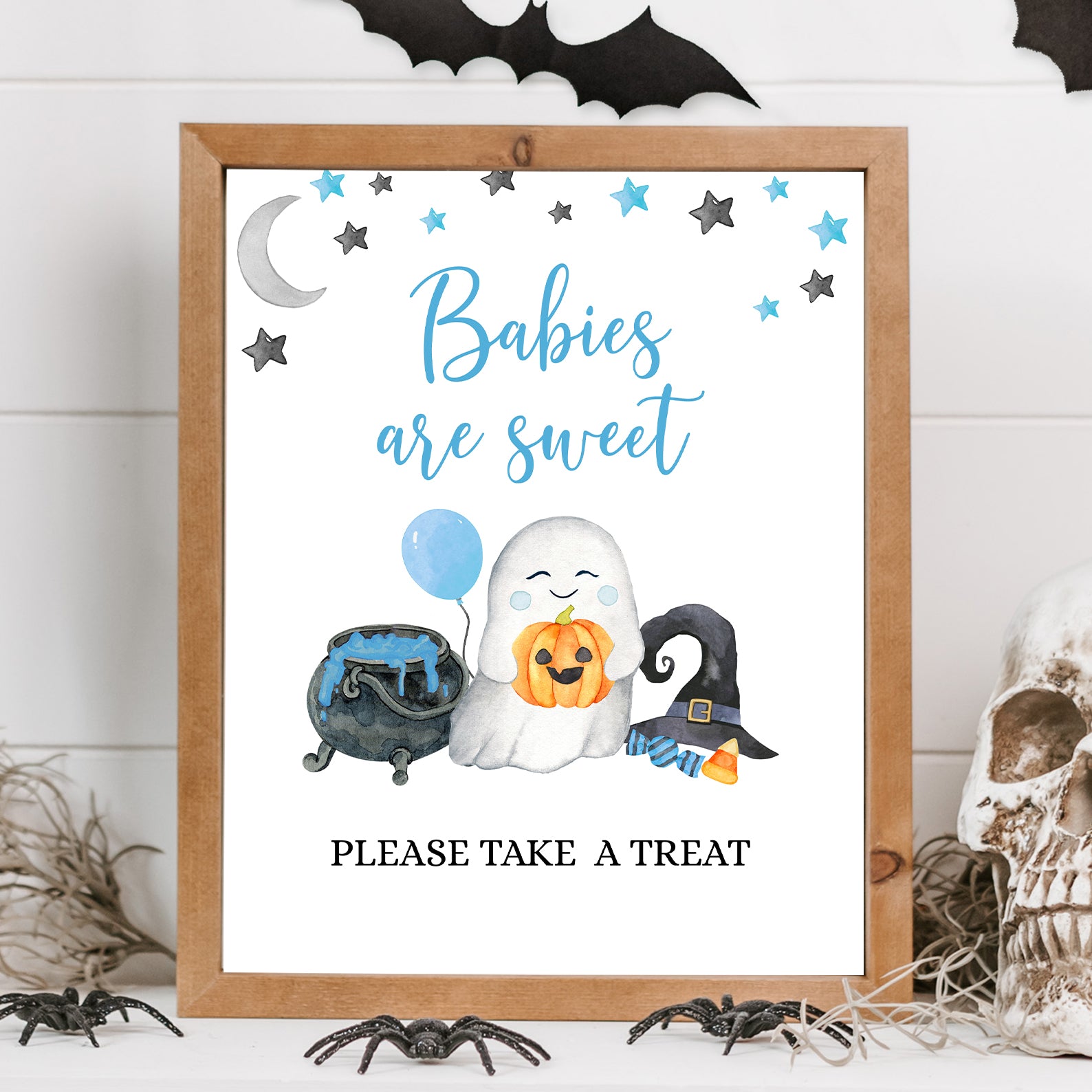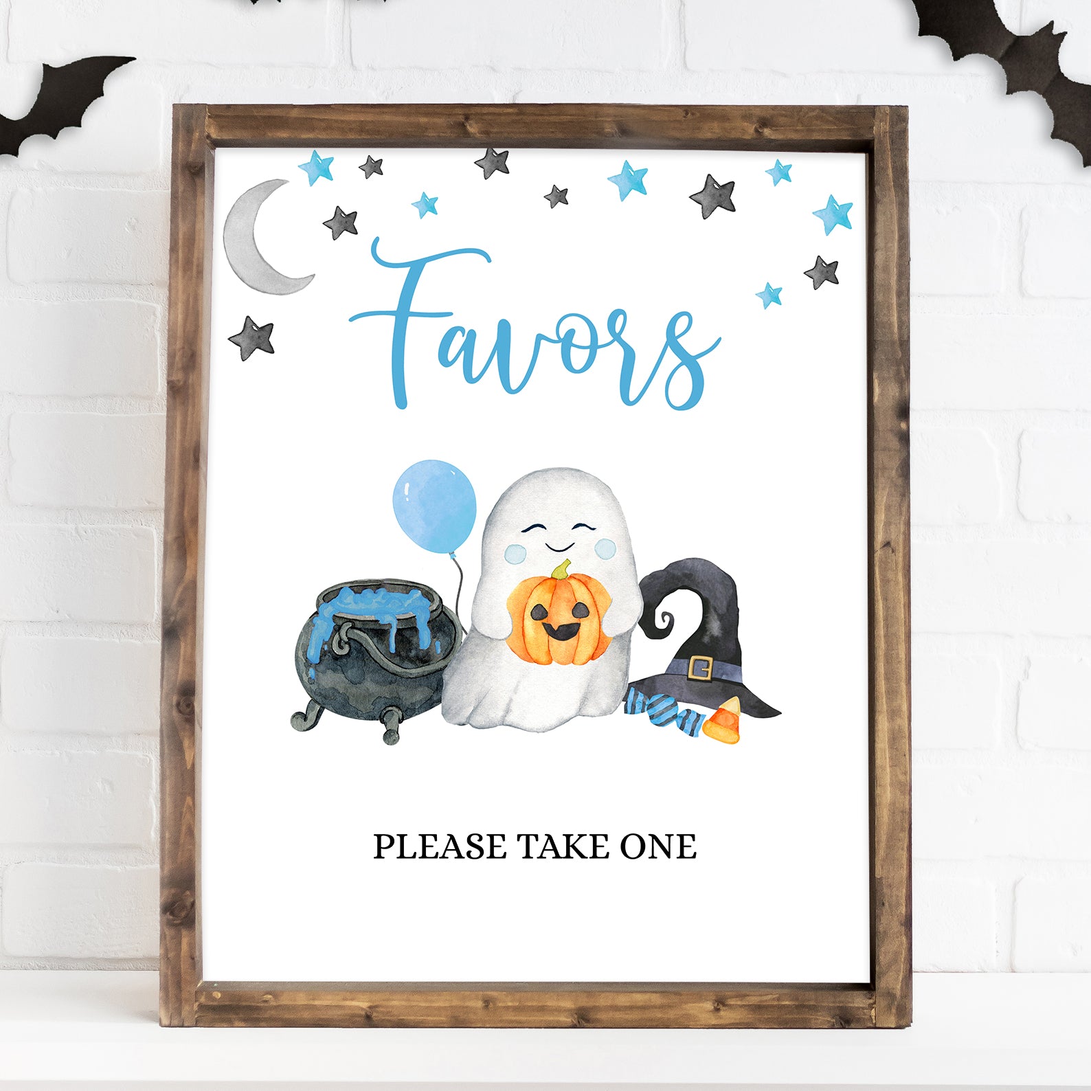 Halloween Blue Baby Shower Table Sign: Charming Smiling Ghost Design