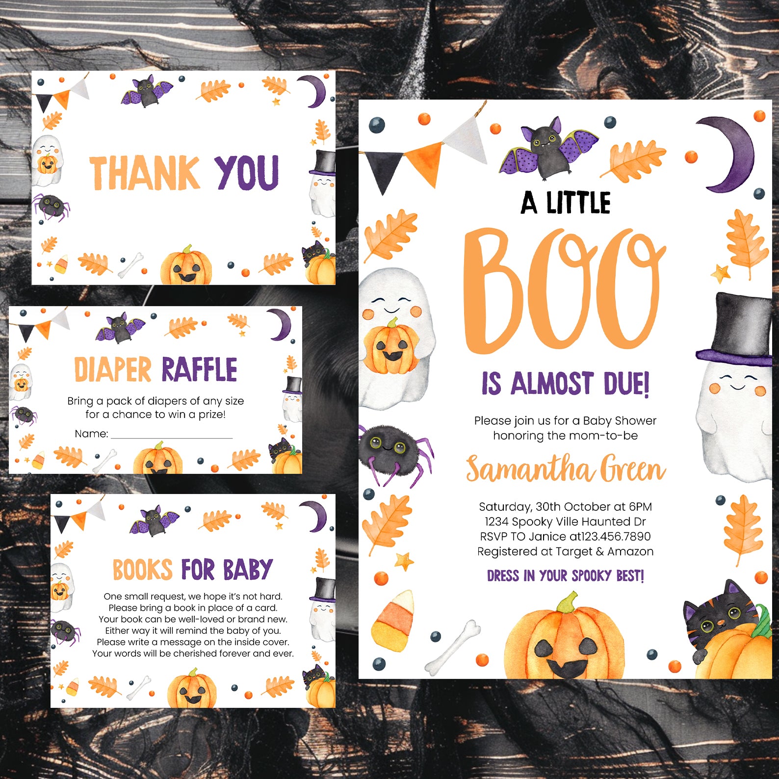 Get ready for a spooktacular baby shower with our "Almost Due" invitation bundle! Featuring a charming ghost with a pumpkin and a magician ghost, along with bats, autumn leaves, bubbles, and a peeking cat, this design in orange and purple sets the perfect Halloween-themed tone. This bundle includes an invitation, mobile invite, diaper raffle, books for baby, and thank you card, making it a complete package for a boo-tiful celebration!