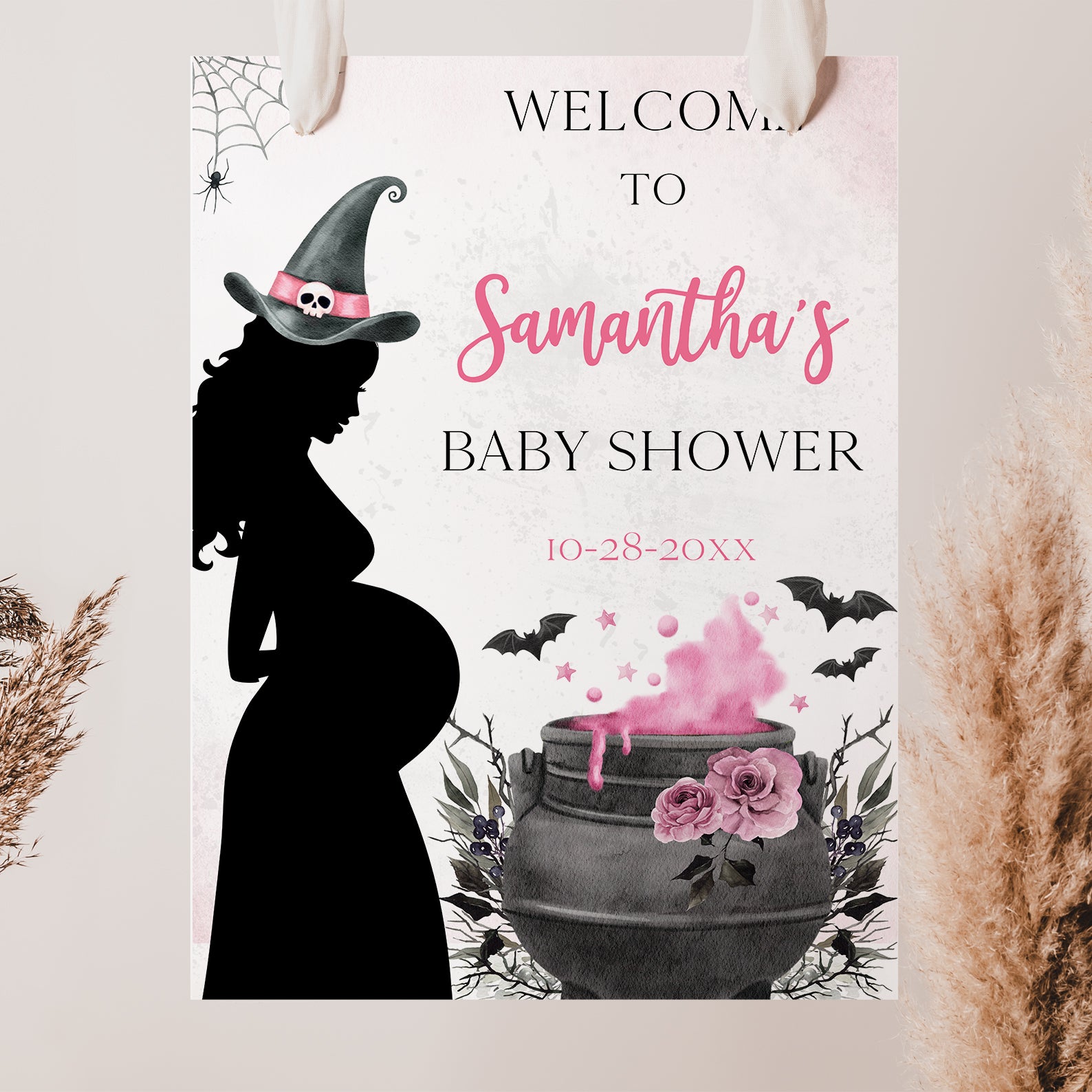- Purchase this Spellbinding Pink Baby Shower Welcome Sign: Pregnant Witch & Cauldron template