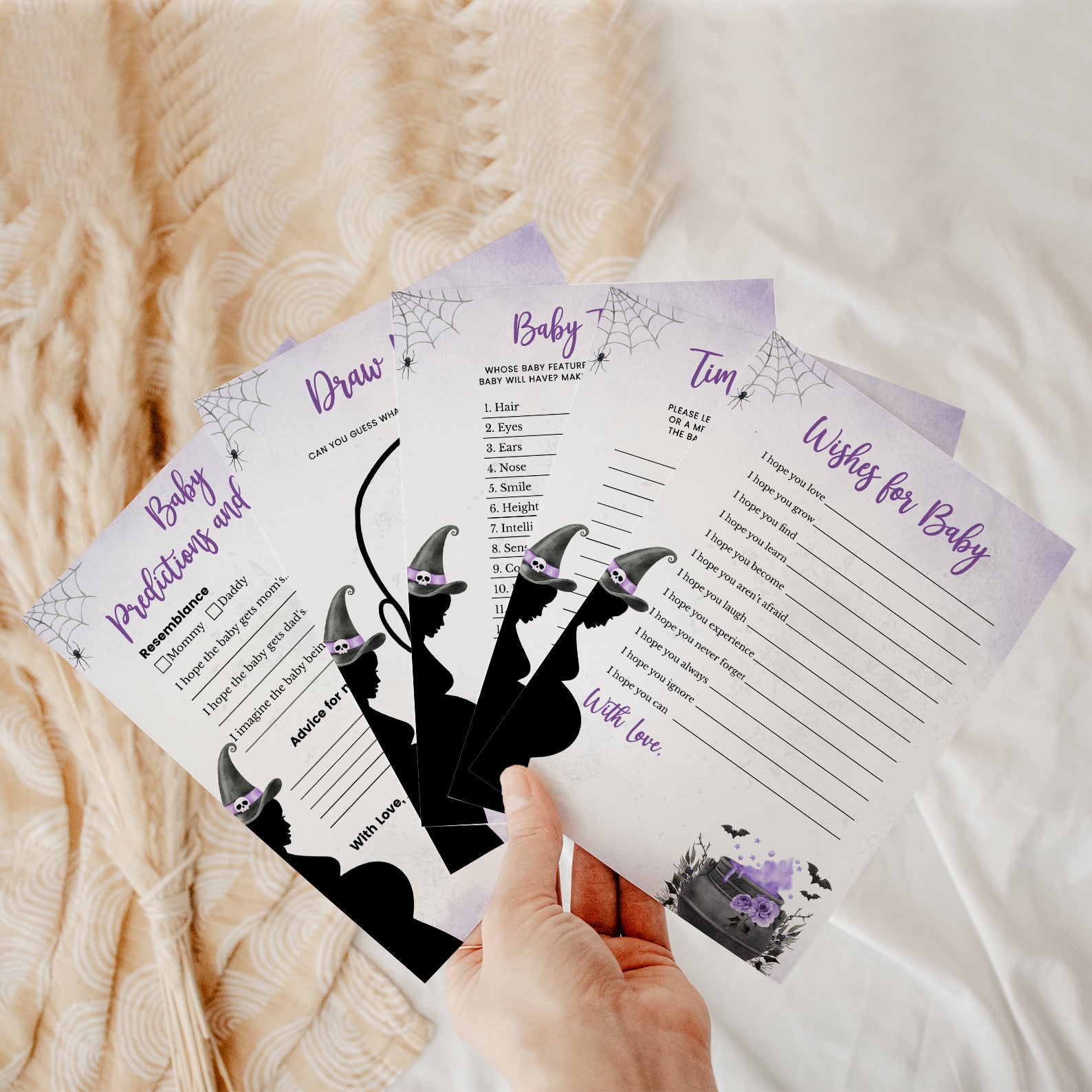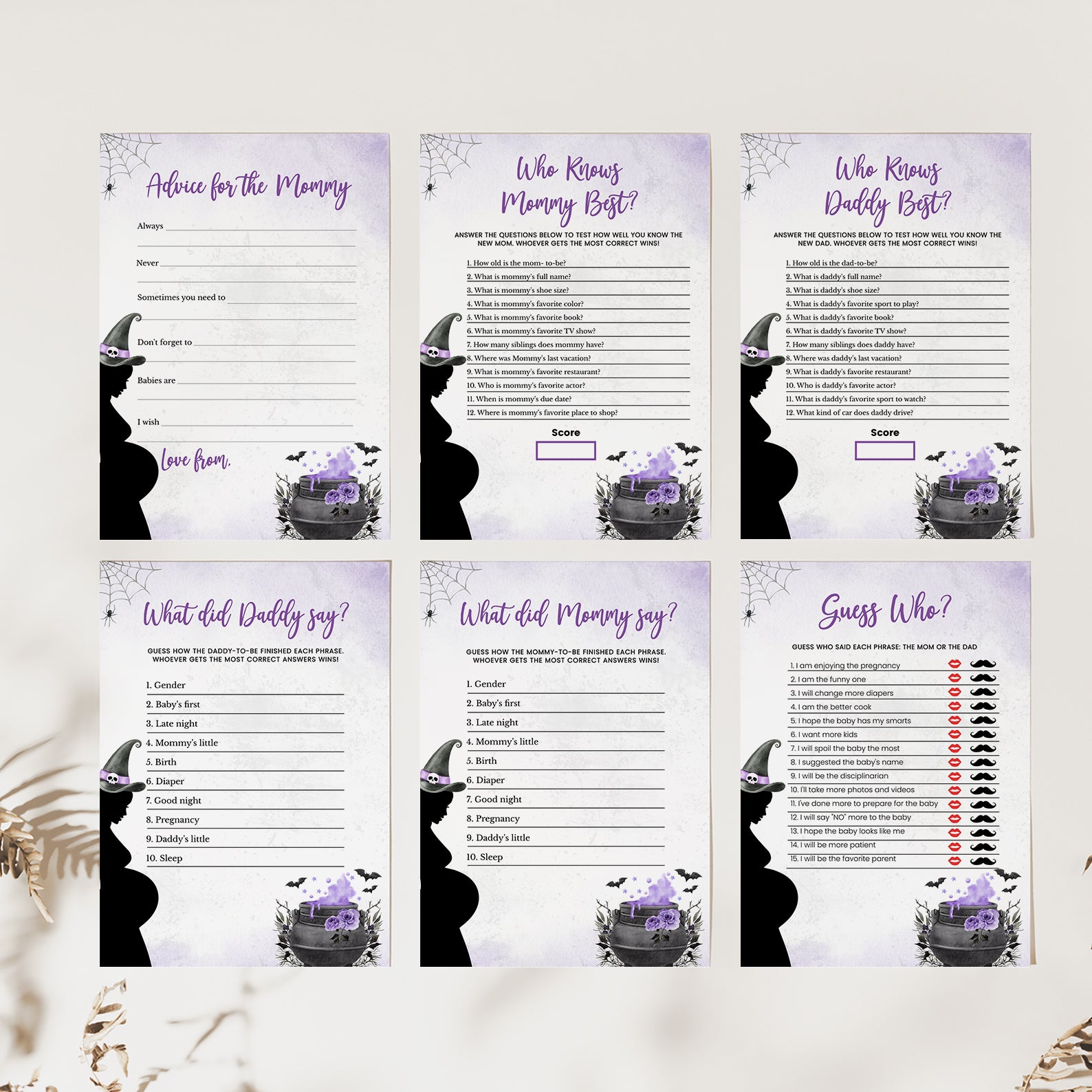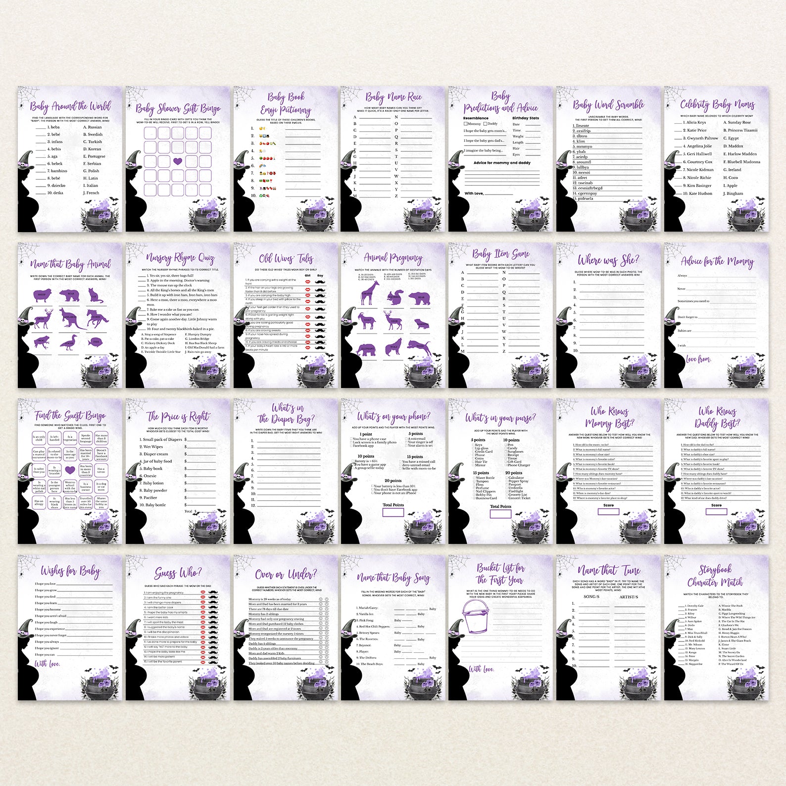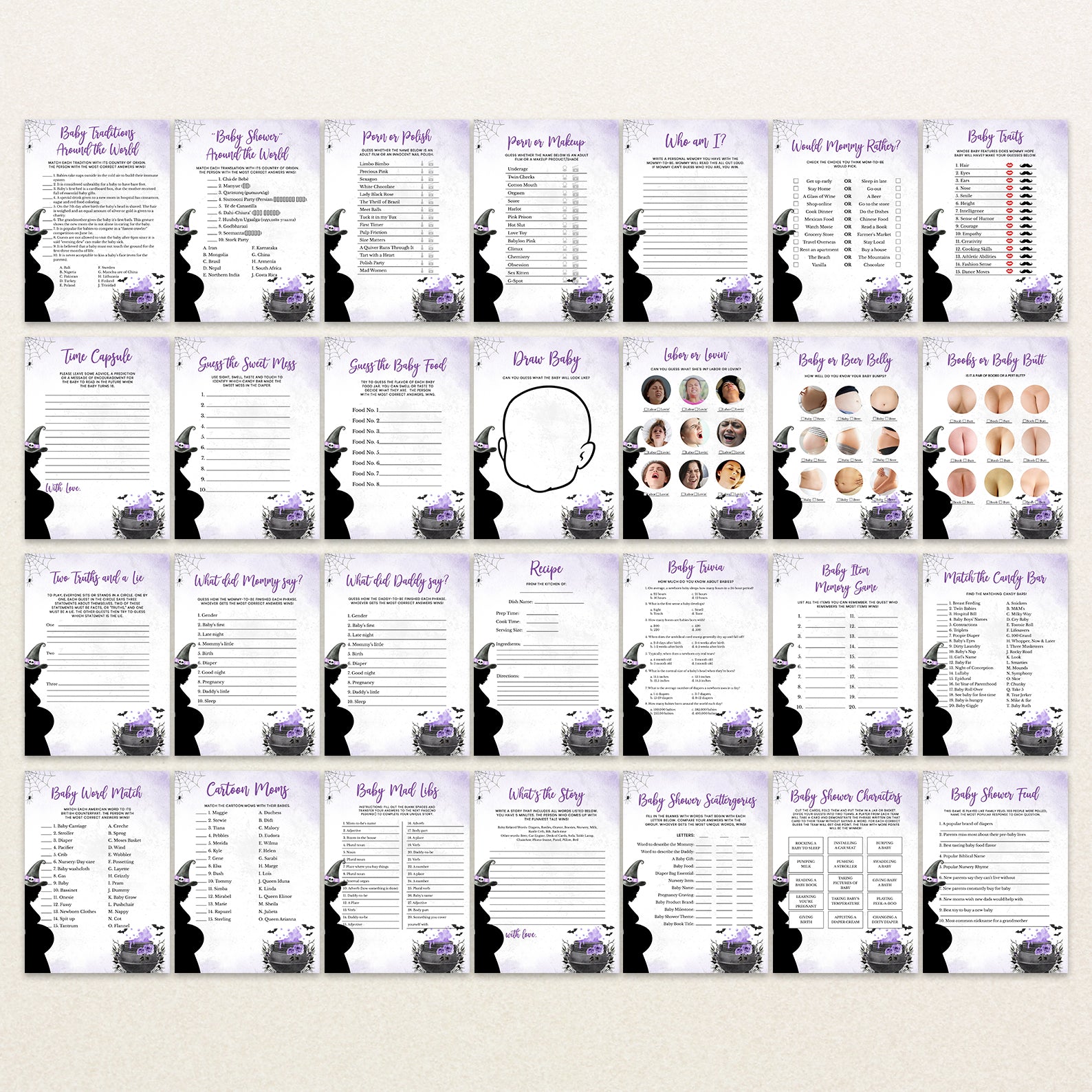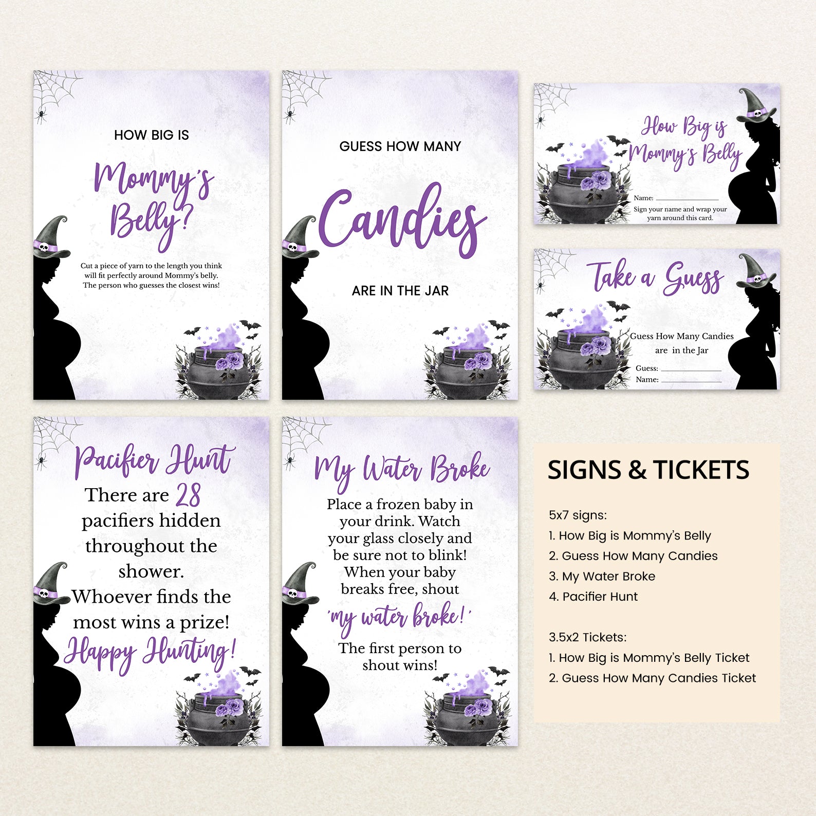 - Purchase this Spellbinding Purple Baby Shower Game Bundle: Pregnant Witch & Cauldron template