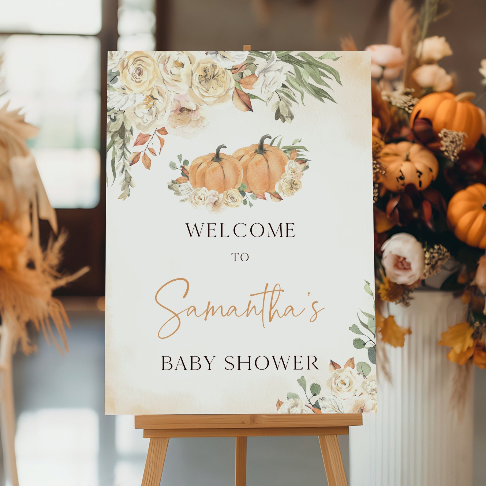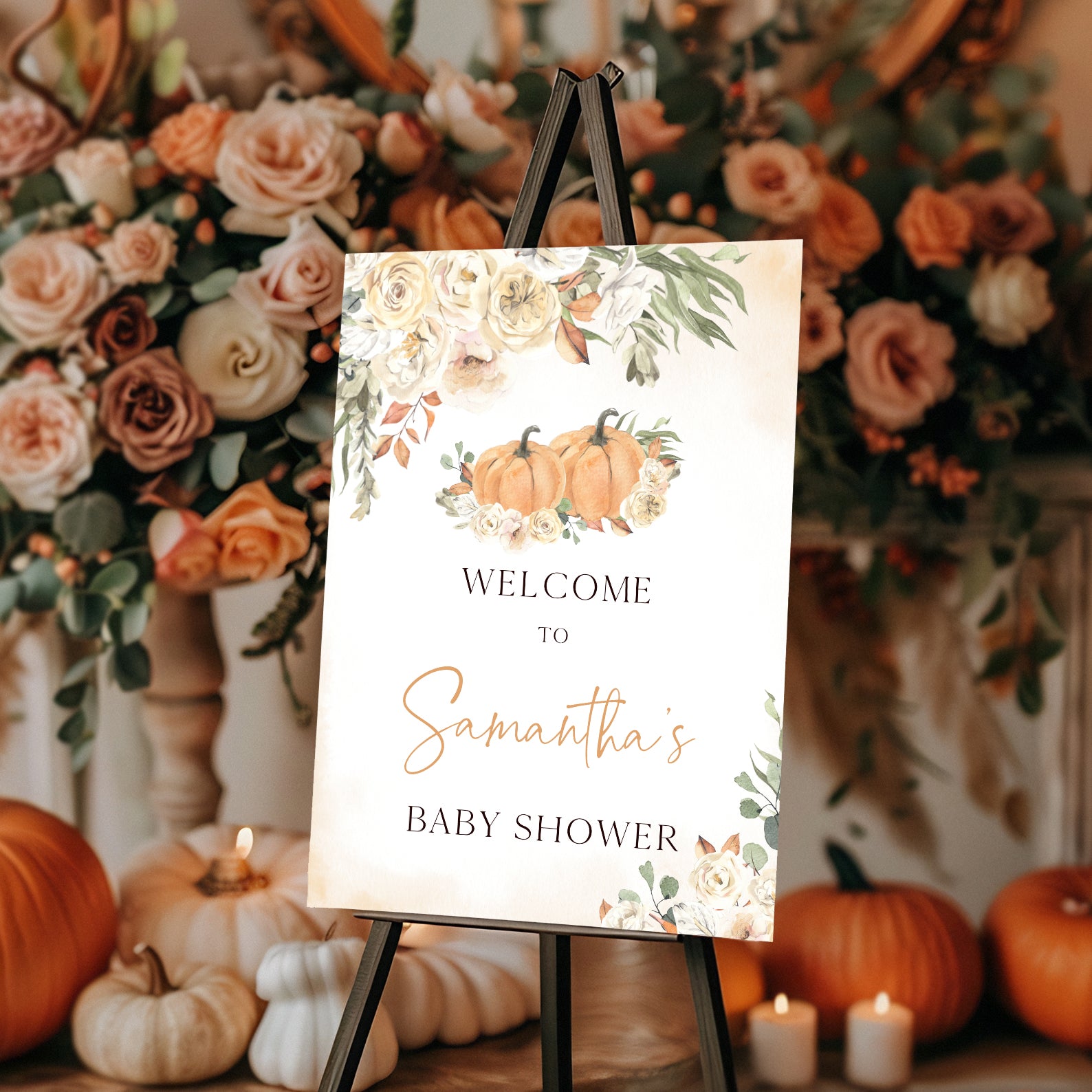 1. Purchase this Sweet Little Pumpkin Fall Baby Shower Welcome Sign: Floral Roses template