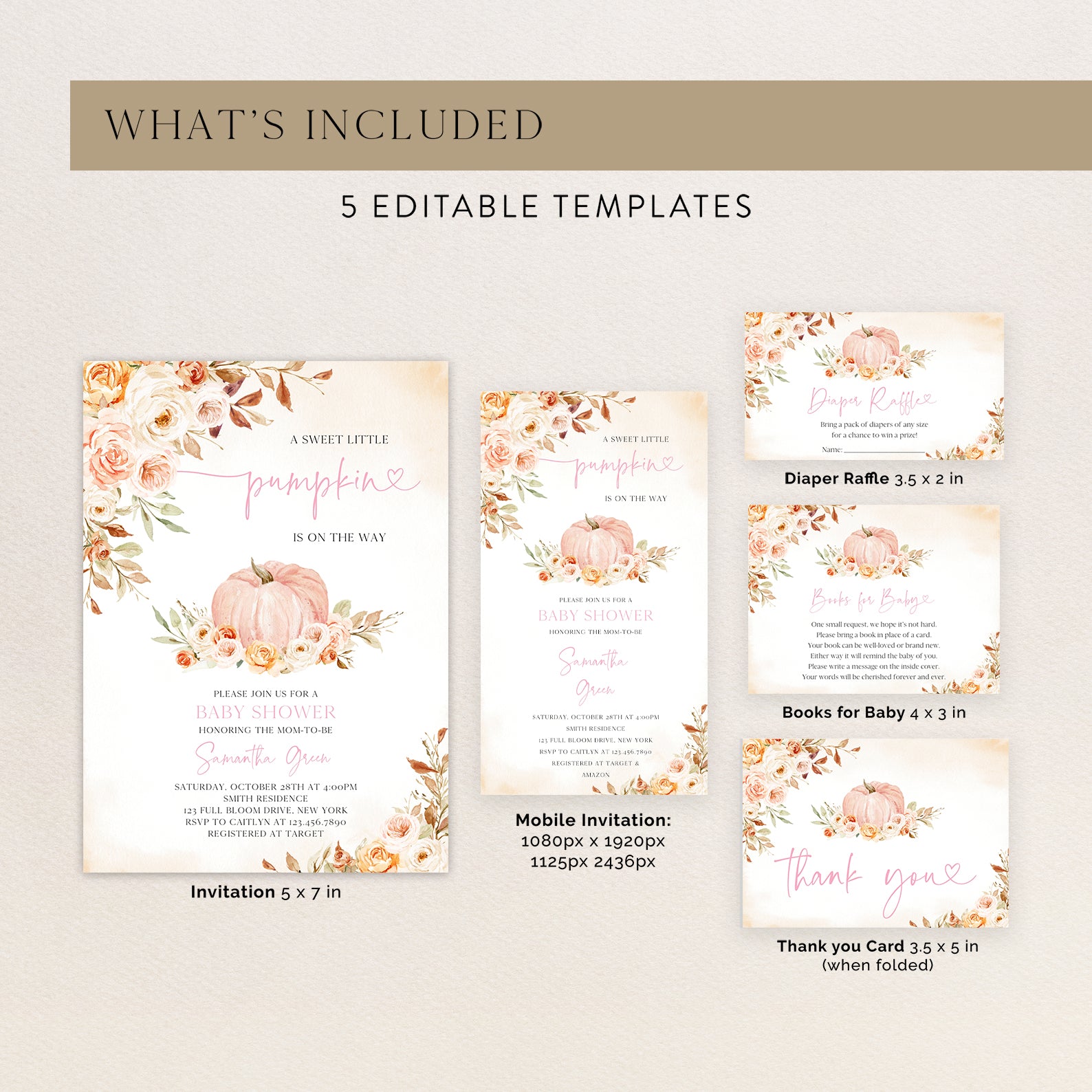1. Purchase this Charming Fall Pink Baby Shower Invitation Bundle with Roses & Pumpkins template