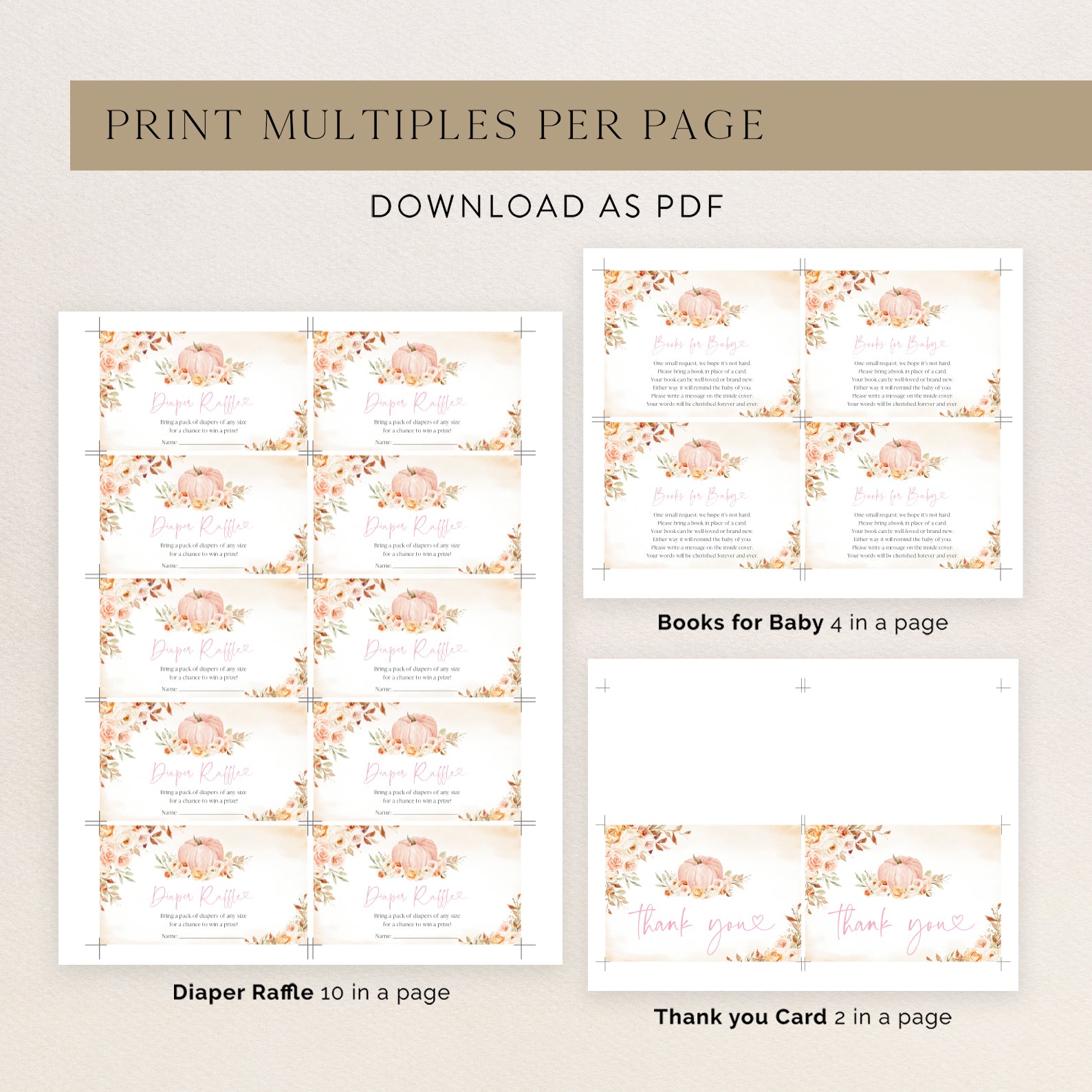 Welcome your little one with our charming Fall Baby Shower Bundle. Featuring an invitation, mobile invite, diaper raffle, books for baby card, and thank you card, this set is available in blue or pink for gender reveals or a vibrant solo theme. With watercolor roses, lush leaves, and pumpkins adorned with roses, this design creates a warm and inviting touch for your celebration. Perfect for a cozy gathering, this bundle ensures every detail of your event is covered.