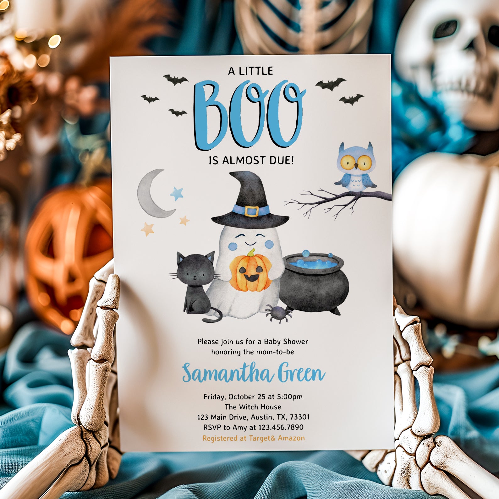 Celebrate the upcoming arrival of your little one with our adorable baby shower digital invite featuring a sweet smiling ghost in a witch hat holding a pumpkin, accompanied by a black cat and a brewing cauldron. Complete with a cute owl perched on a tree branch and flying bats overhead, this invitation offers a whimsical touch to your special event. Choose from a selection of blue, pink, or purple themes to customize the invite to suit your preferences. Get ready to welcome your little boo with this charming design!