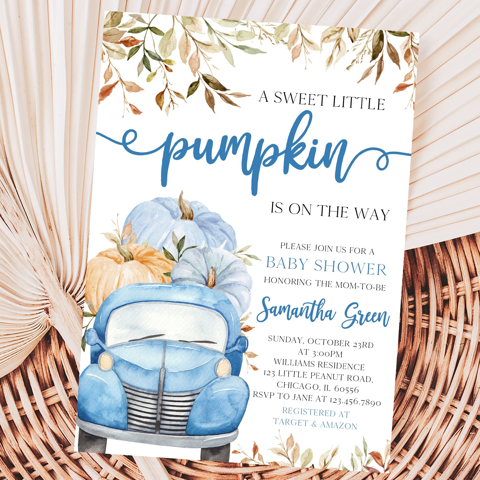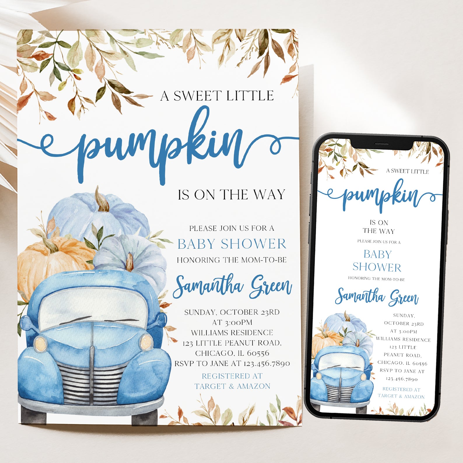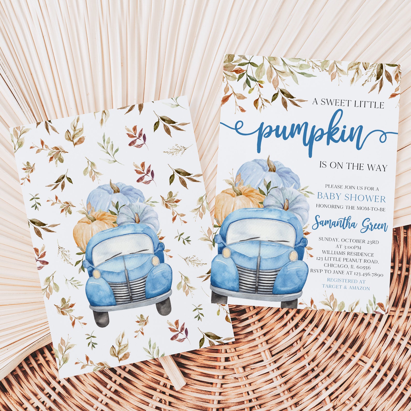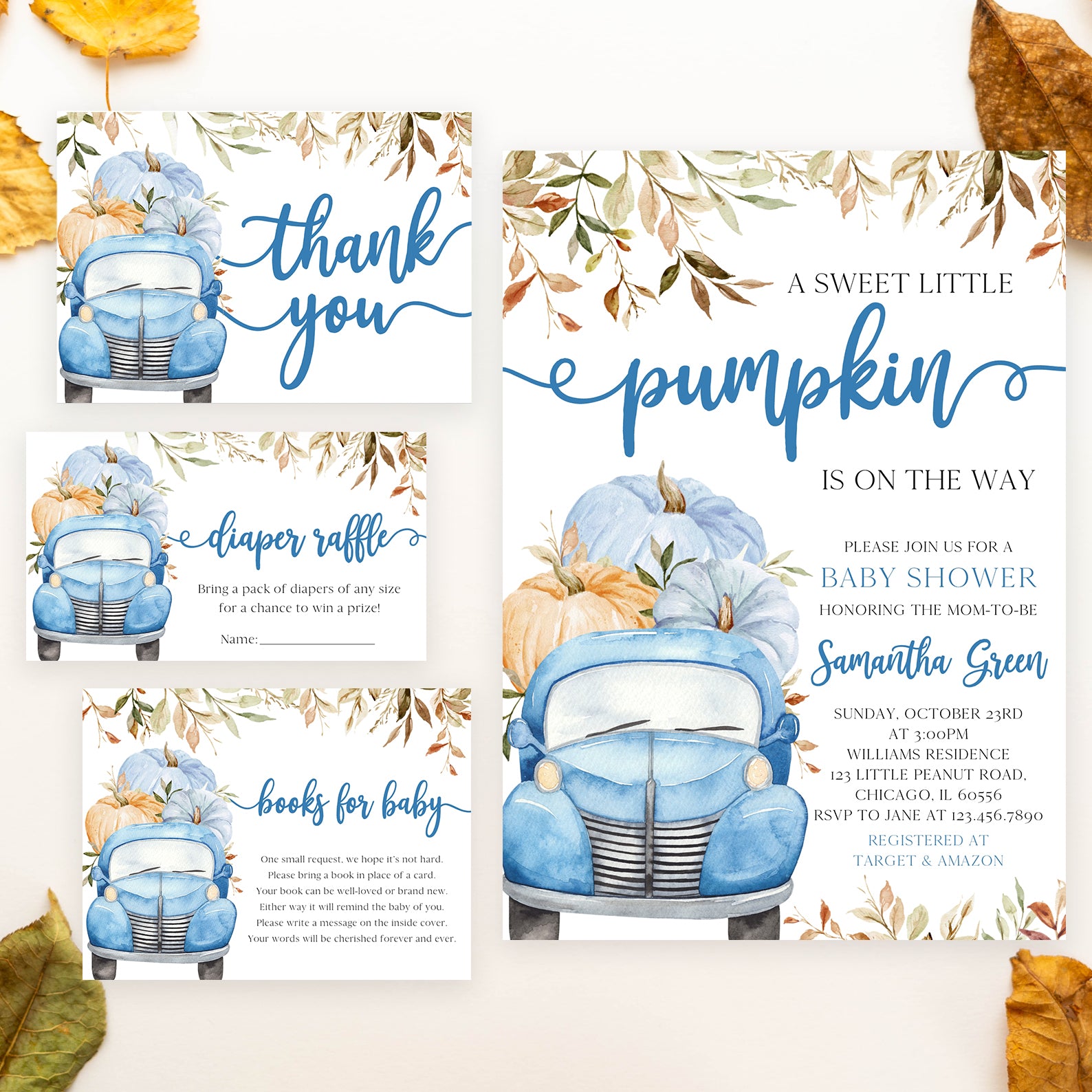 - Purchase this Sweet Pumpkin with Blue Truck & Leaves Fall Baby Shower Invite Bundle template
