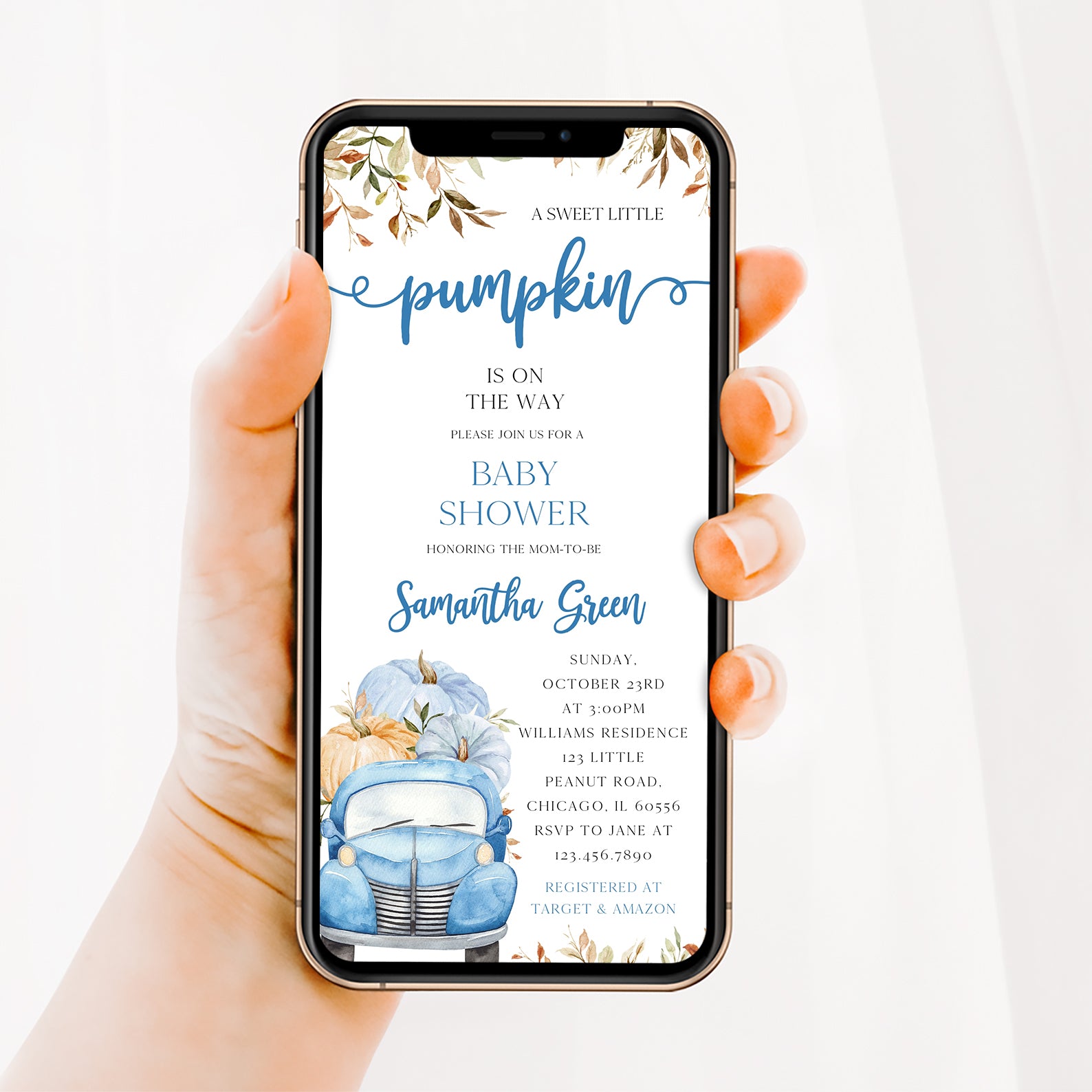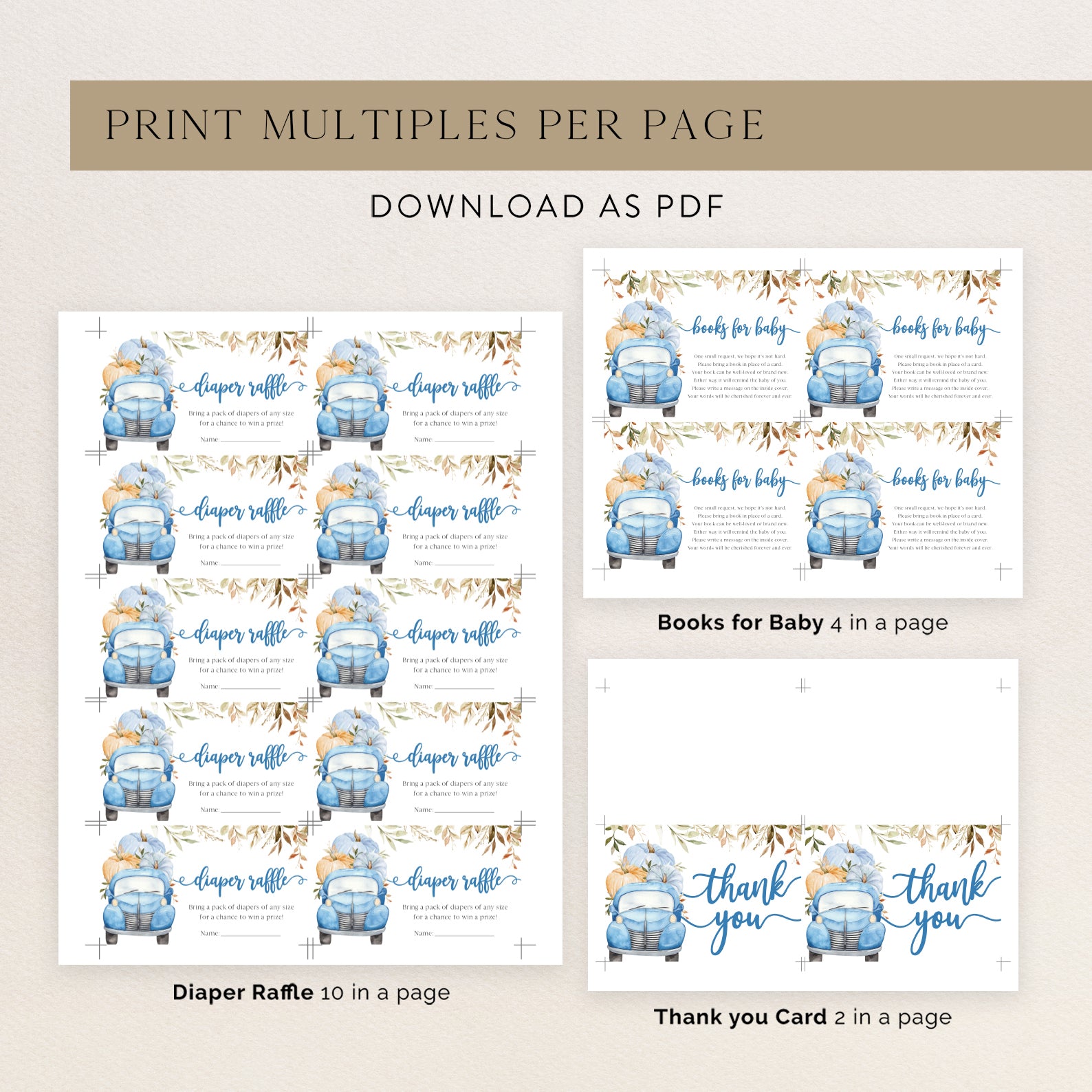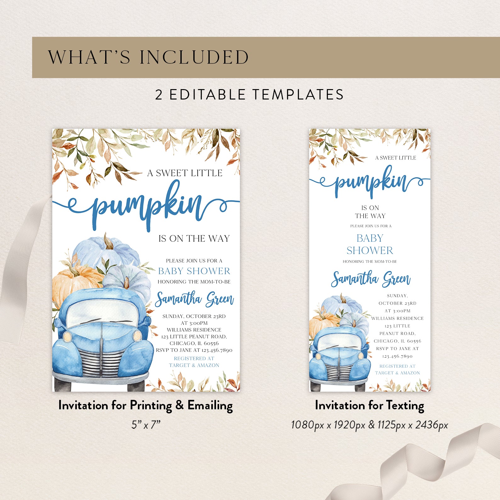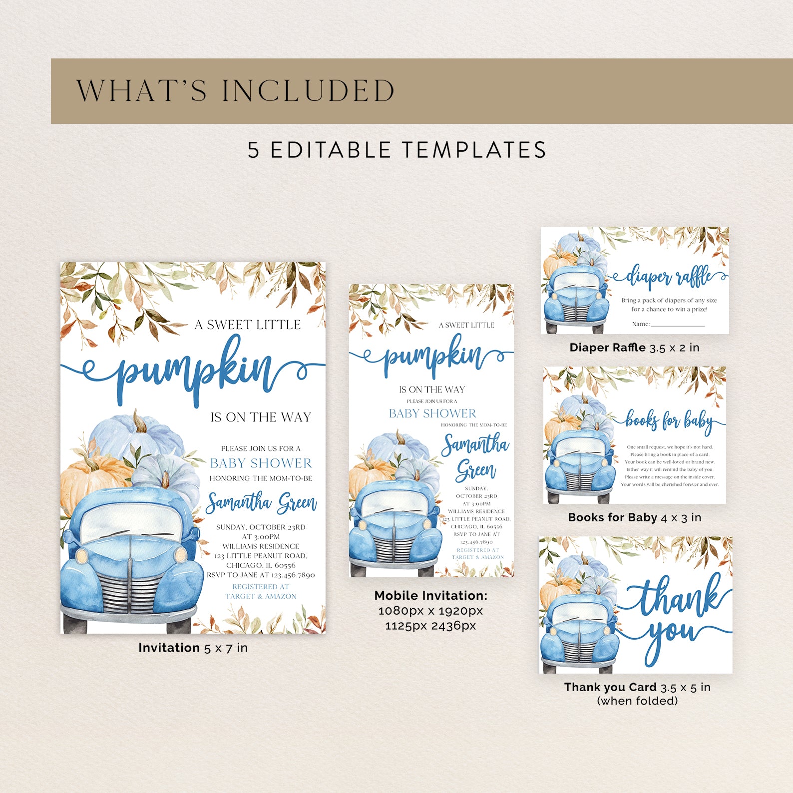 - Purchase this Sweet Pumpkin with Blue Truck & Leaves Fall Baby Shower Invite Bundle template