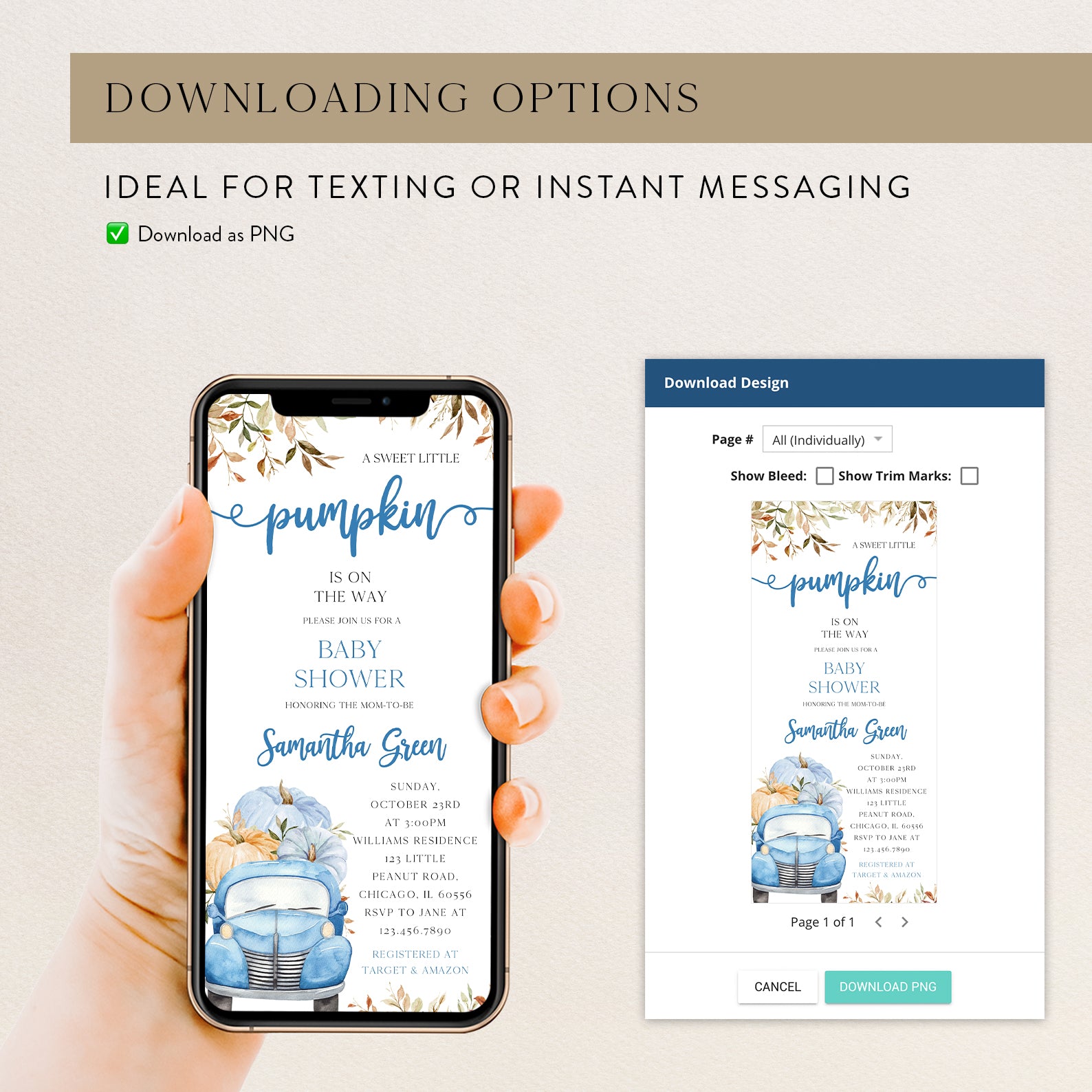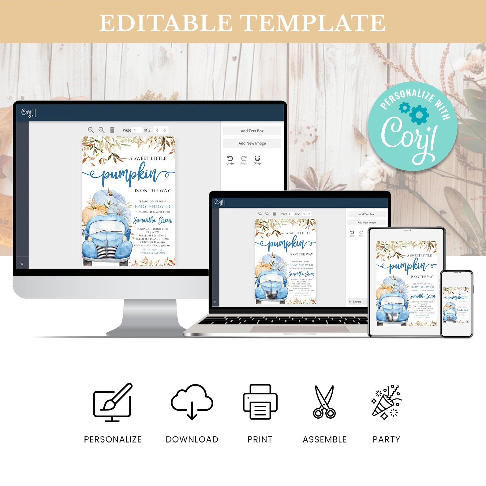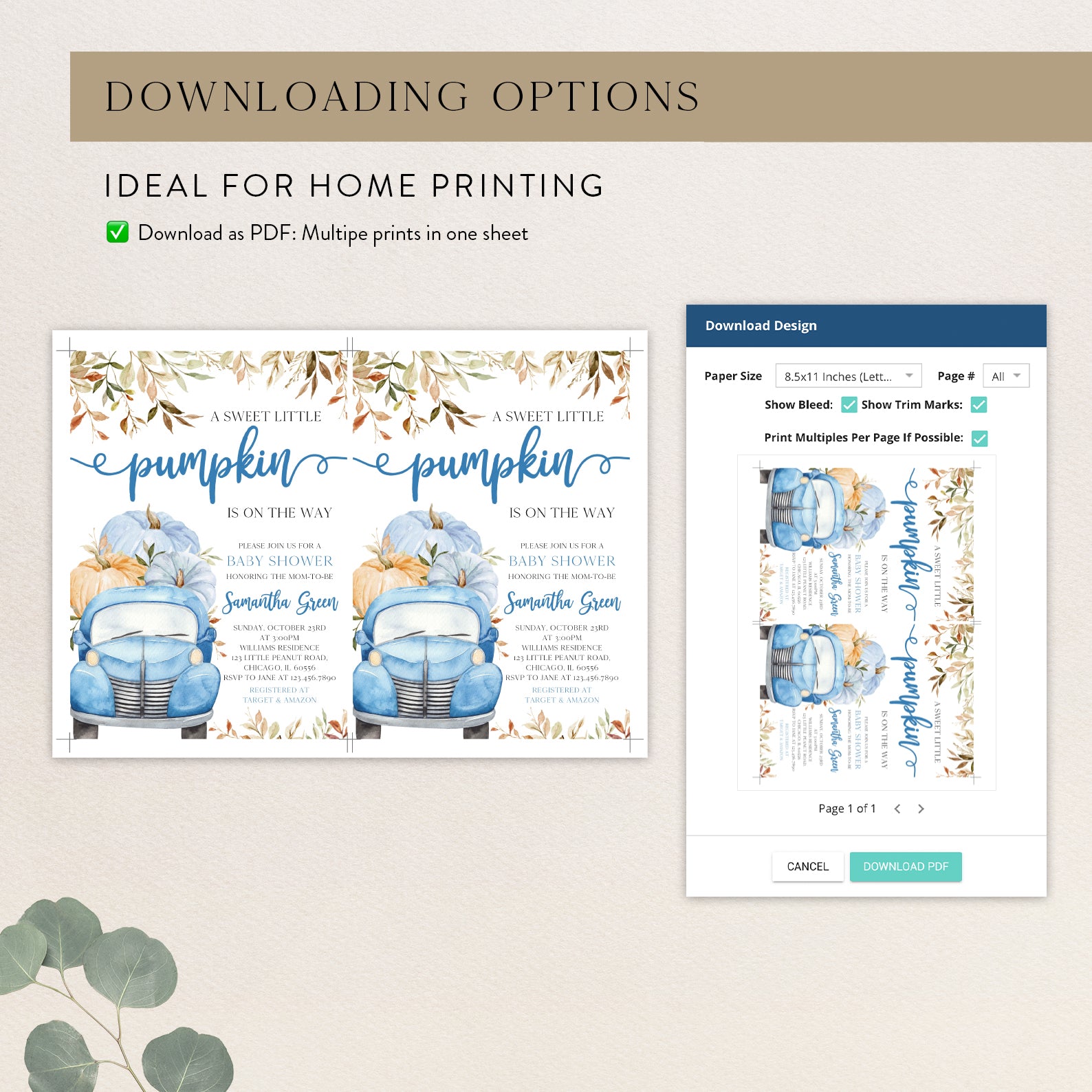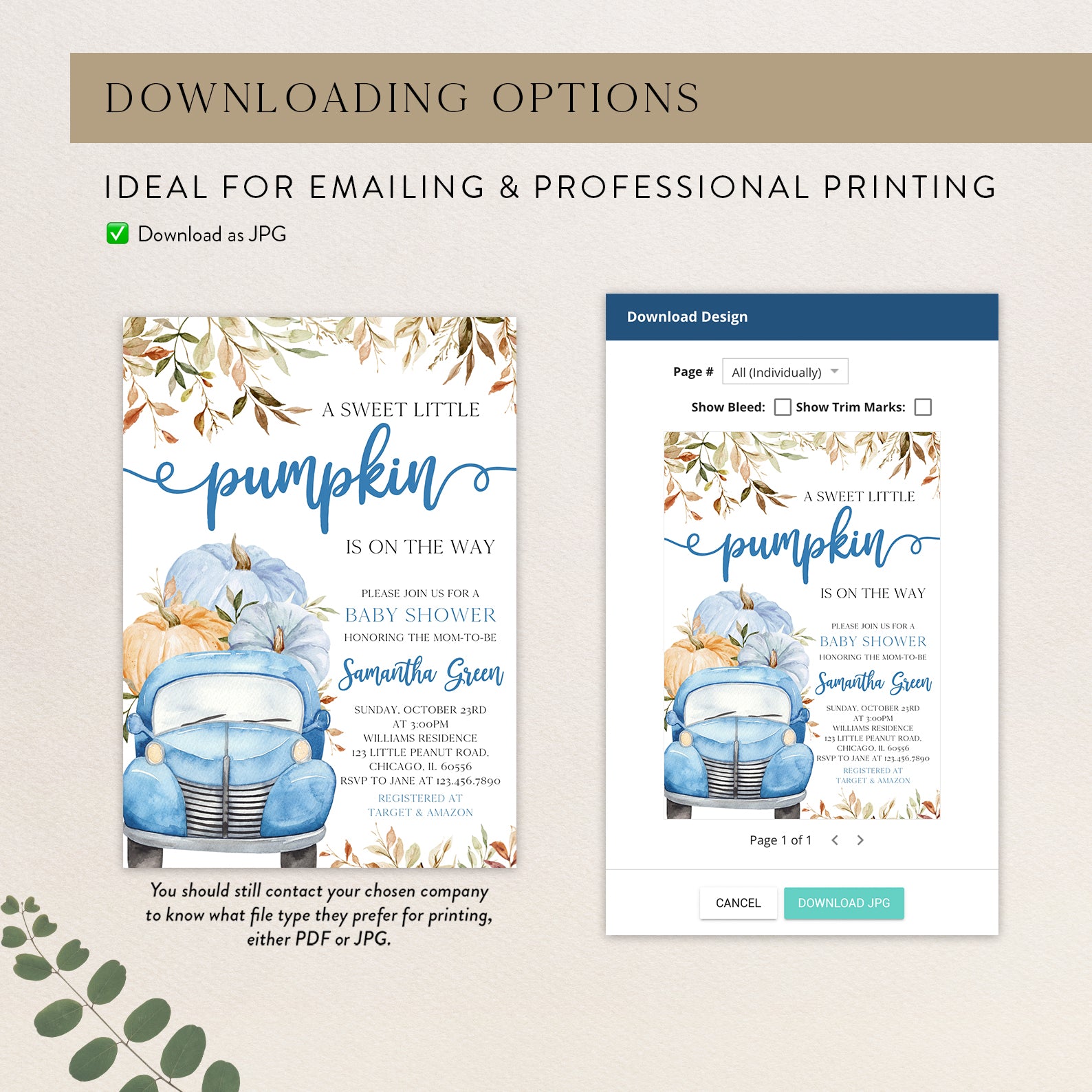 - Purchase this Sweet Pumpkin with Blue Truck & Leaves Fall Baby Shower Invite Bundle template