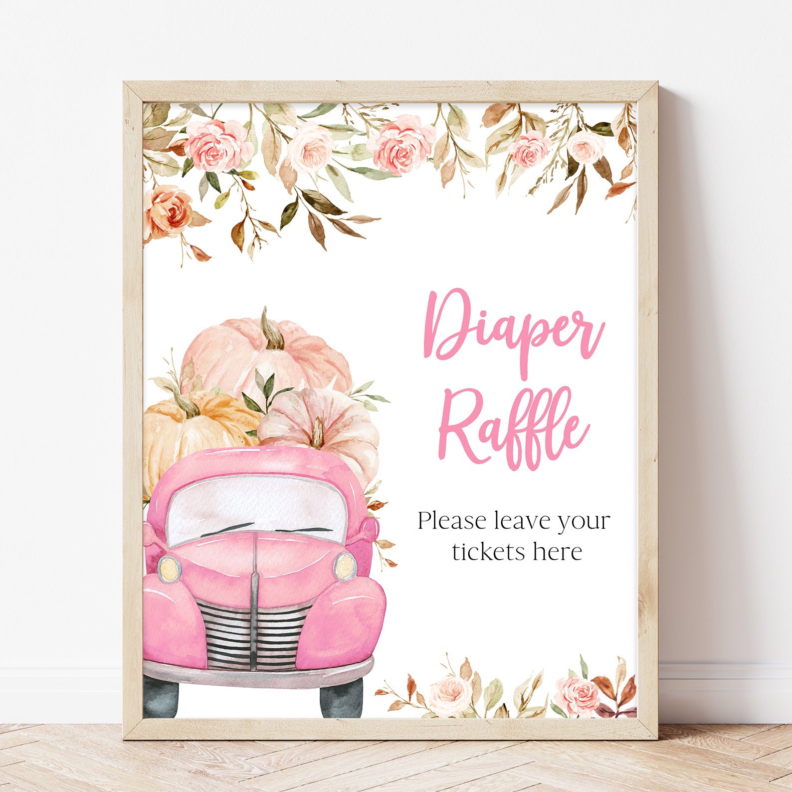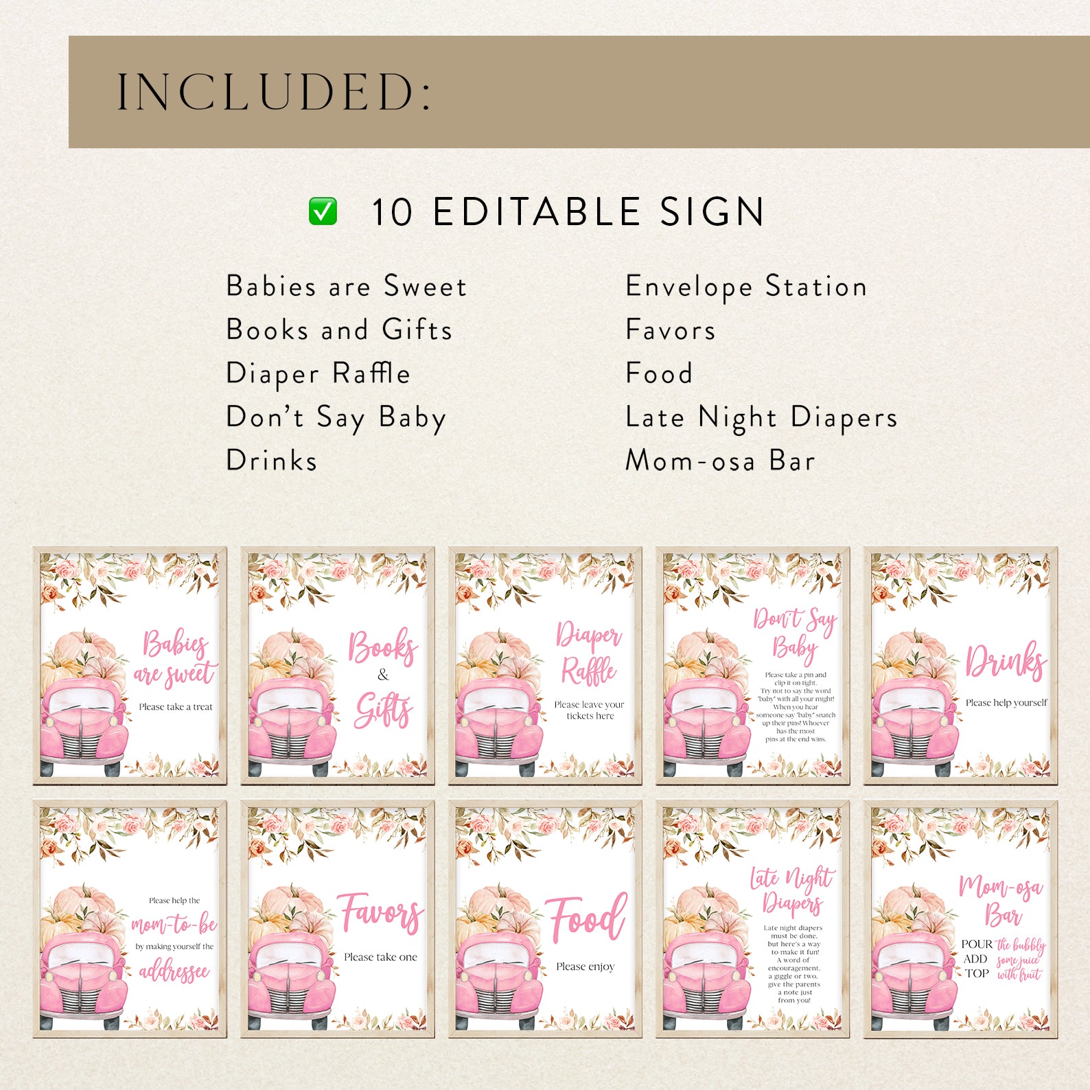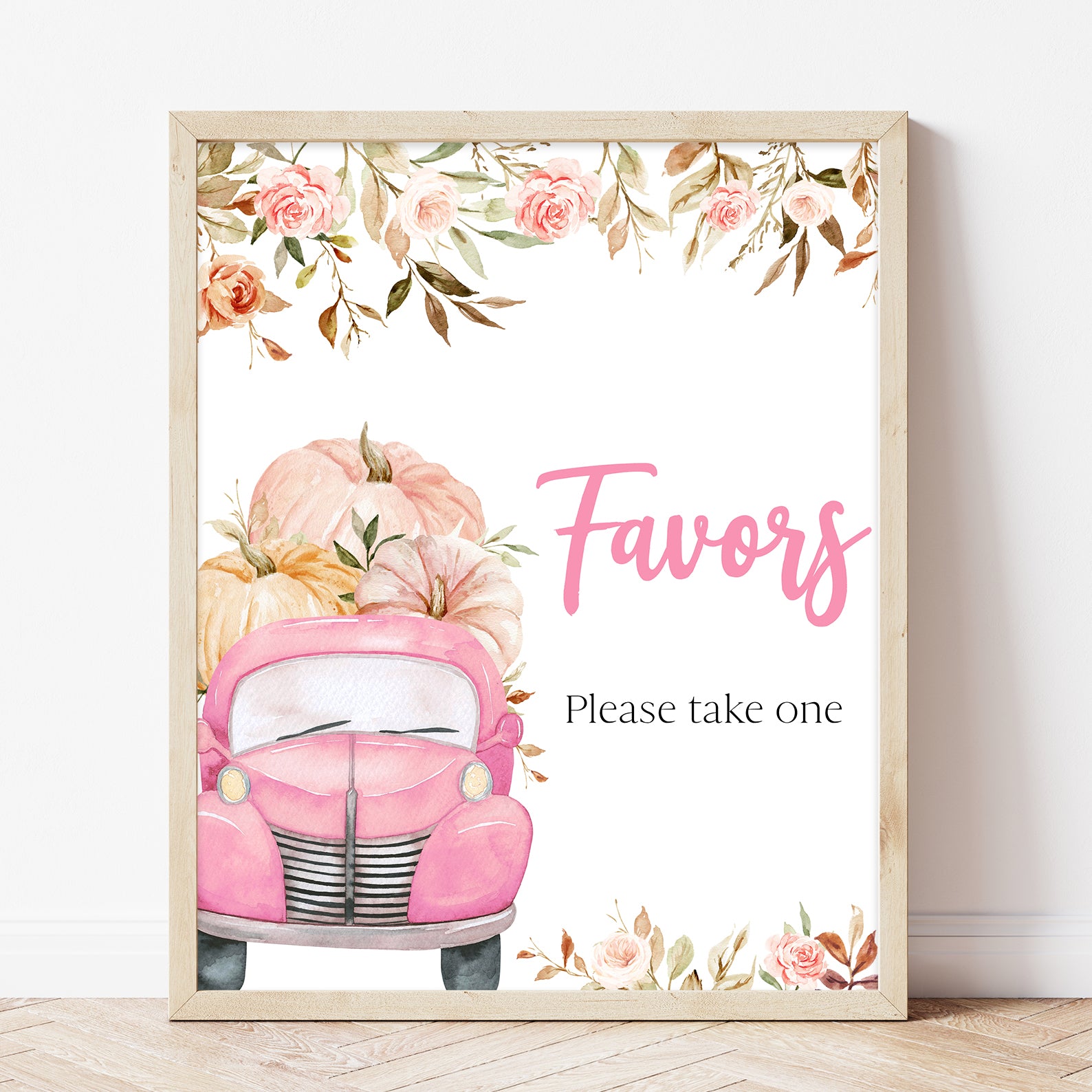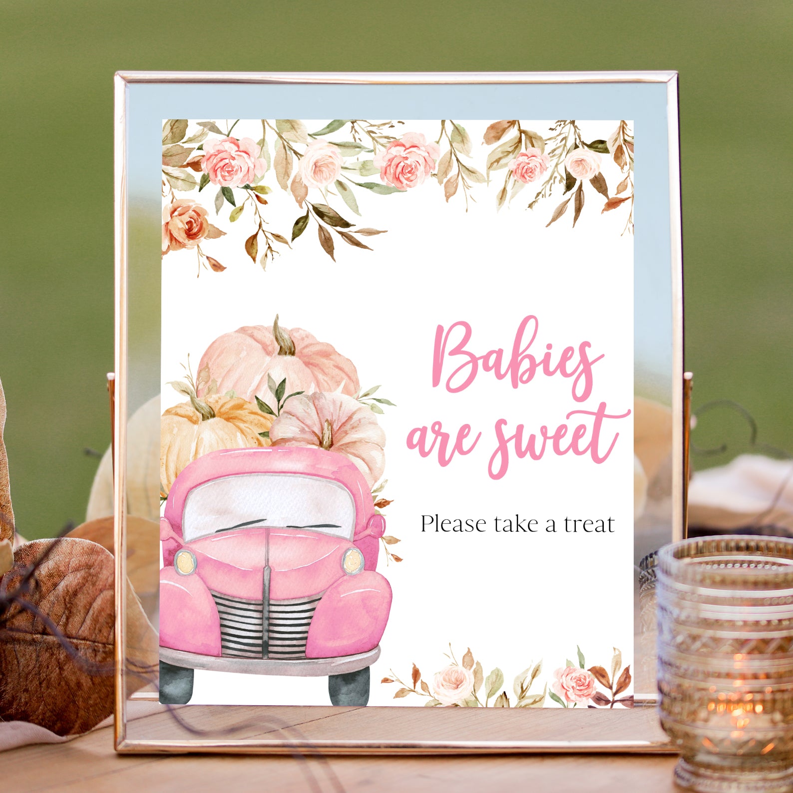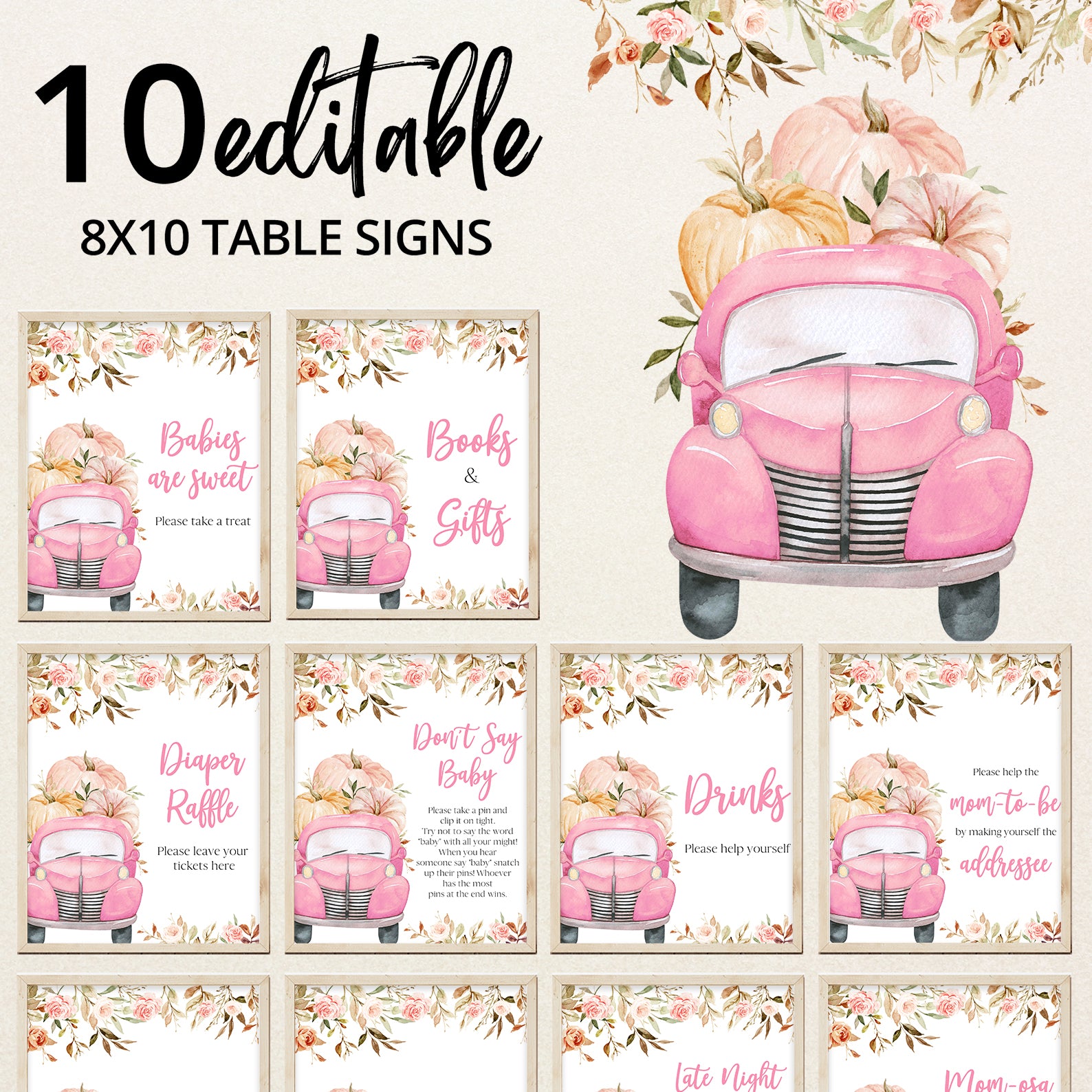 Set the scene with this editable fall baby shower table sign set featuring 10 themed signs. Each one is adorned with watercolor pumpkins, leafy borders, and rustic fall elements that complement your autumn décor. With labels like “Babies Are Sweet” and “Mom-osa Bar,” this collection adds charm and coordination to your setup perfect for tying together your pumpkin-themed celebration in soft pink or blue.