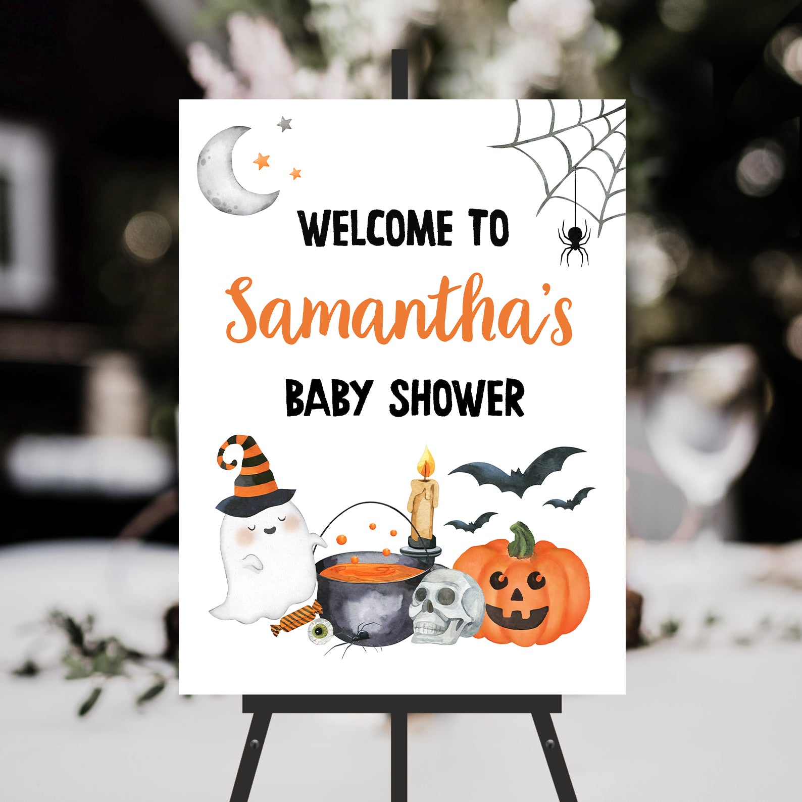 Welcome your guests with our "A Little Boo" baby shower sign! This spooky yet charming design features a spider web, half grey moon, a cauldron brewing orange potion, a ghost in a witch hat, a skull, a cute pumpkin, and flying bats. It’s the perfect way to greet your guests and set a fun, festive tone for your Halloween-themed celebration!