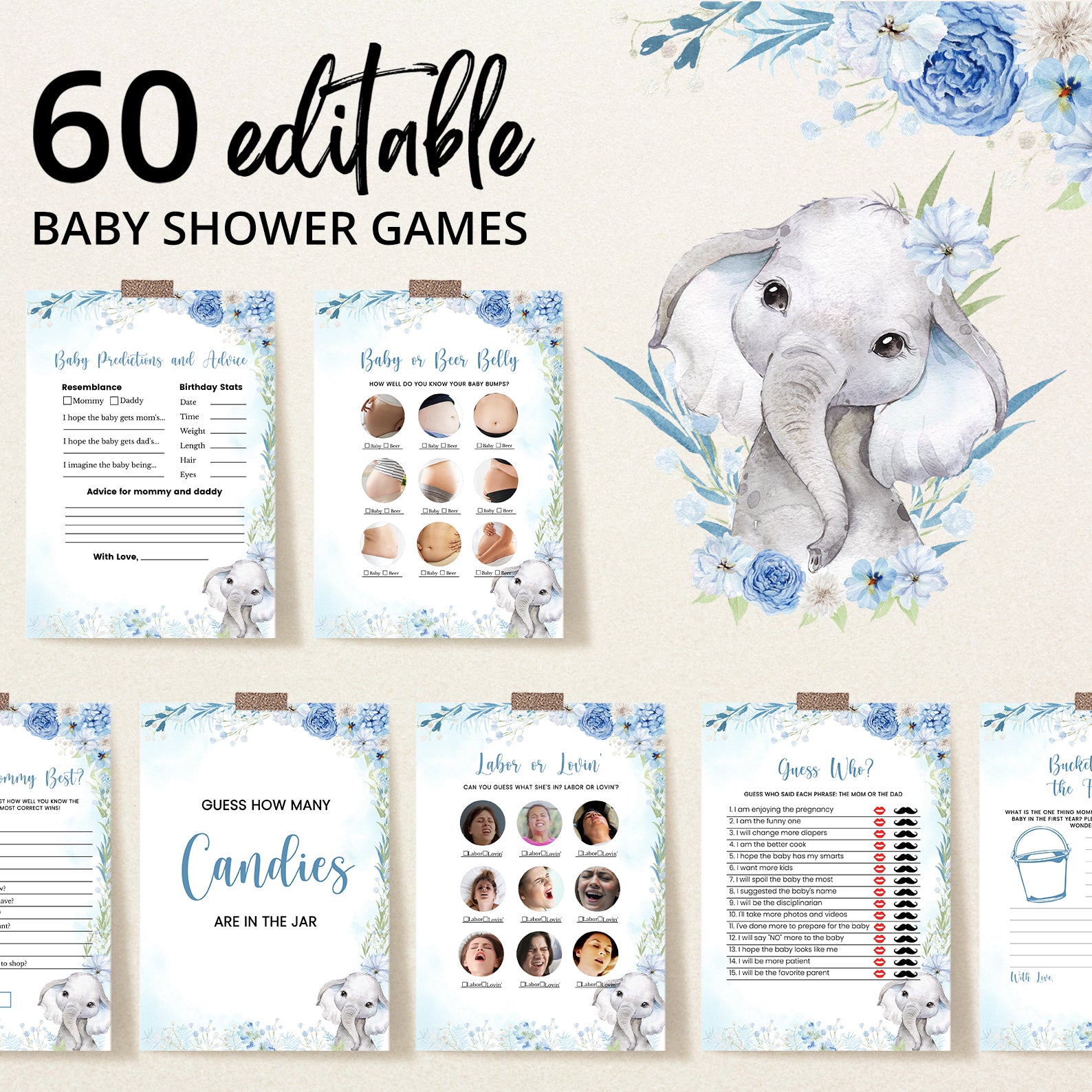 Keep your guests entertained with 60 editable baby shower games featuring the adorable blue elephant theme. Each game is fully customizable, matching your invitation and décor, and designed to make your celebration fun, engaging, and memorable for all your friends and family.