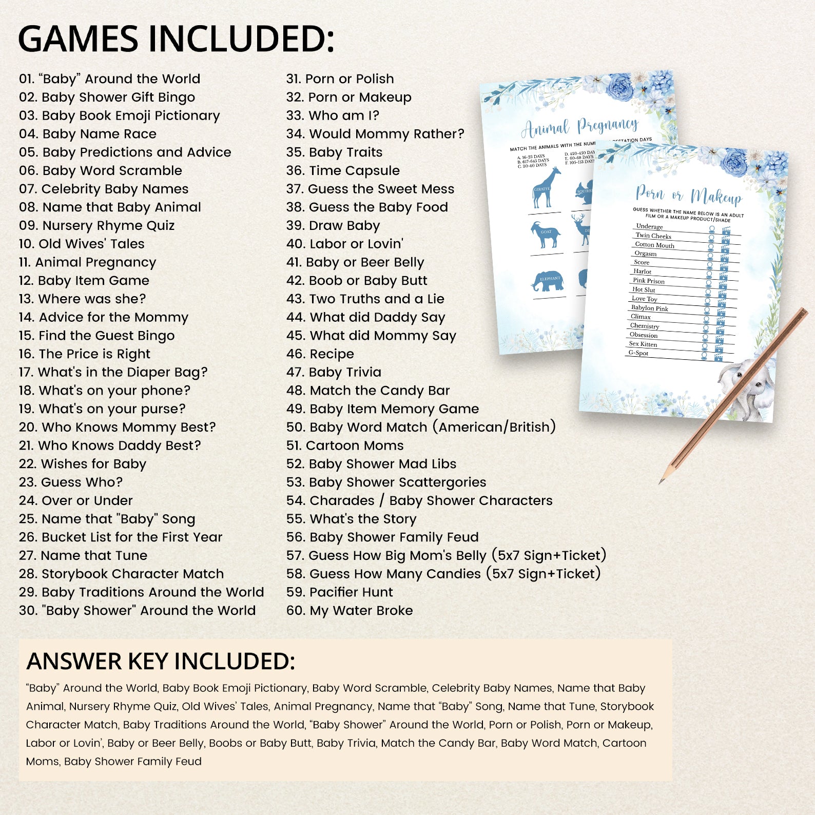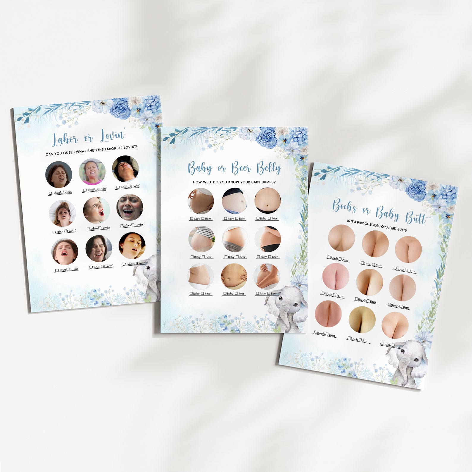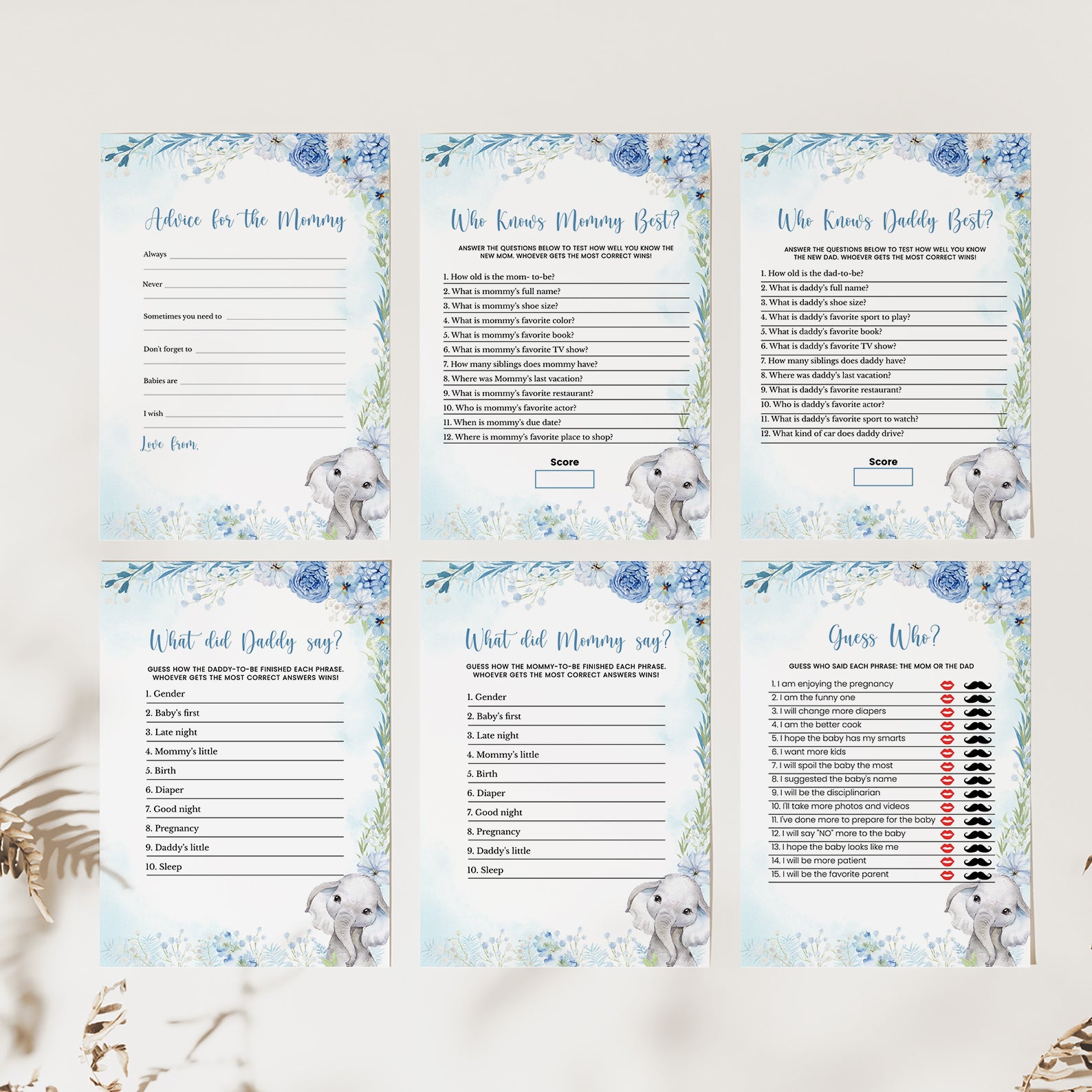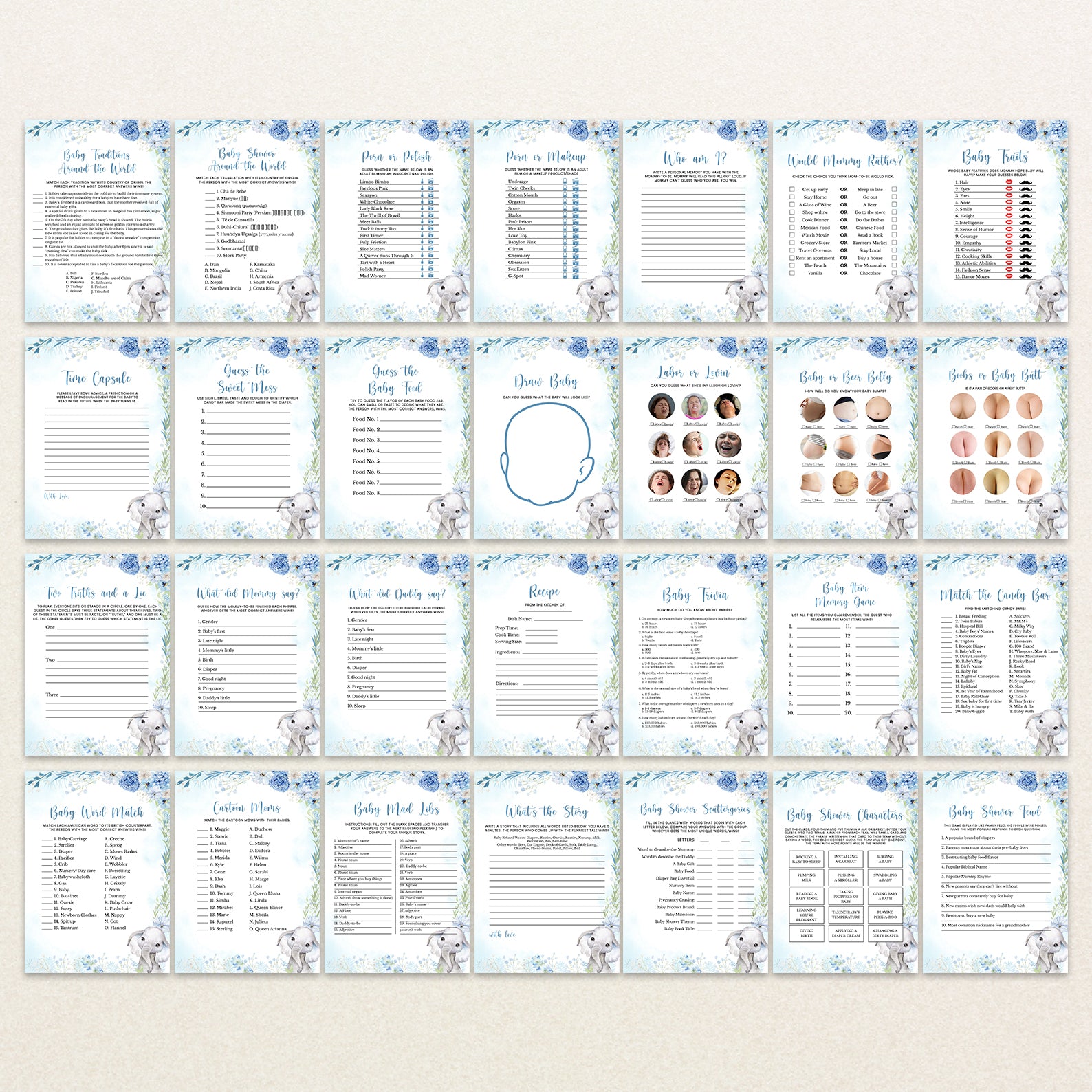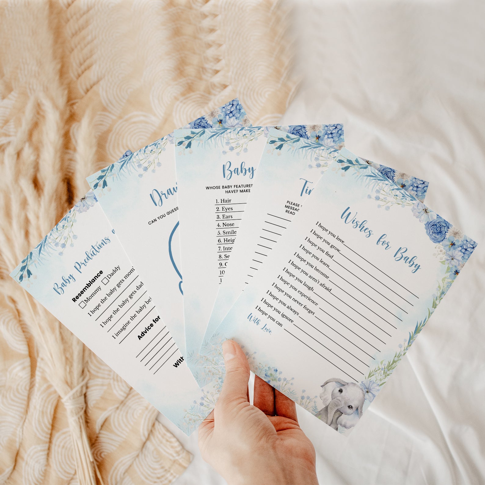 Blue Elephant Baby Shower Game Bundle with Floral Design