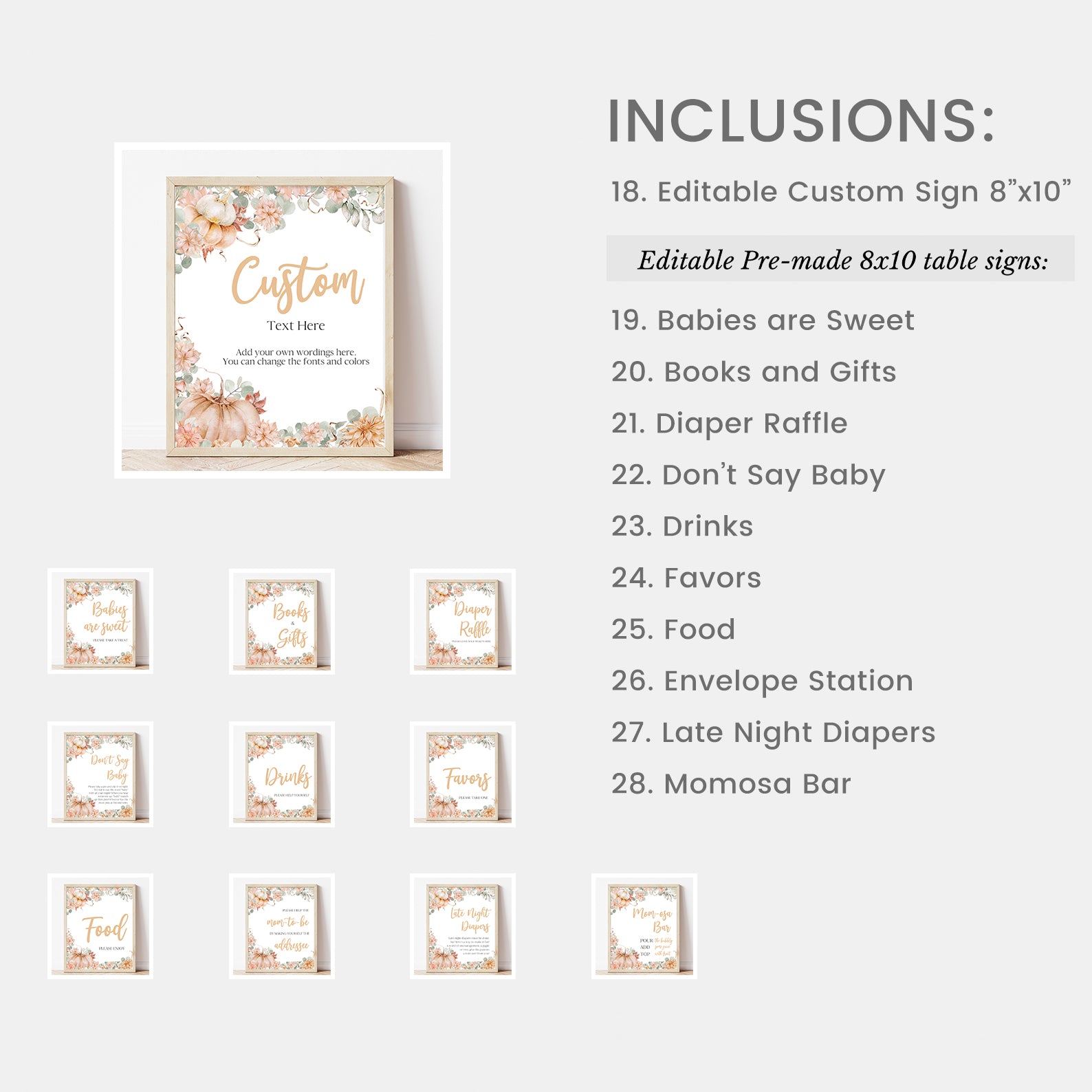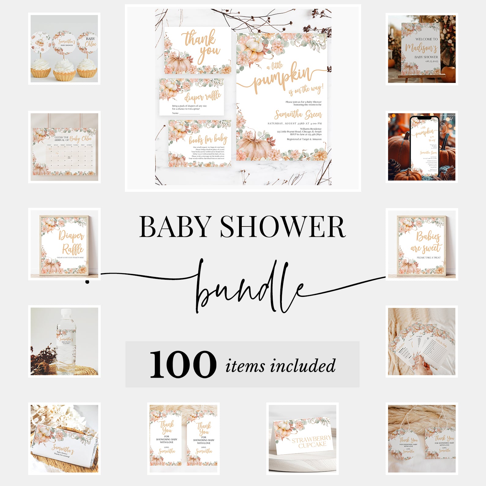 Plan the ultimate fall baby shower with this 100-piece editable mega bundle featuring watercolor pumpkins, warm orange hues, and autumn leaves. From invites and games to signs, favor tags, bottle labels, and more. Every detail is covered. Designed for easy customization and seamless coordination, this bundle makes hosting a beautiful and memorable pumpkin-themed celebration effortless and fun.