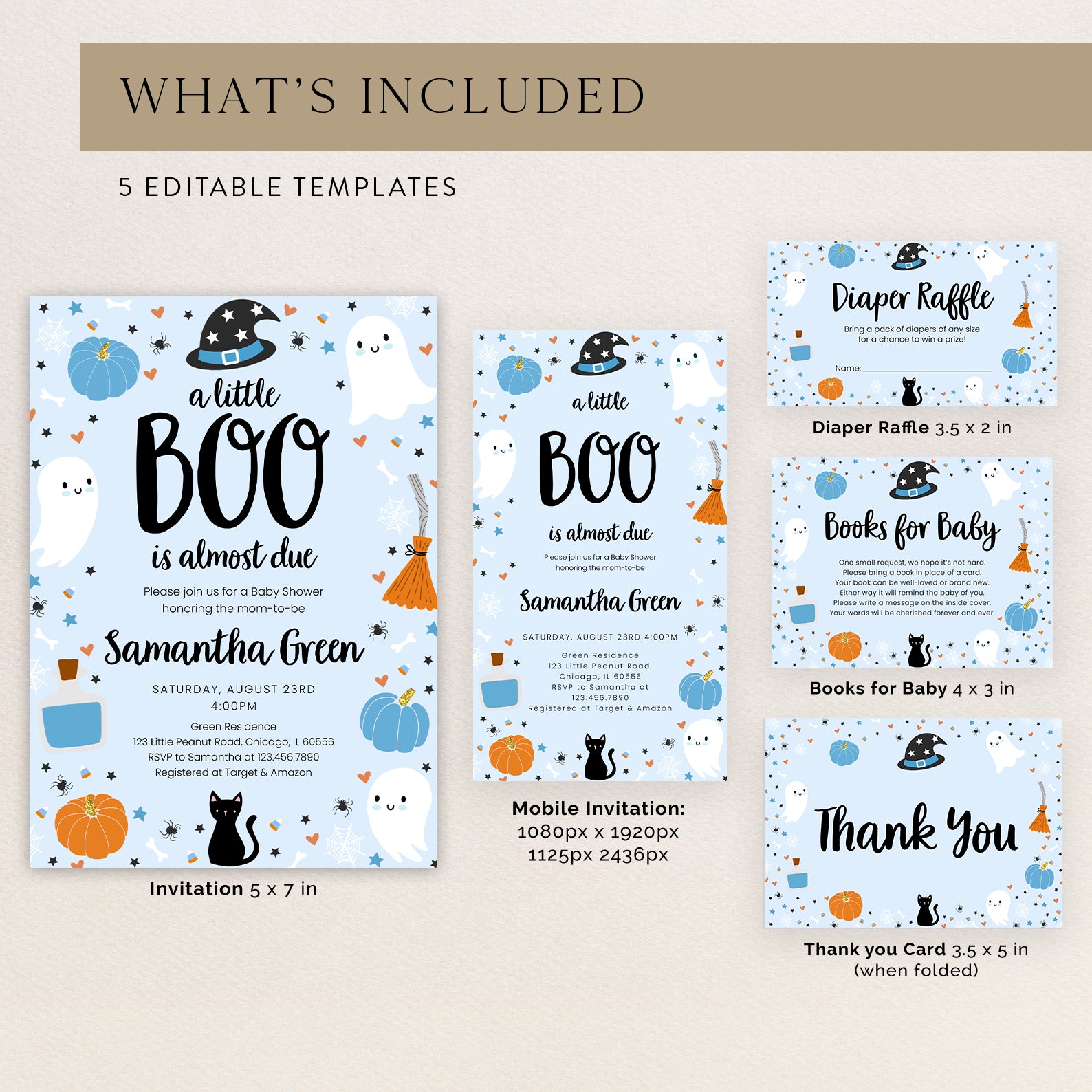- Purchase this Festive Halloween Baby Shower Invite Bundle: Little Boo’s Due template