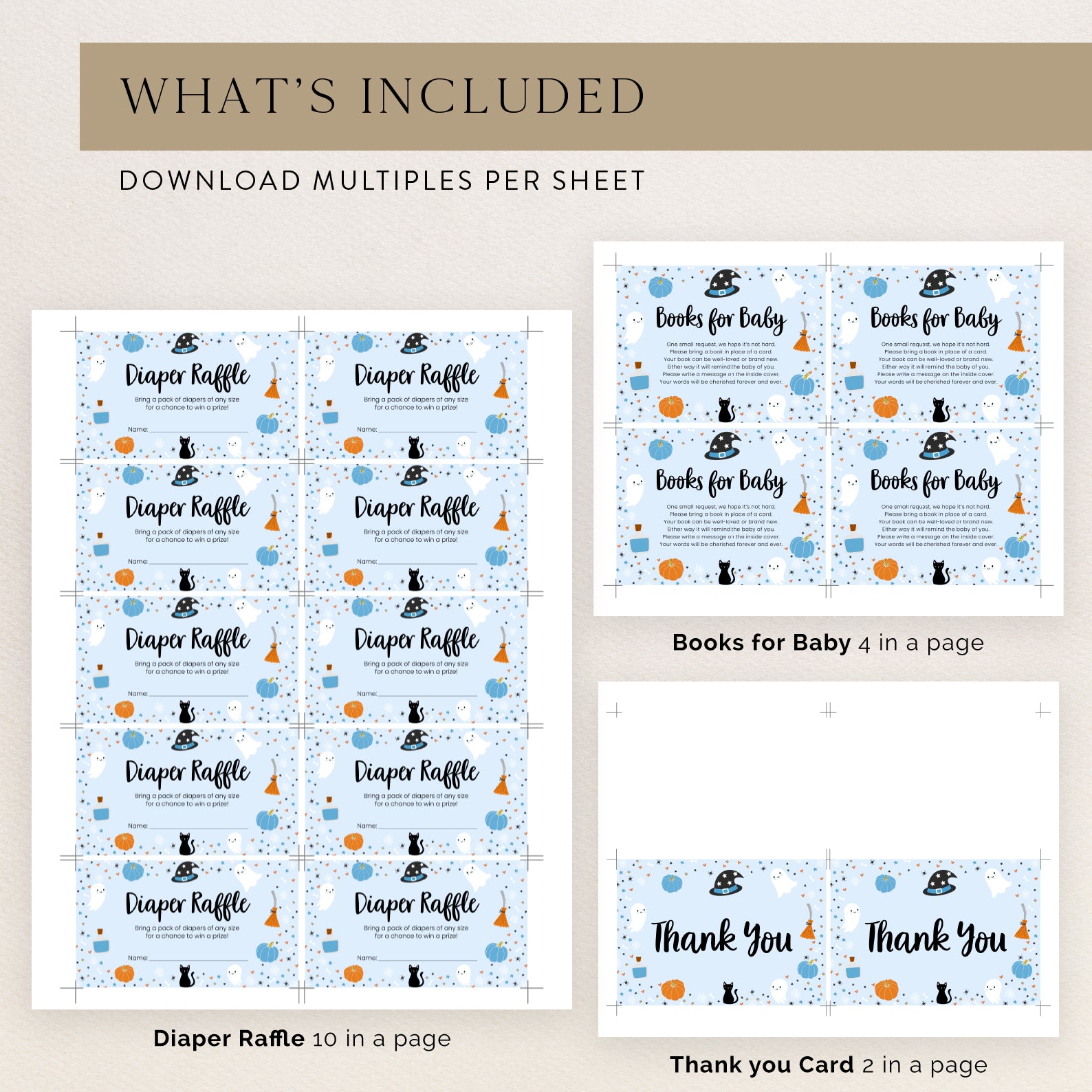 Welcome your little boo with our adorable digital baby shower invitation bundle! Choose from blue or pink backgrounds, each adorned with cute ghosts, a witch’s broom and hat, stars, hearts, a black cat, and spider webs. This set includes an invitation, mobile version, diaper raffle card, books for baby card, and thank you card—perfect for setting a spooky-cute tone and getting everyone excited for your celebration!