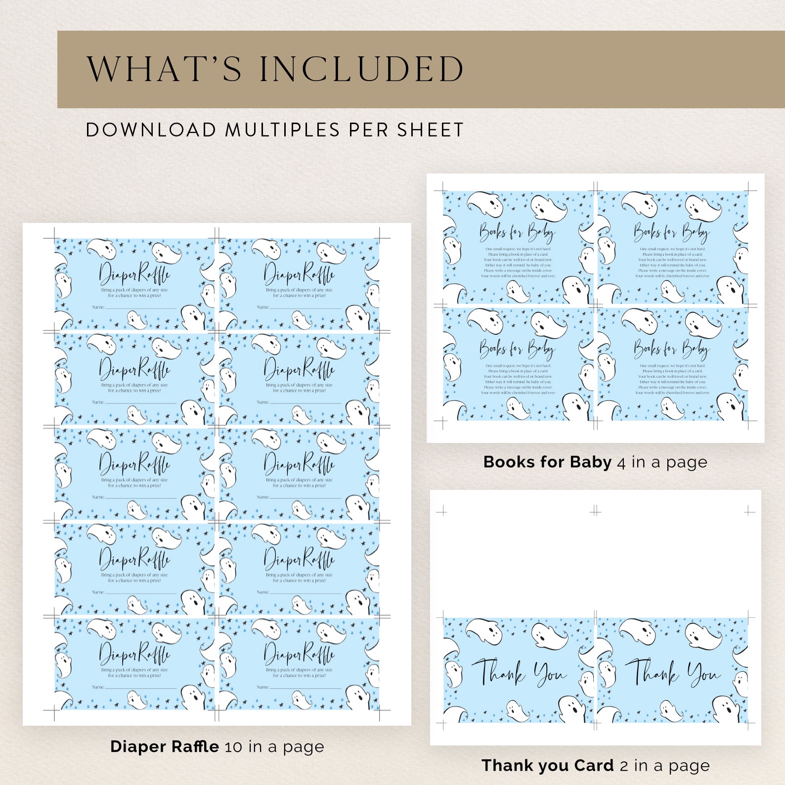 Welcome your little boo with our adorable digital baby shower invitation bundle! Featuring cute flying ghosts and twinkling stars, this set includes an invitation, mobile version, diaper raffle card, books for baby card, and thank you card. Choose from pink for a baby girl or blue for a baby boy to set a spooky-cute tone for your event and celebrate in style!