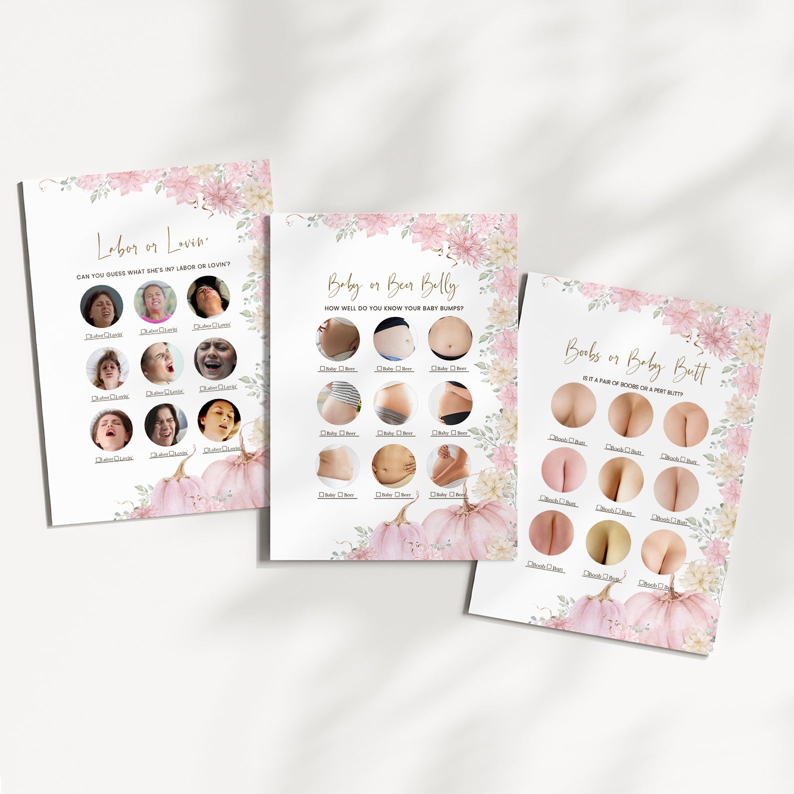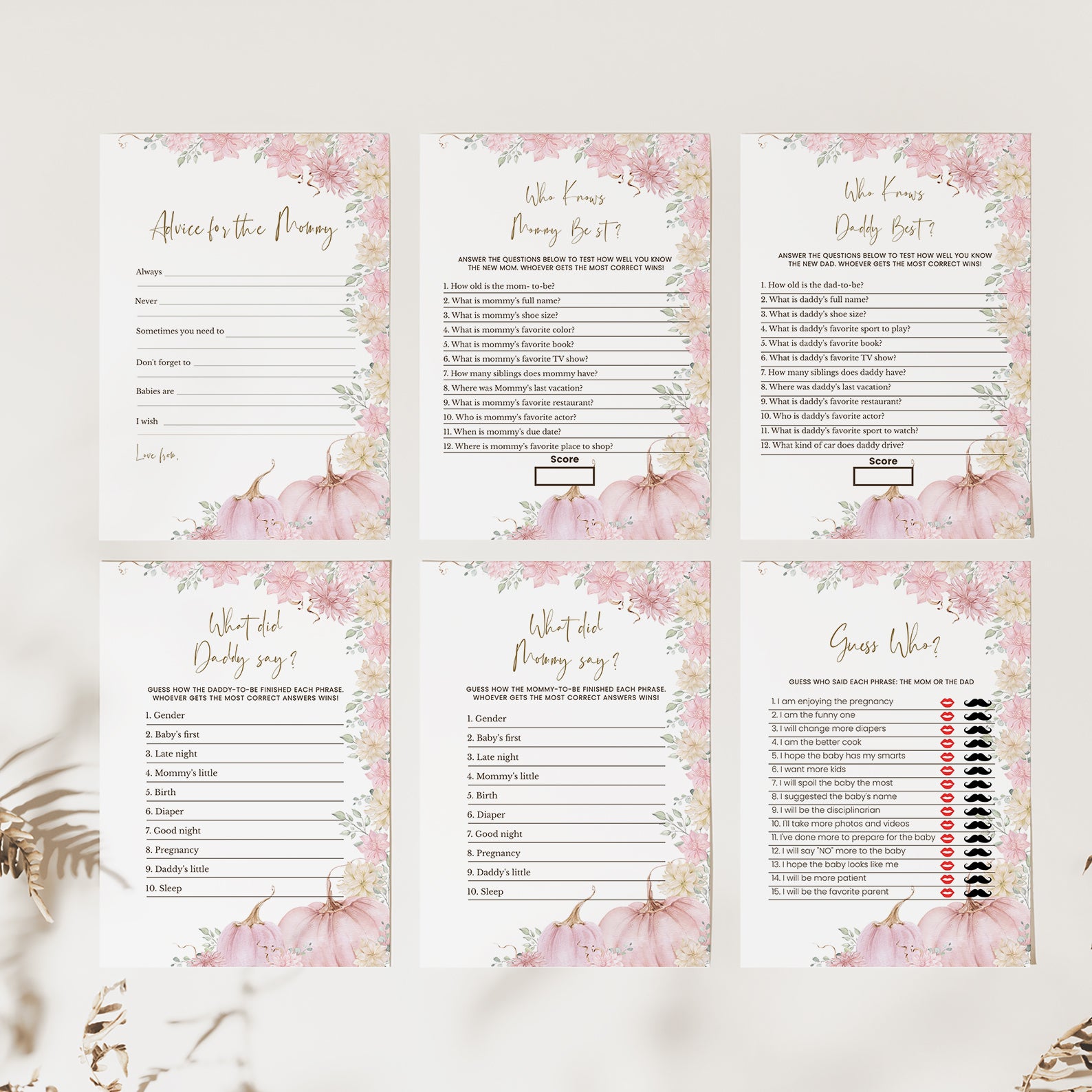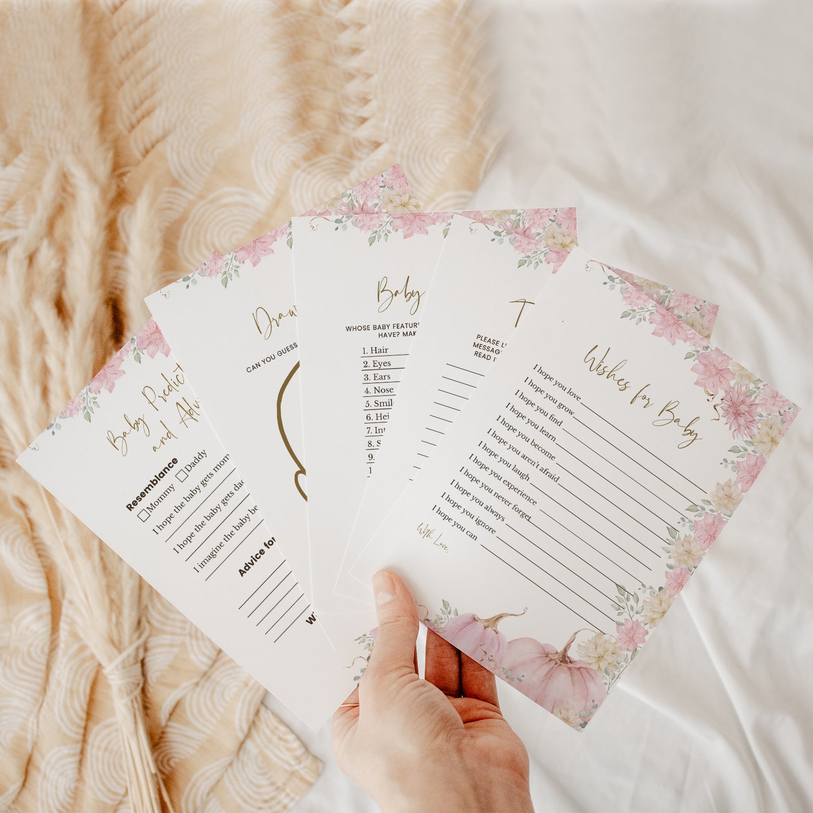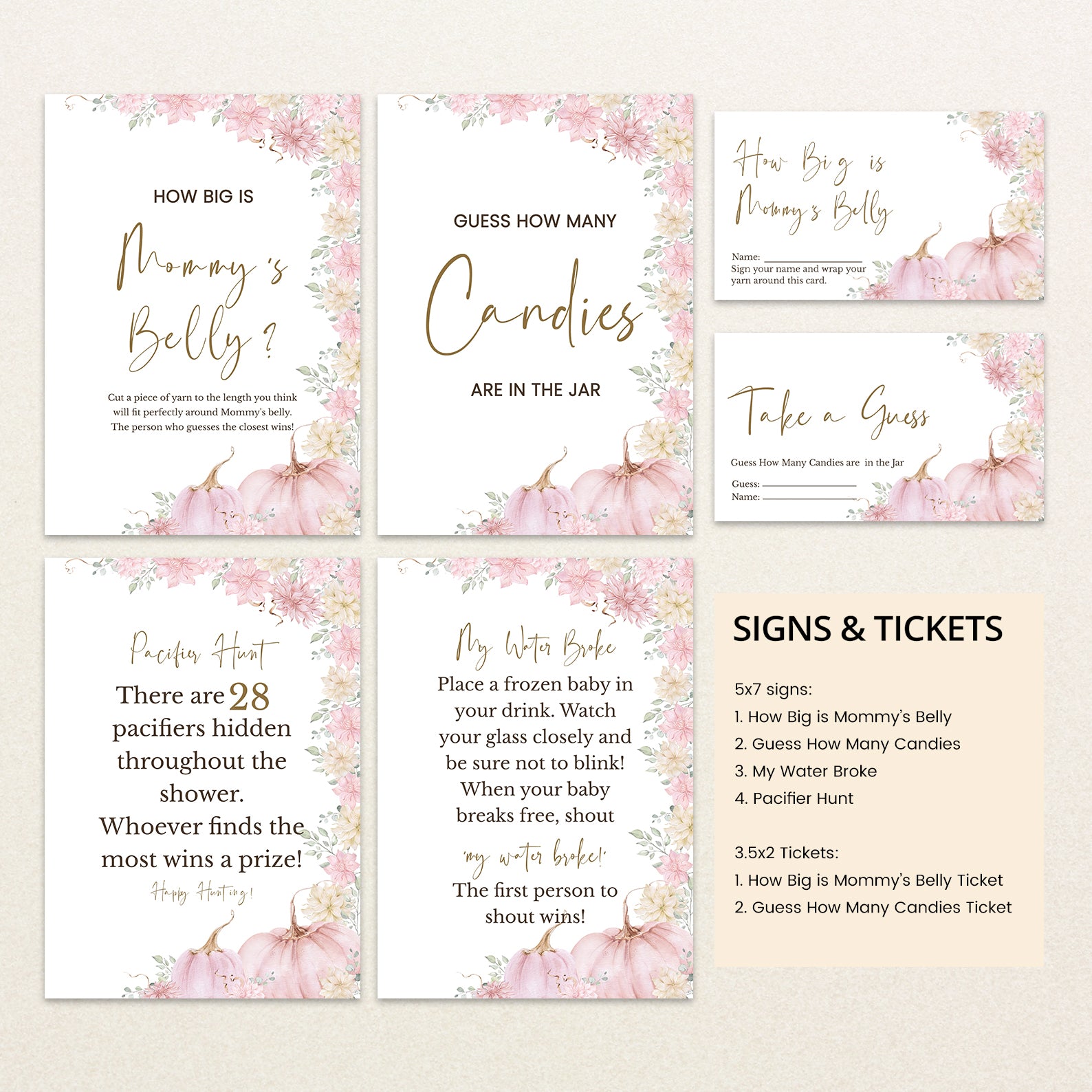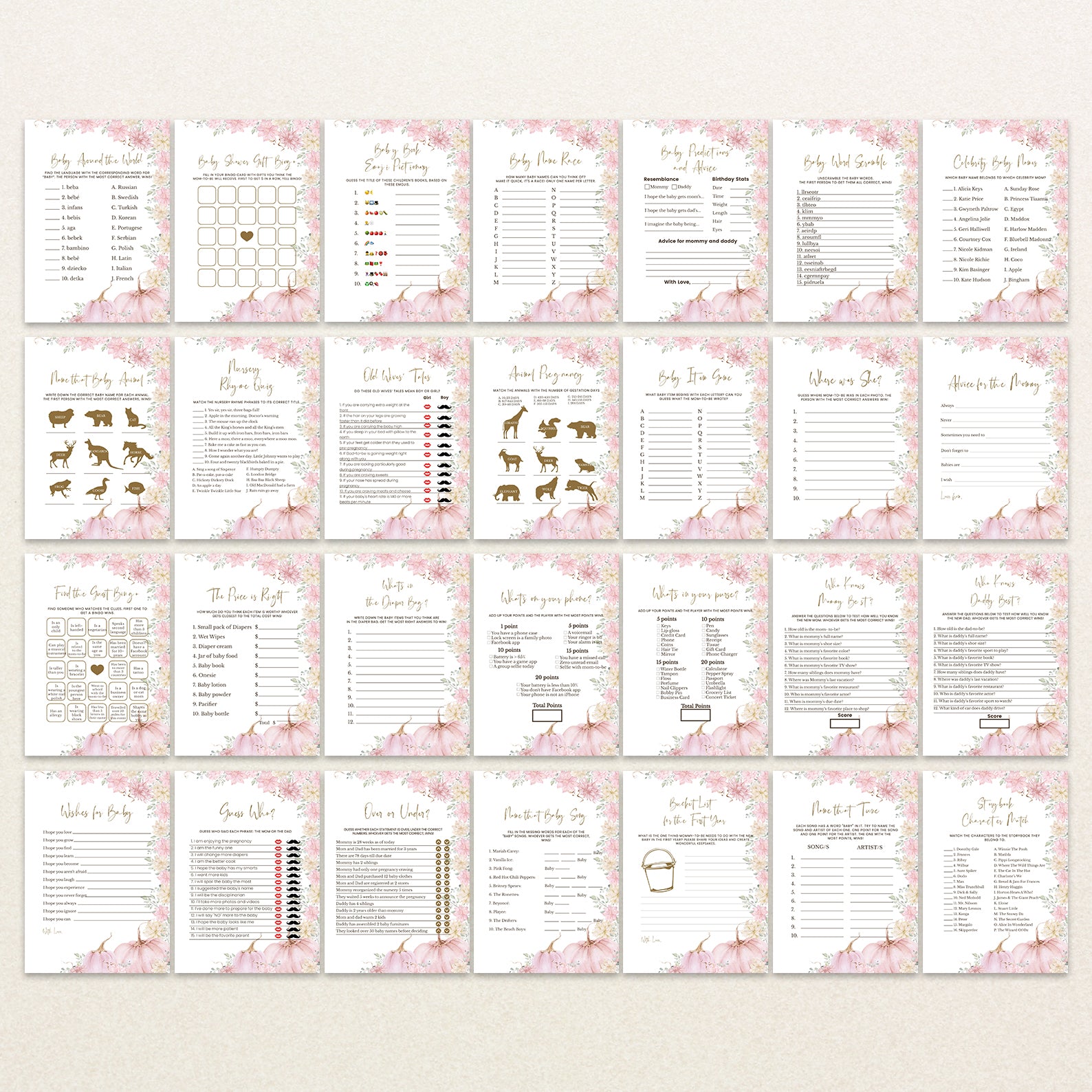 Keep guests entertained with this bundle of 60 editable baby shower games, all designed in a lovely fall palette of blush, peach, and golden hues. Each game features watercolor pumpkins and florals, blending seasonal charm with playful fun. Whether you prefer classics or unique challenges, this set offers a stylish and cohesive way to engage your guests and elevate your shower experience.