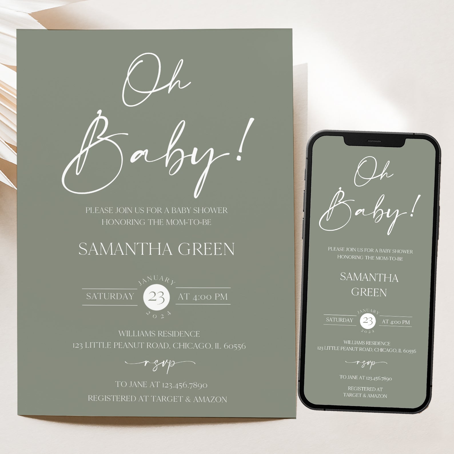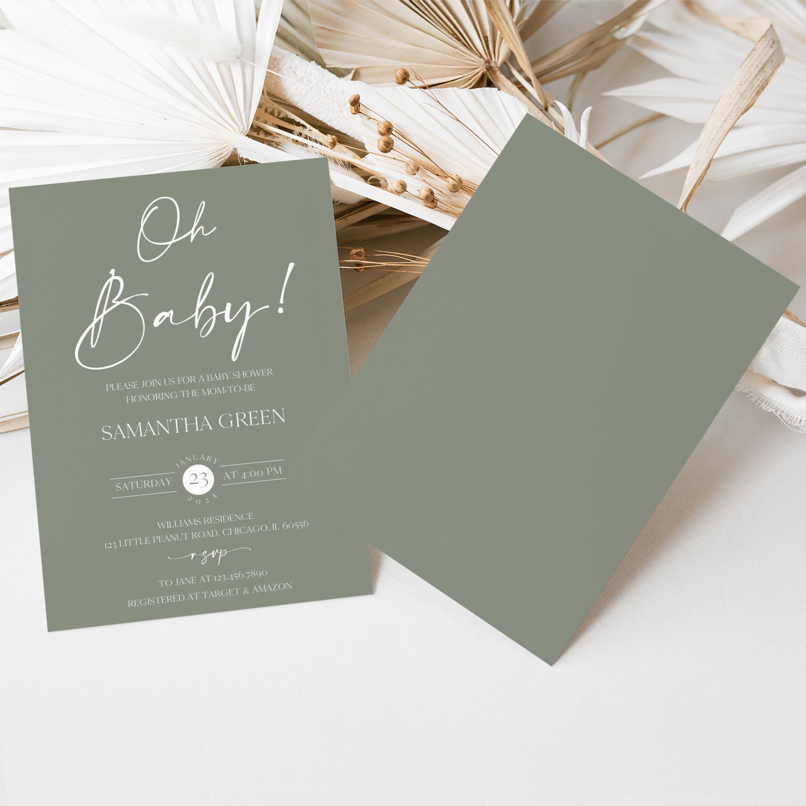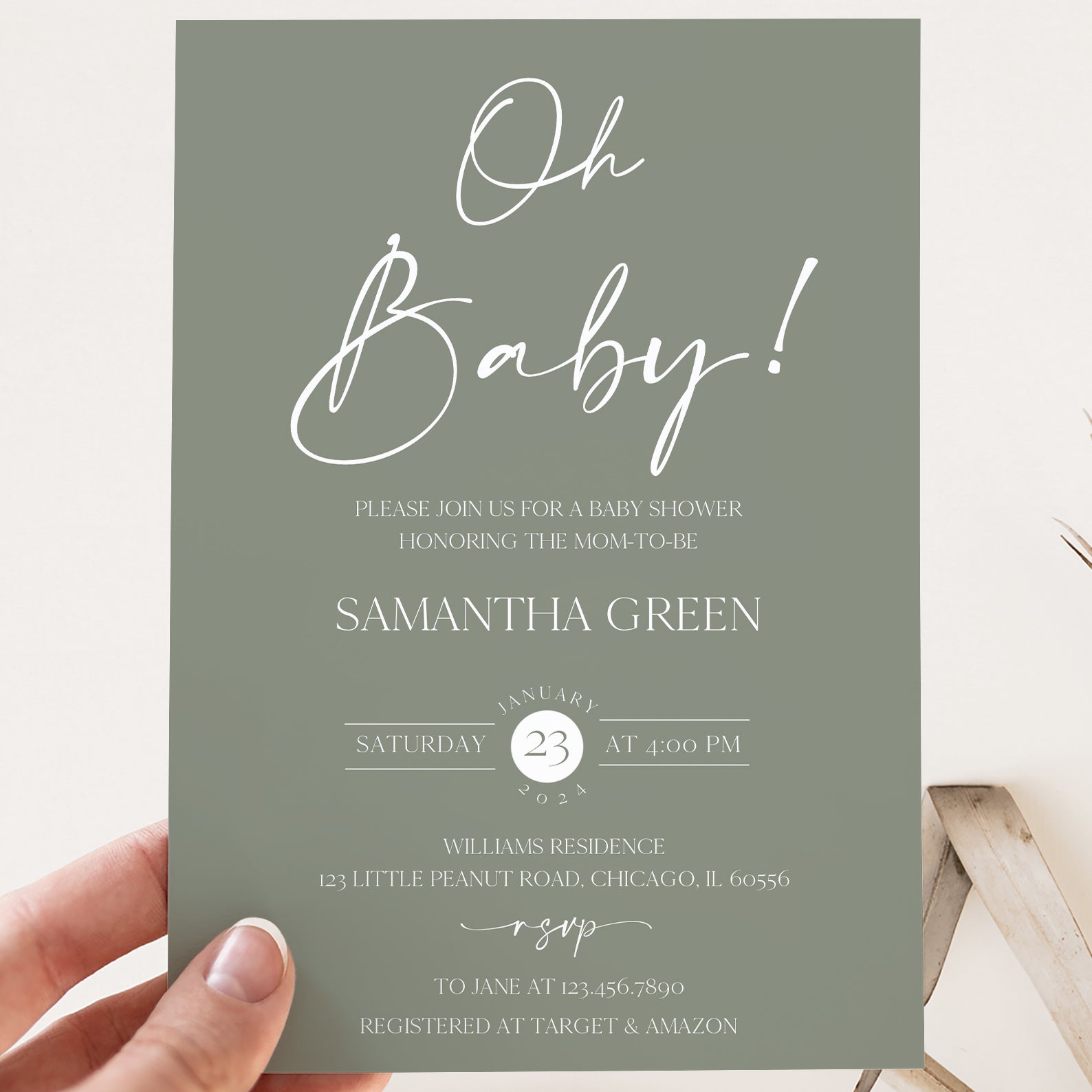 Minimalist Oh Baby Baby Shower Invitation in Sage Green