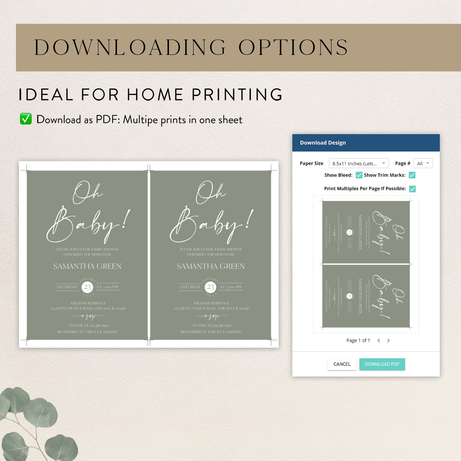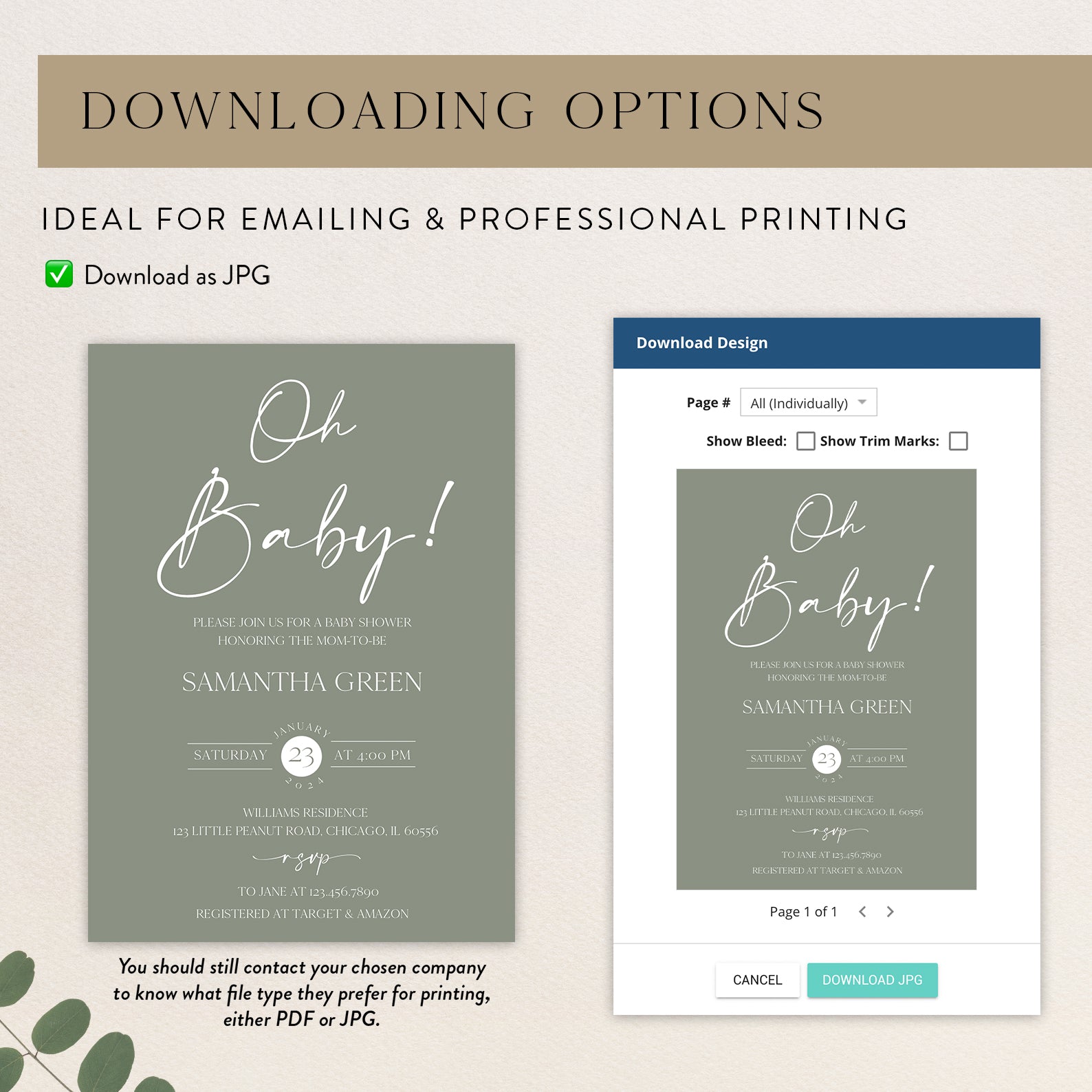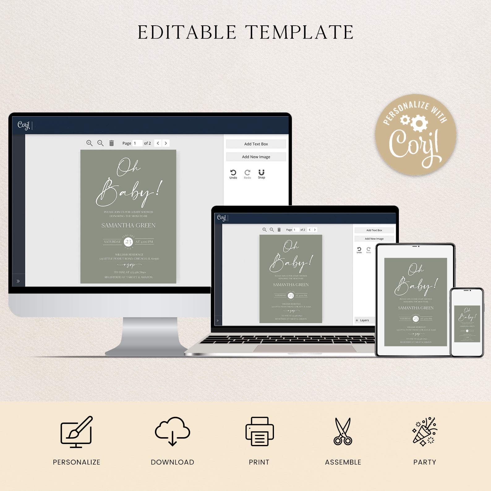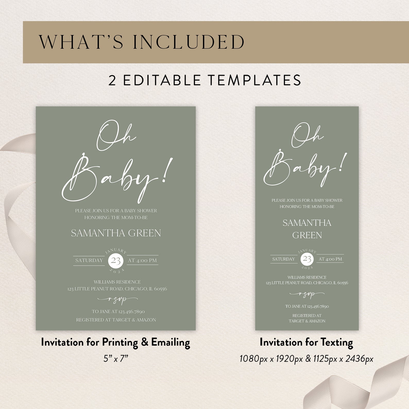 1. Purchase this Minimalist Oh Baby Baby Shower Invitation in Sage Green template