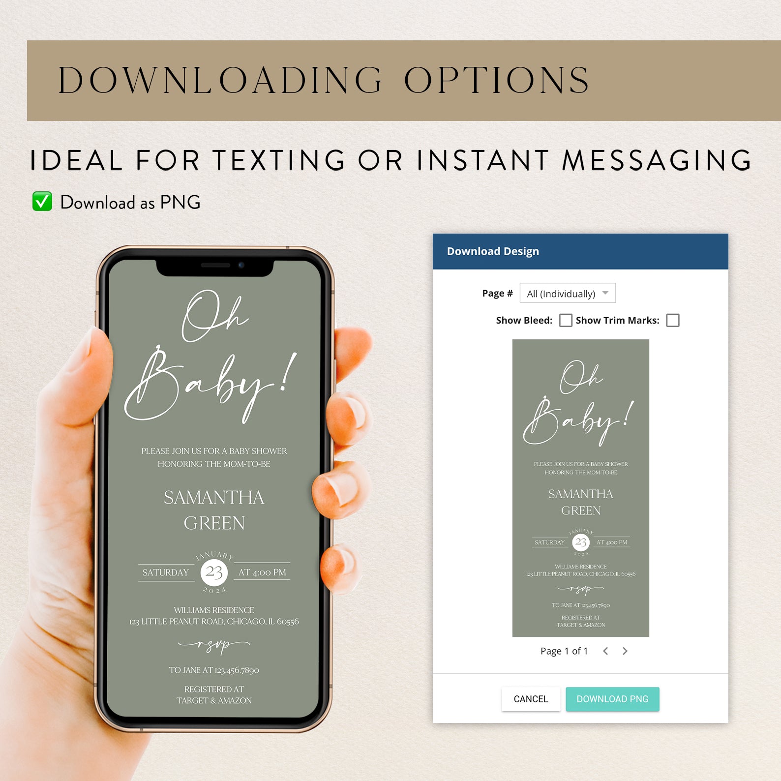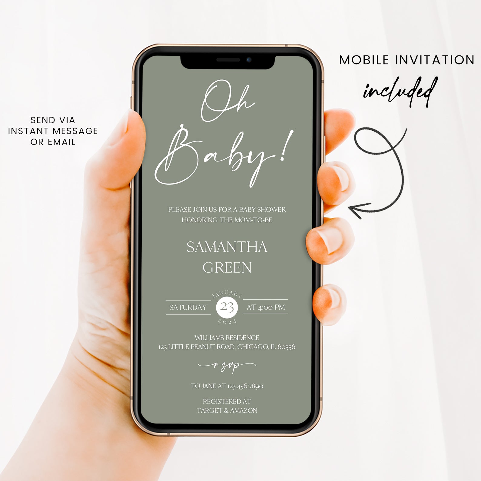 Celebrate the upcoming arrival of your little one with our minimalist "Oh Baby" digital invitation, beautifully designed on a soothing sage green background. This elegant and modern invitation sets the perfect tone for your baby shower, combining simplicity with charm. Effortlessly customizable, you can easily add your event details and send it out to friends and family, making your celebration planning a breeze. Embrace the joy of welcoming your baby with this stylish and inviting design that will leave a lasting impression on your guests.