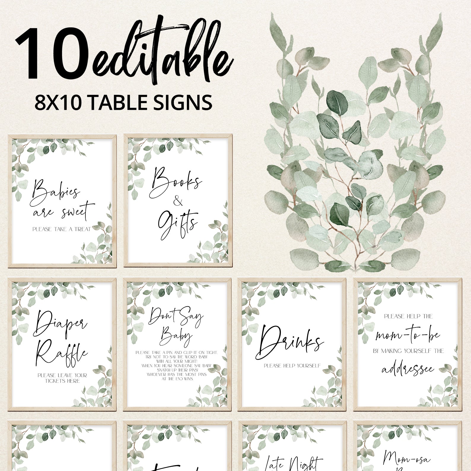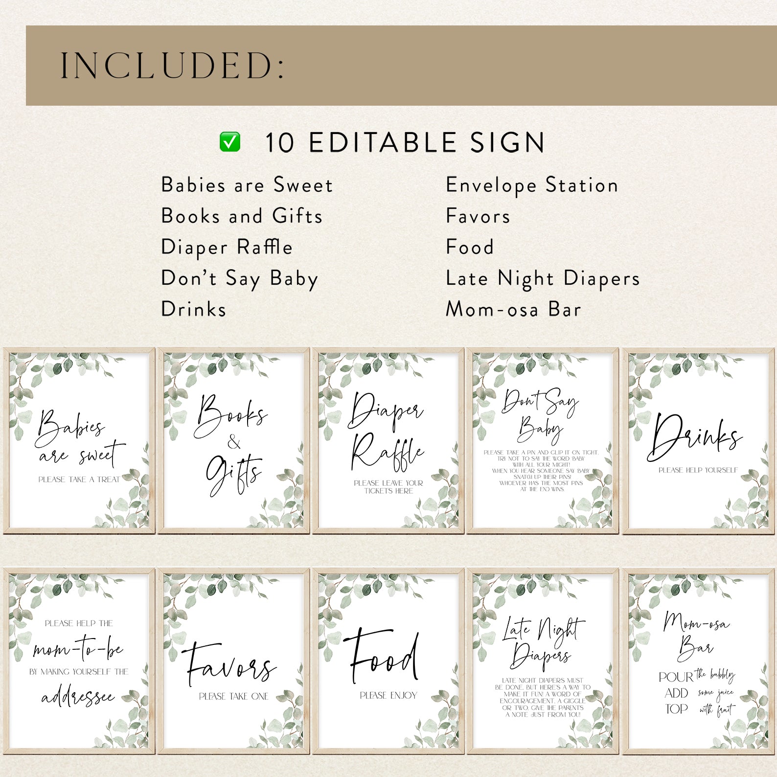 Add charm and organization to your event with our Greenery Baby Shower Table Sign Bundle. This set of ten editable signs includes: Babies Are Sweet, Books and Gifts, Diaper Raffle, Don’t Say Baby, Drinks, Envelope Station, Favors, Food, Late Night Diapers, and Mom-osa Bar. With lush green accents, these signs blend functionality with elegant style.