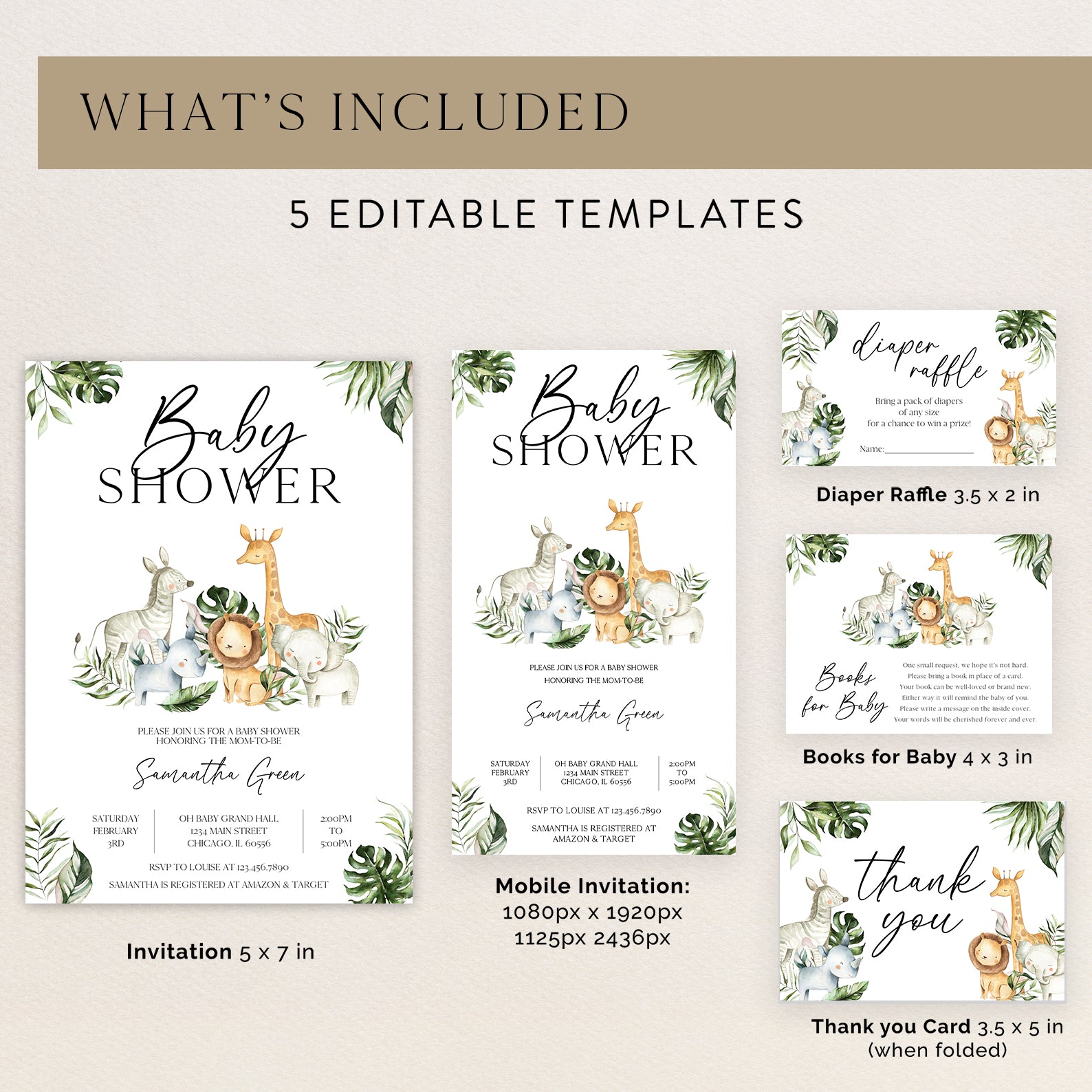 - Purchase this Jungle Adventure Baby Shower Invitation Bundle with Safari Animals template