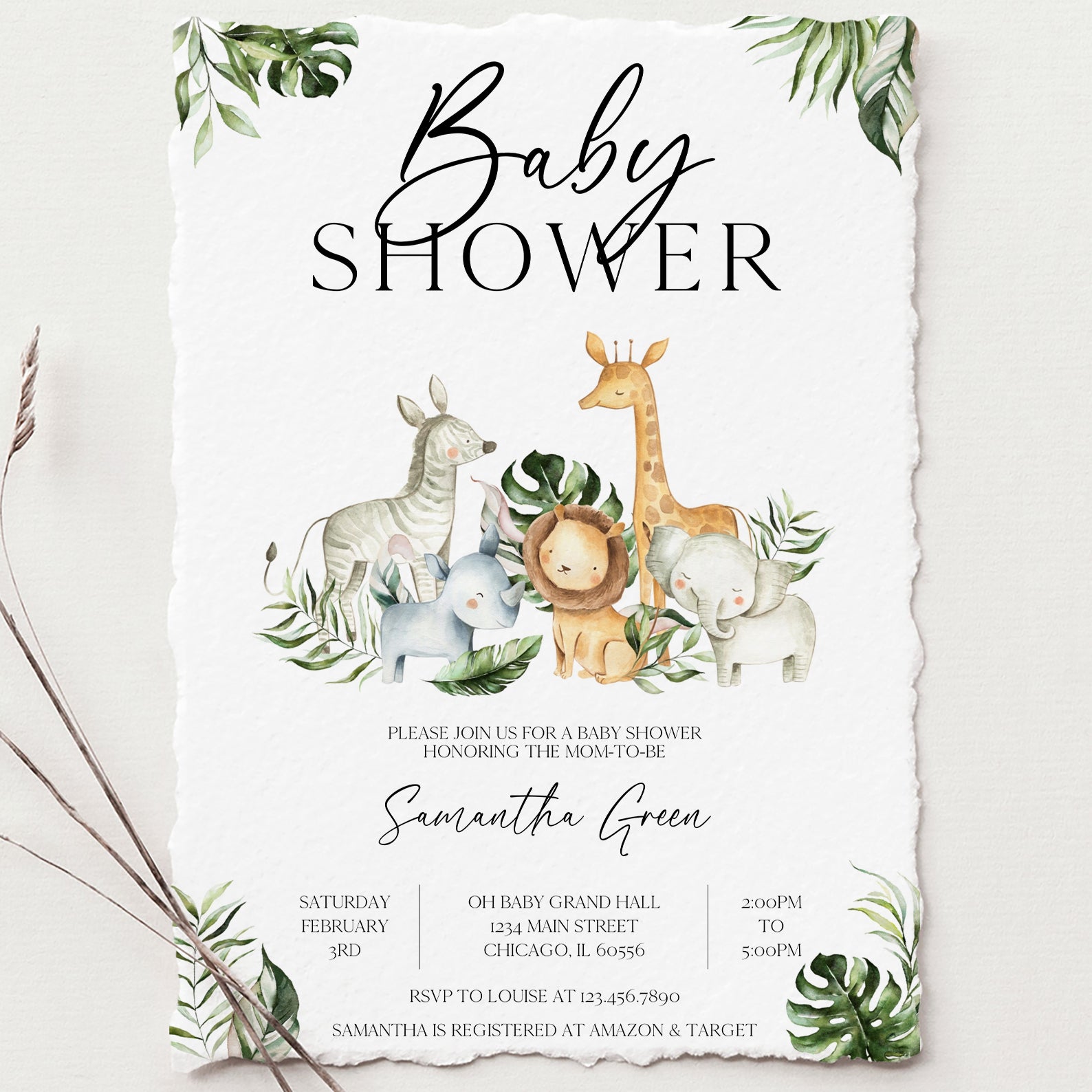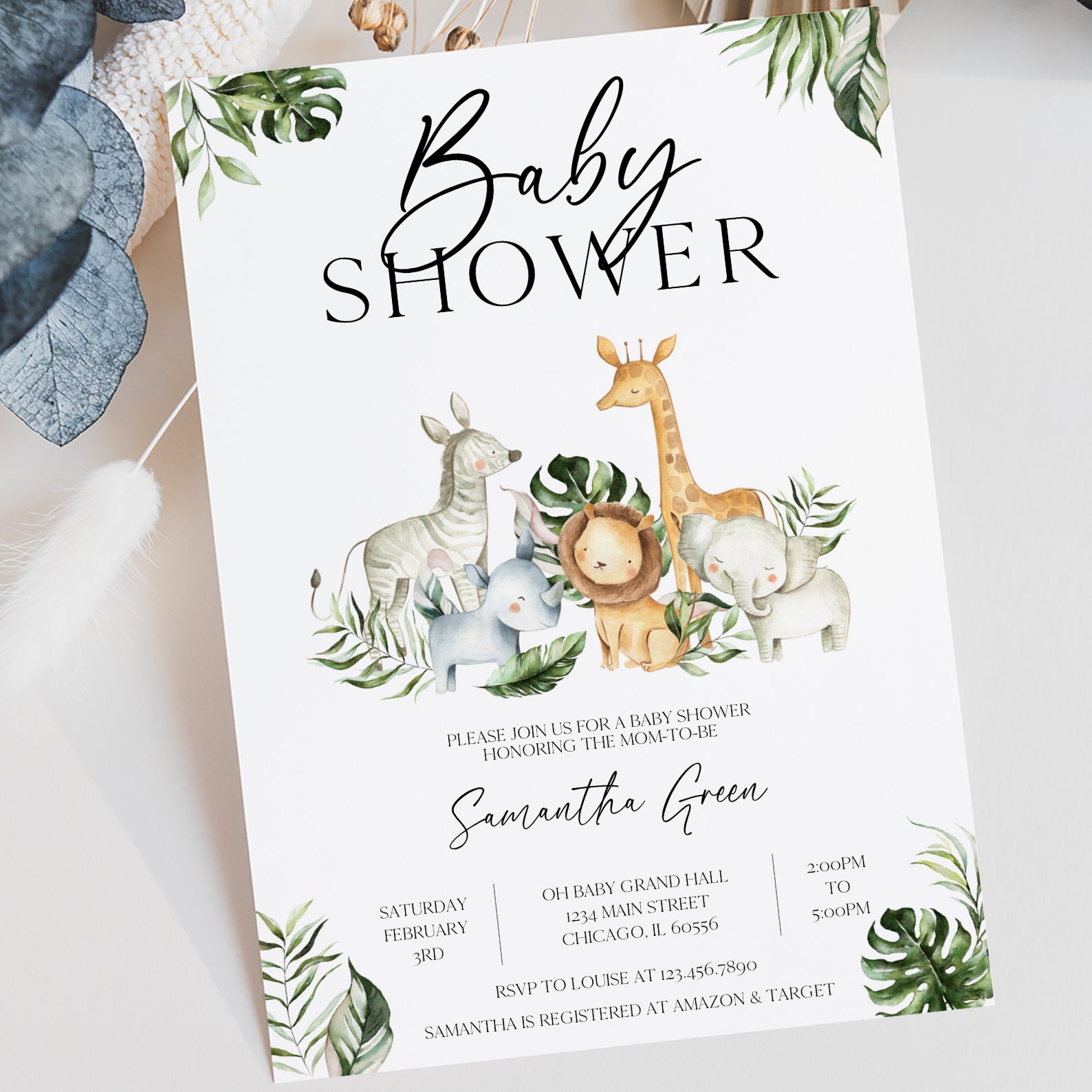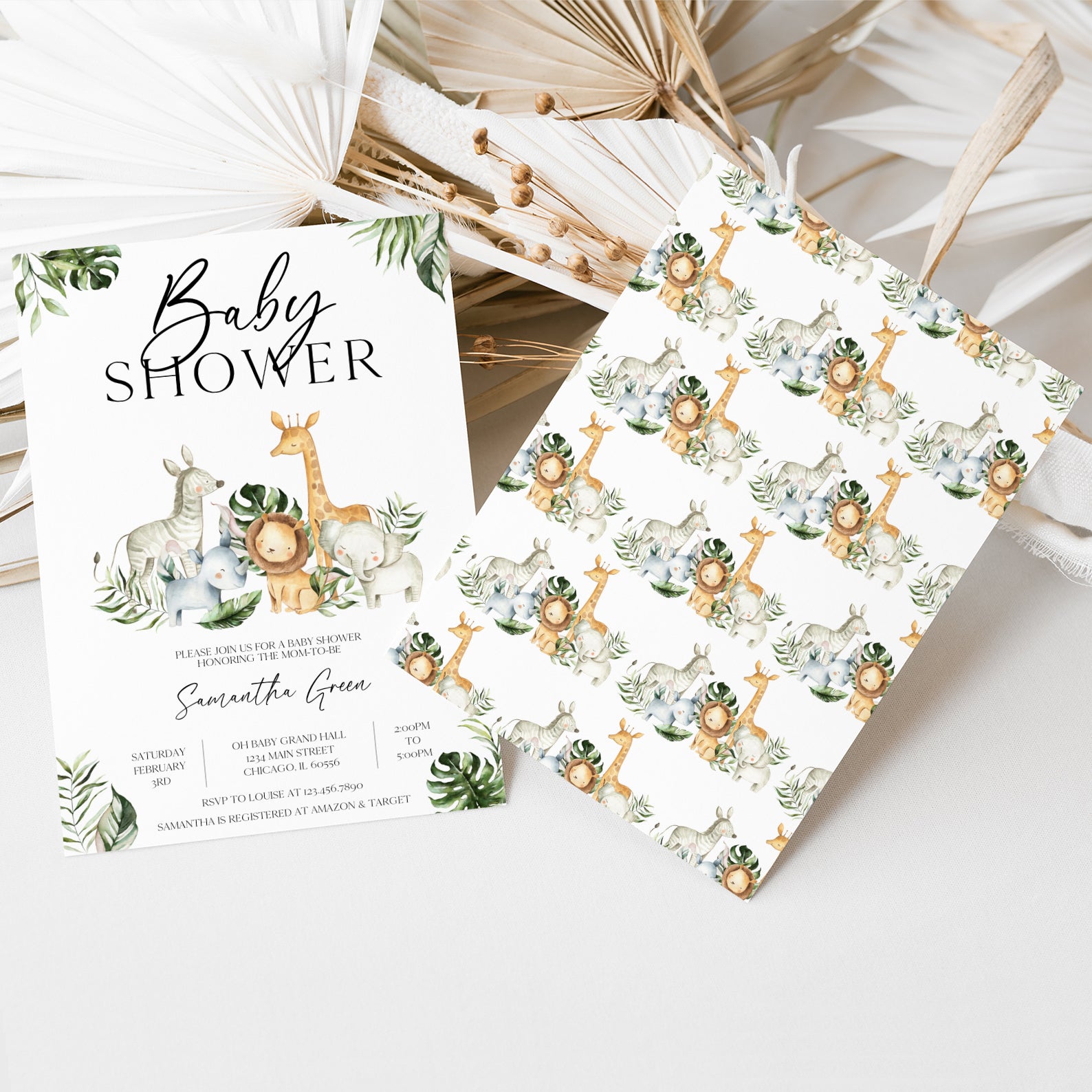 - Purchase this Jungle Adventure Baby Shower Invitation with Safari Animals template