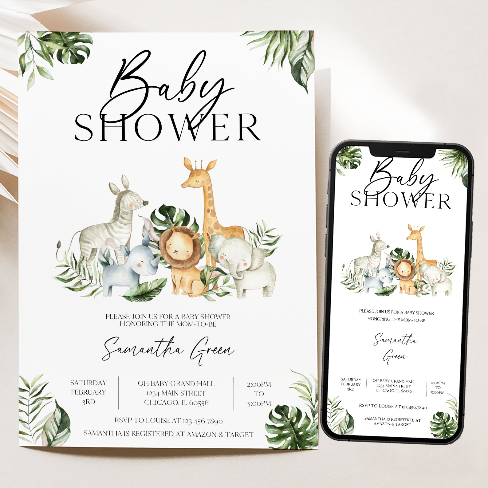 Celebrate your little one's upcoming arrival with our charming Jungle Adventure Baby Shower Digital Invitation! Adorned with vibrant jungle leaves framing the top and bottom, this delightful design features an adorable ensemble of jungle animals: zebra, rhino, lion, elephant, and giraffe, playfully gathered in the center. Perfect for setting a fun and festive tone, this invitation is not only easy to customize but also ensures your guests are excited to join the wild celebration. Make your baby shower unforgettable with this enchanting invitation that captures the spirit of adventure!