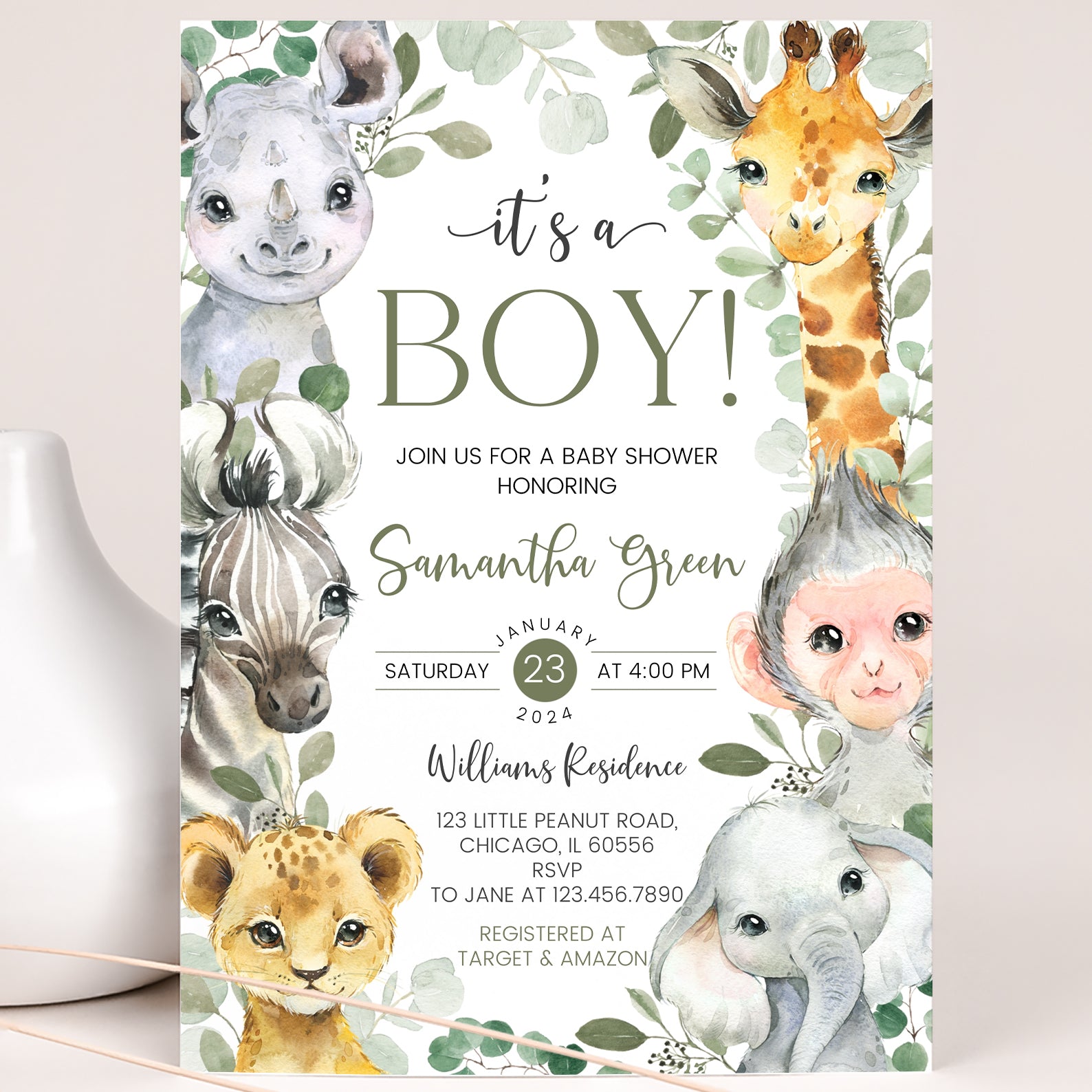 - Purchase this It’s a Boy Jungle Baby Shower Invite: Cute Safari Animals template