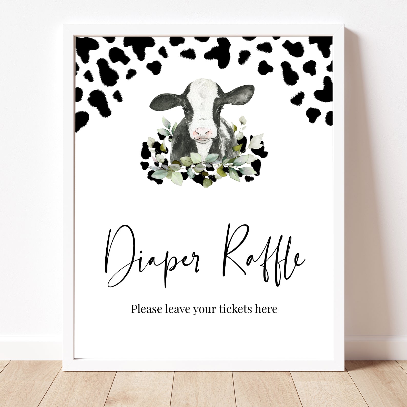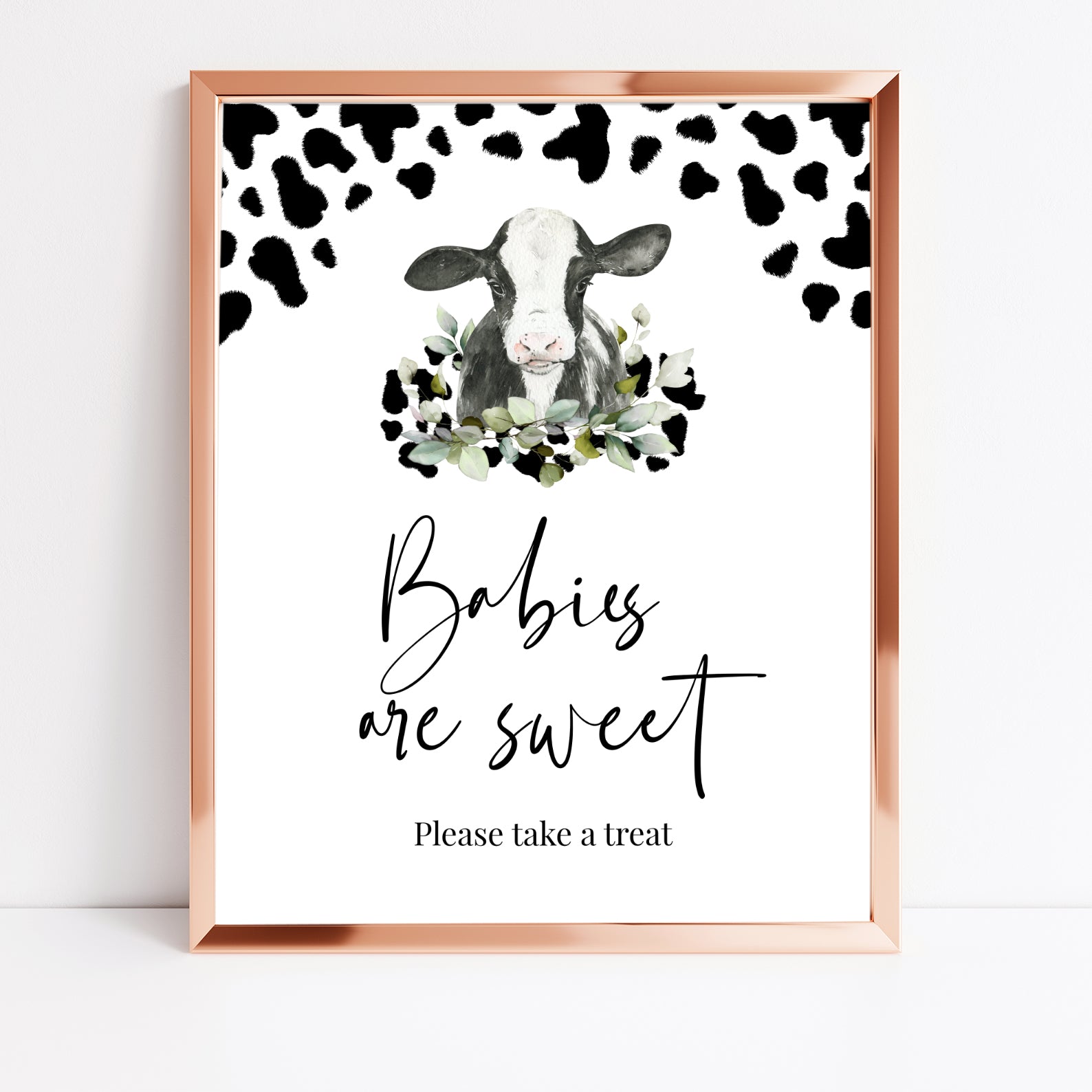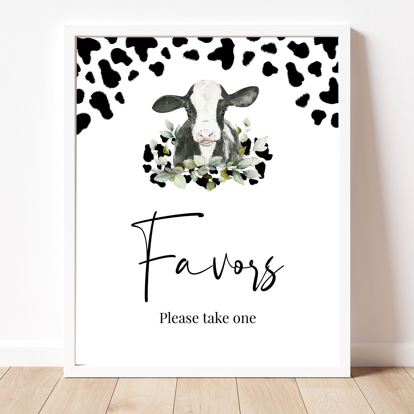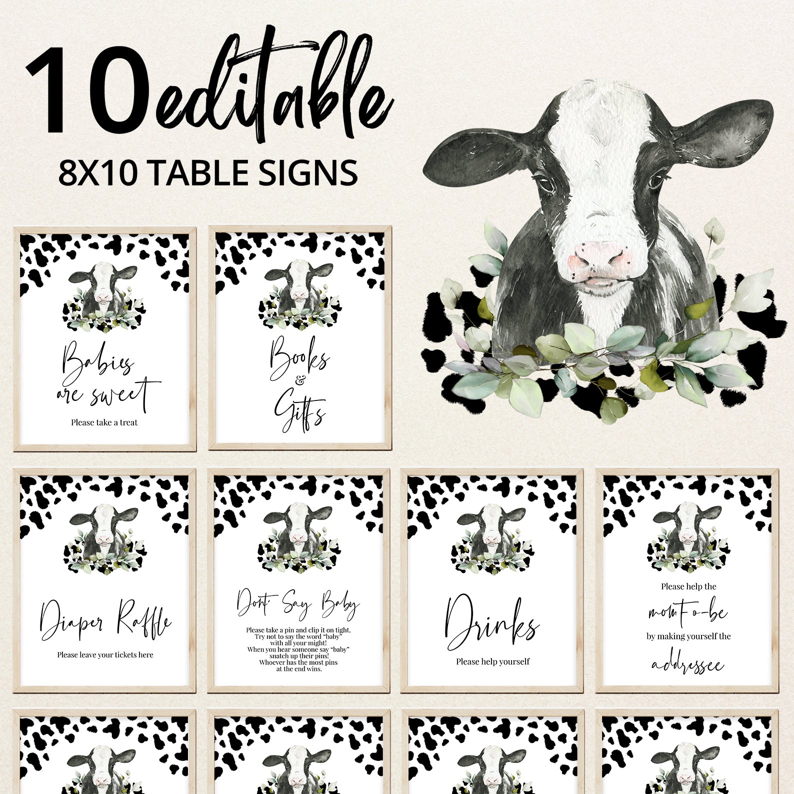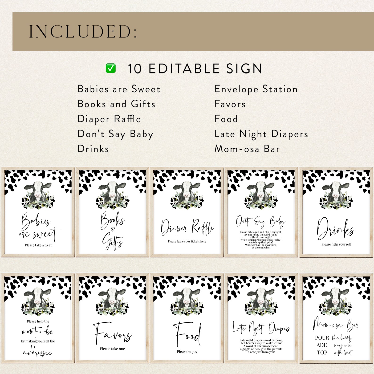 Keep your baby shower organized and charming with our "Have You Heard the Moos?" Table Sign set! This editable bundle includes ten signs: Babies Are Sweet, Books and Gifts, Diaper Raffle, Don’t Say Baby, Drinks, Envelope Station, Favors, Food, Late Night Diapers, and Mom-osa Bar. Featuring a whimsical cow with black-and-white prints and green leaves, these signs add a playful, farm-inspired touch to your tablescape.
