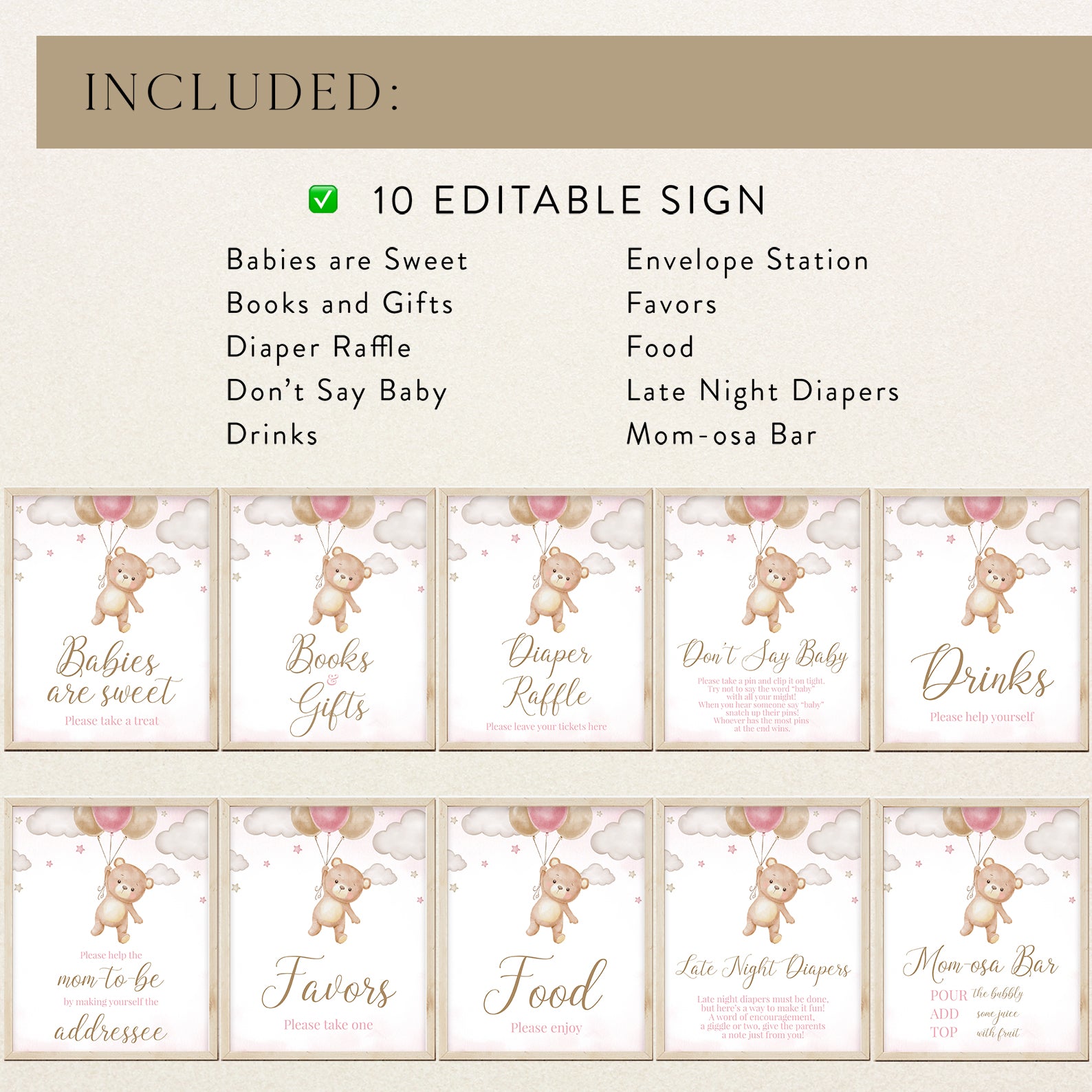 Add a whimsical touch to your baby shower with our charming "We Can Bearly Wait" table signs! Featuring an adorable teddy bear floating with a balloon, surrounded by fluffy clouds and twinkling stars, these signs are available in green, brown, blue, or pink to match your theme. This editable set of 10 includes Babies Are Sweet, Books and Gifts, Diaper Raffle, Don’t Say Baby, Drinks, Envelope Station, Favors, Food, Late Night Diapers, and Mom-osa Bar. Perfect for tying your event together with style and sweetness!