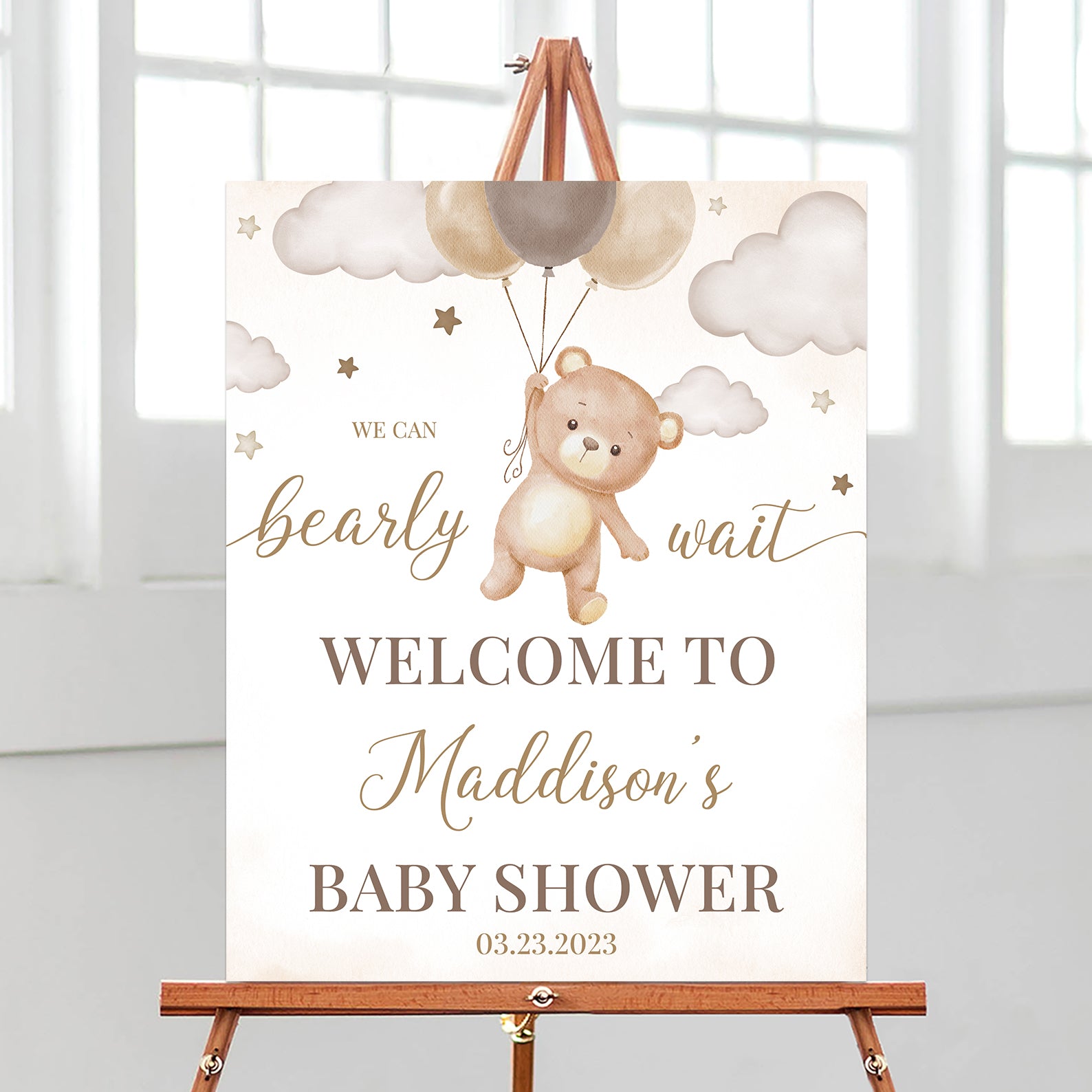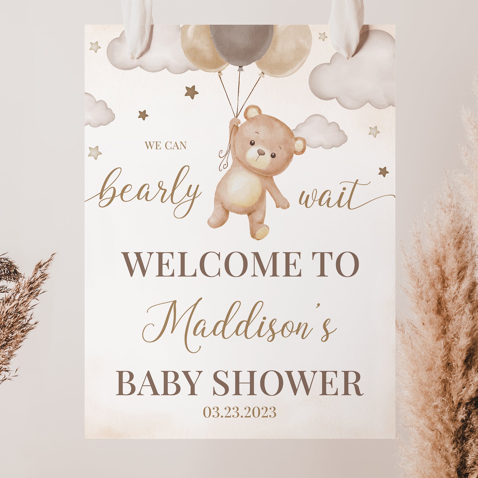 - Purchase this Flying Teddy Bear Brown Baby Shower Welcome Sign: We Can Bearly Wait template