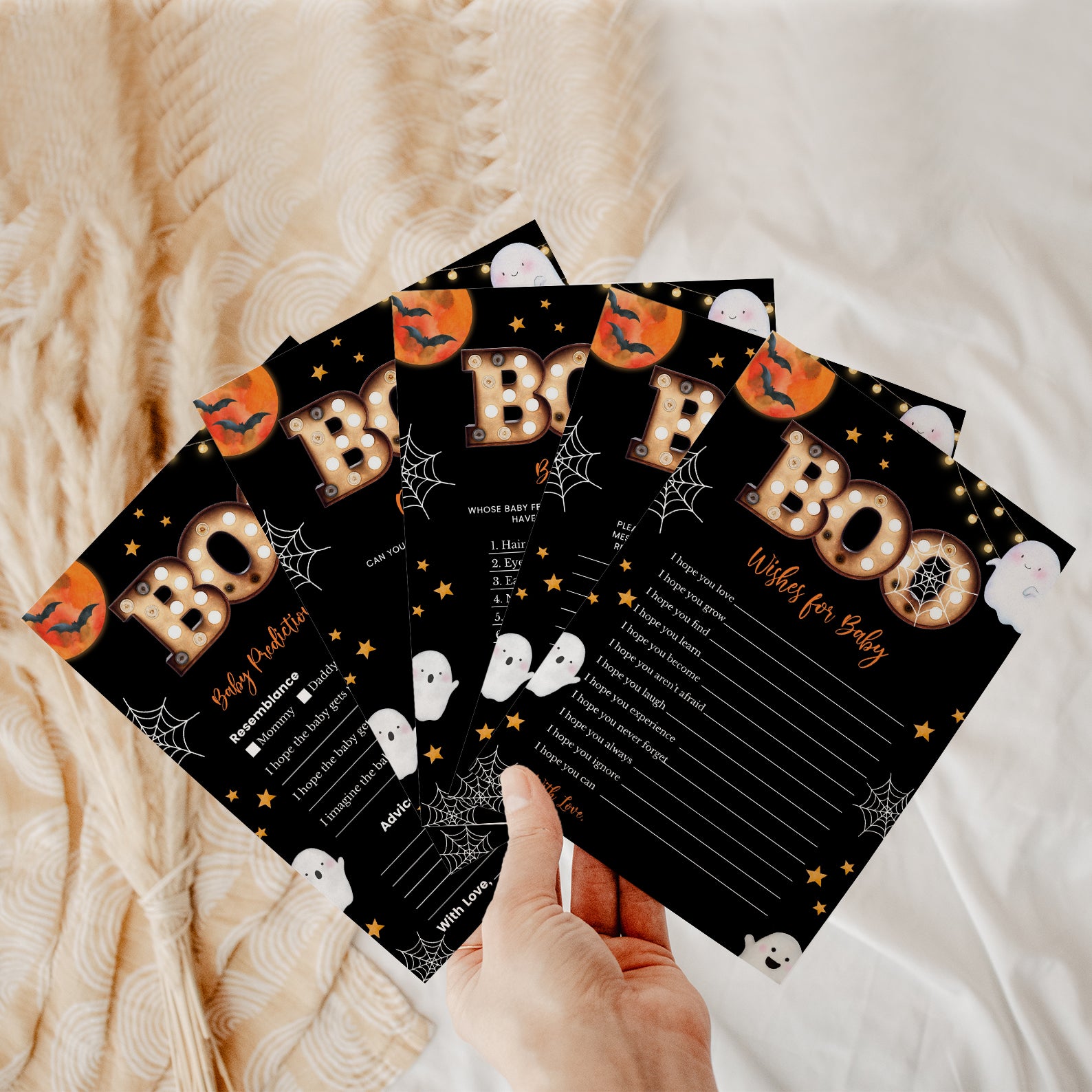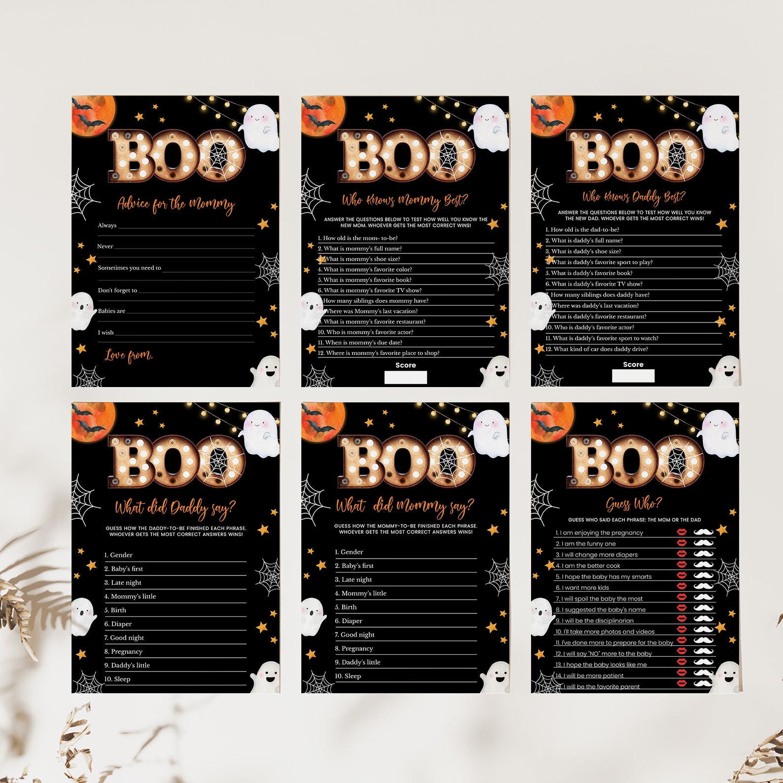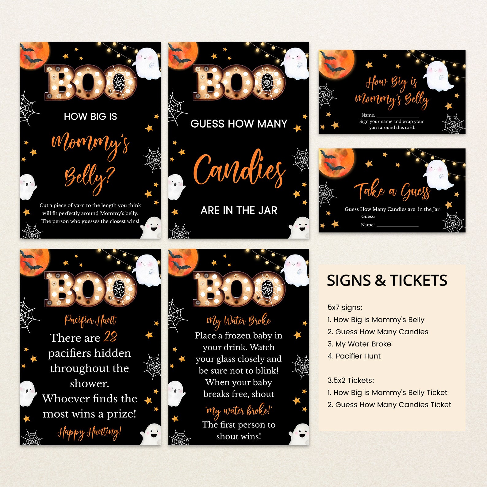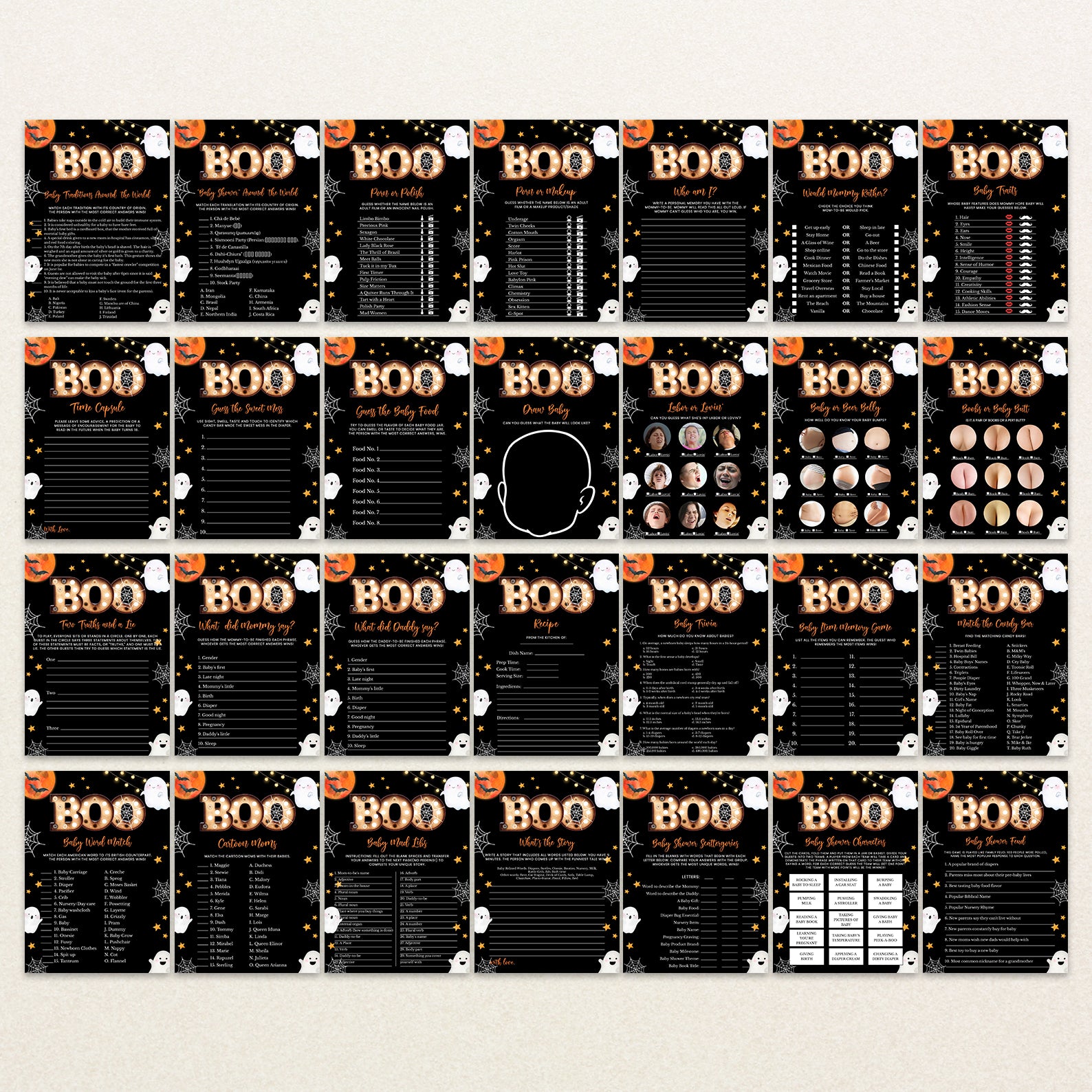 Get ready for a spooktacular celebration with our “Little Boo’s Halloween Game Bundle!” This set of editable games is perfect for adding a delightful touch of Halloween magic to your baby shower. Featuring a dramatic black background with twinkling stars, playful ghosts gliding through the night, intricate spider webs, and flying bats, this bundle creates an enchanting atmosphere. Complemented by a vibrant orange full moon, these games are designed to engage and entertain your guests, setting the stage for a fun and festive event. Make your baby shower unforgettable with this charming and whimsical Halloween-themed game collection!