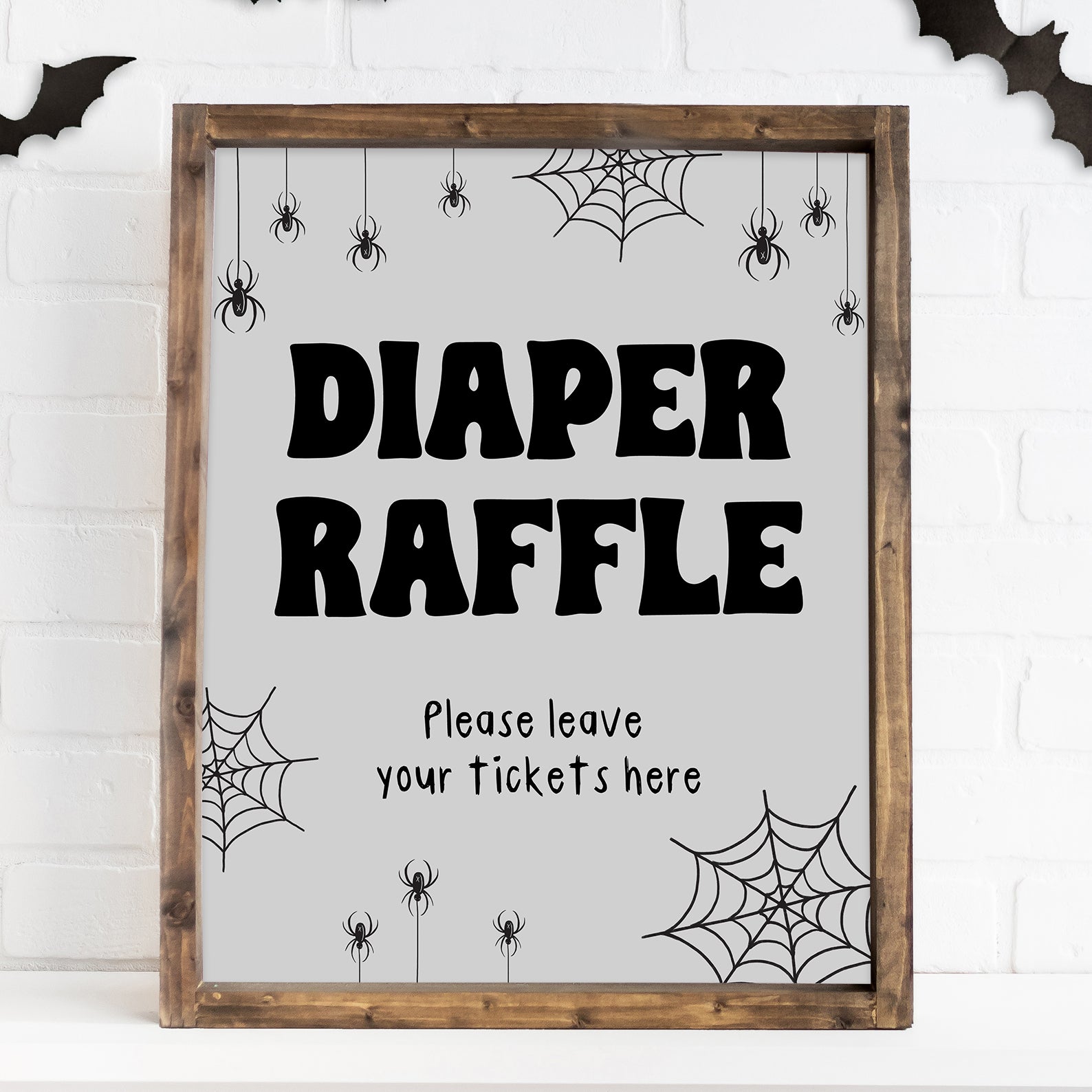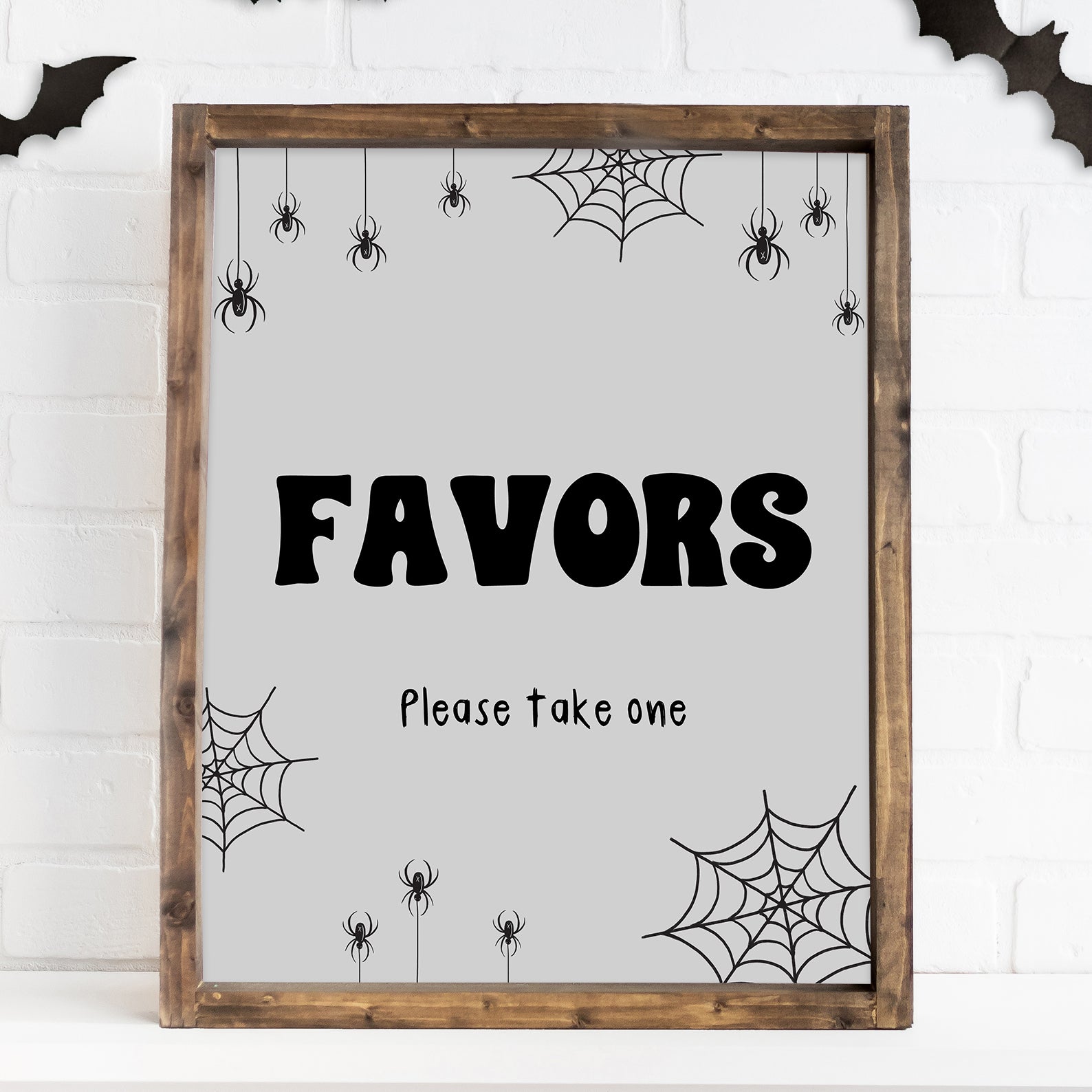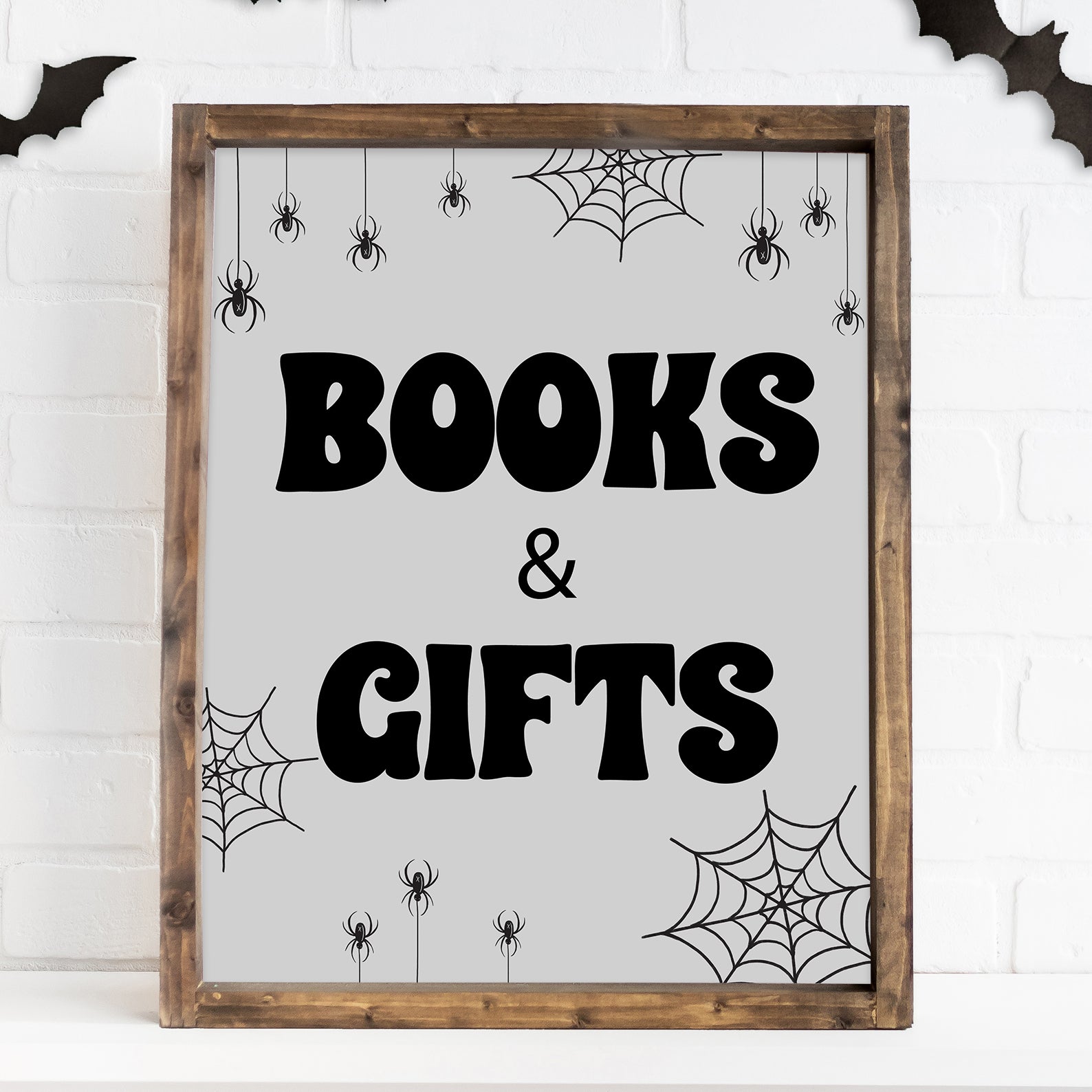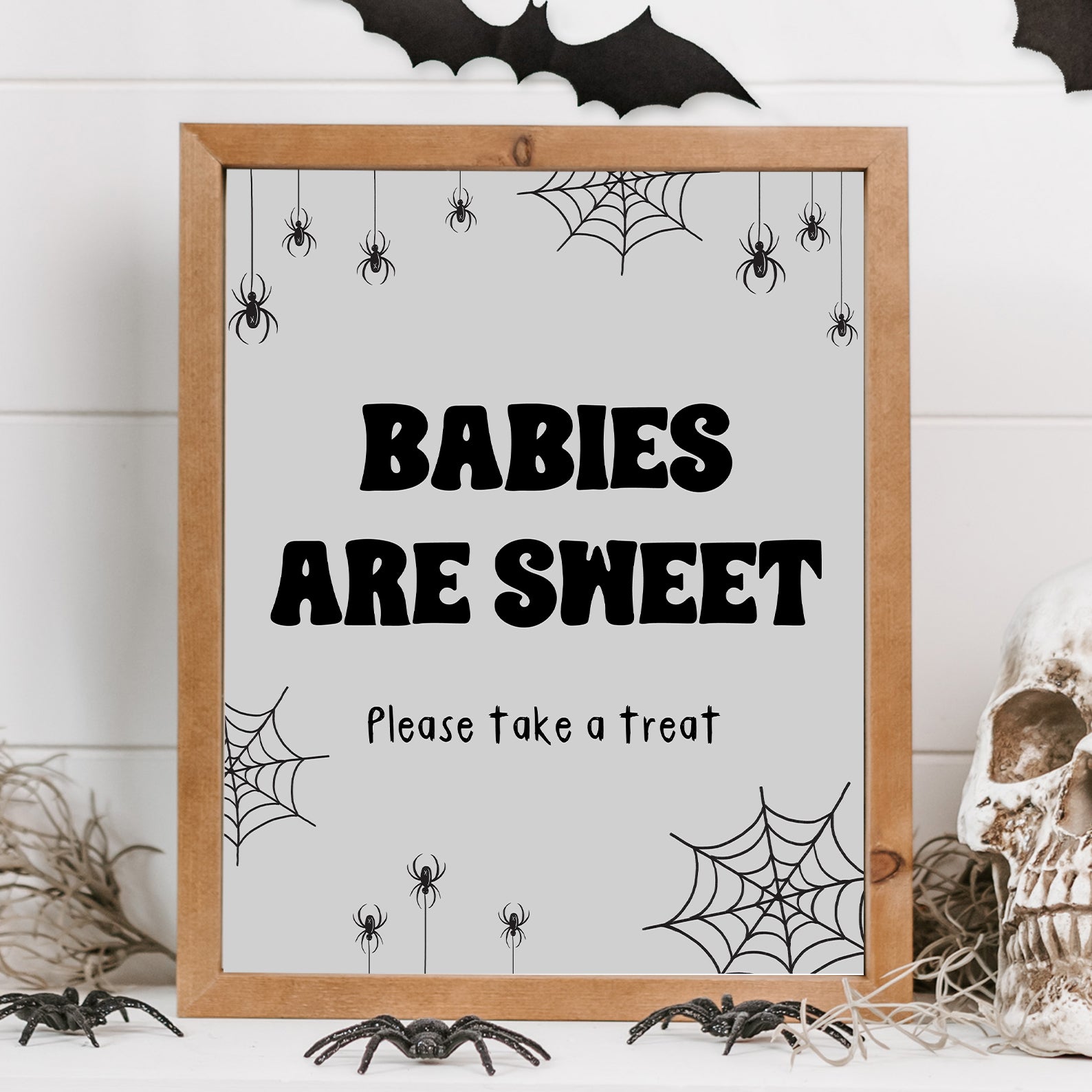Spooky Baby Shower Table Sign: Grey Background & Falling Spiders