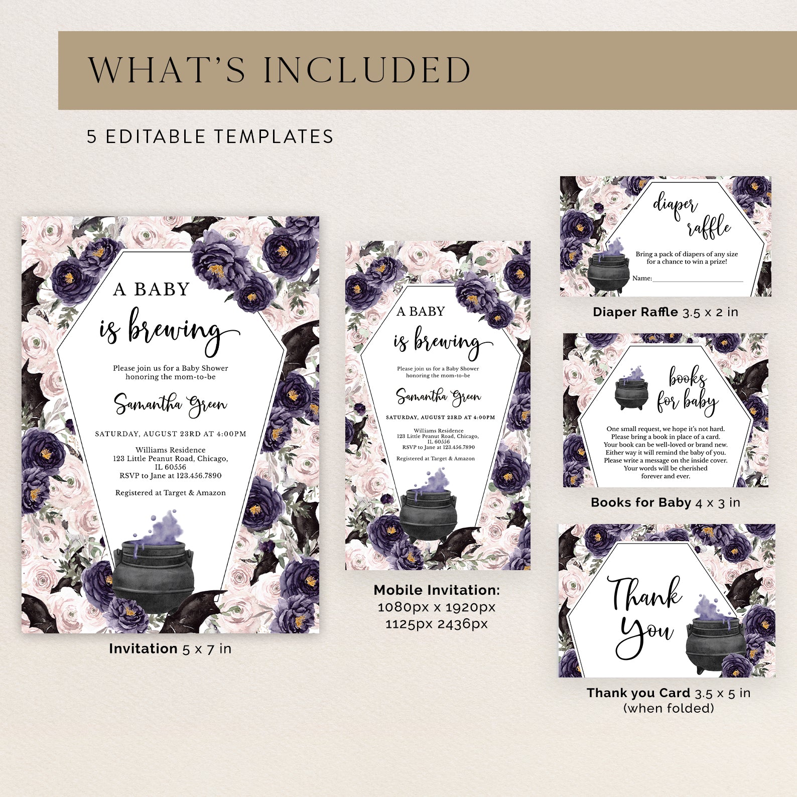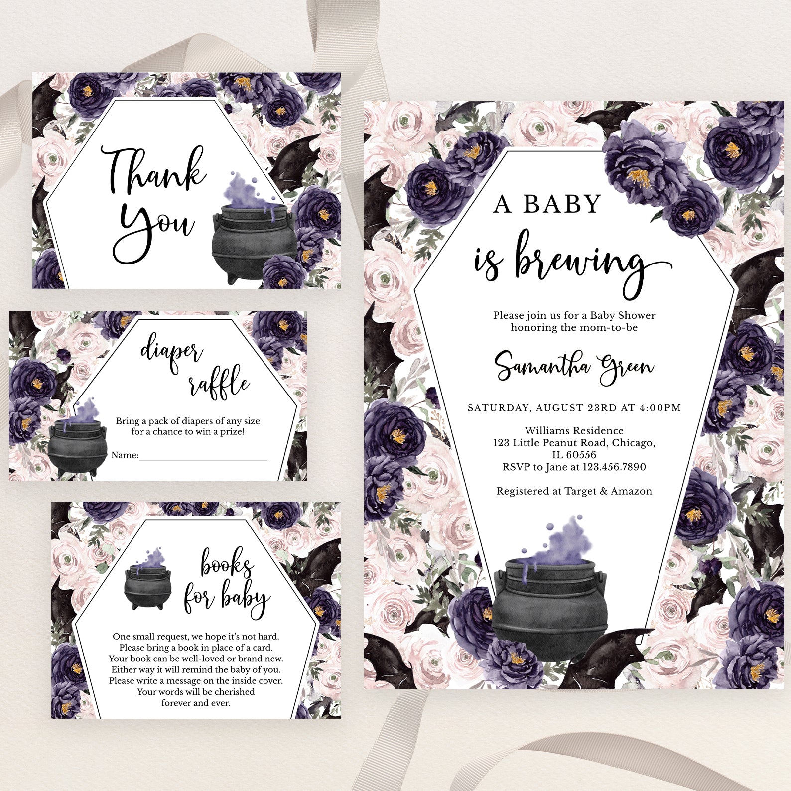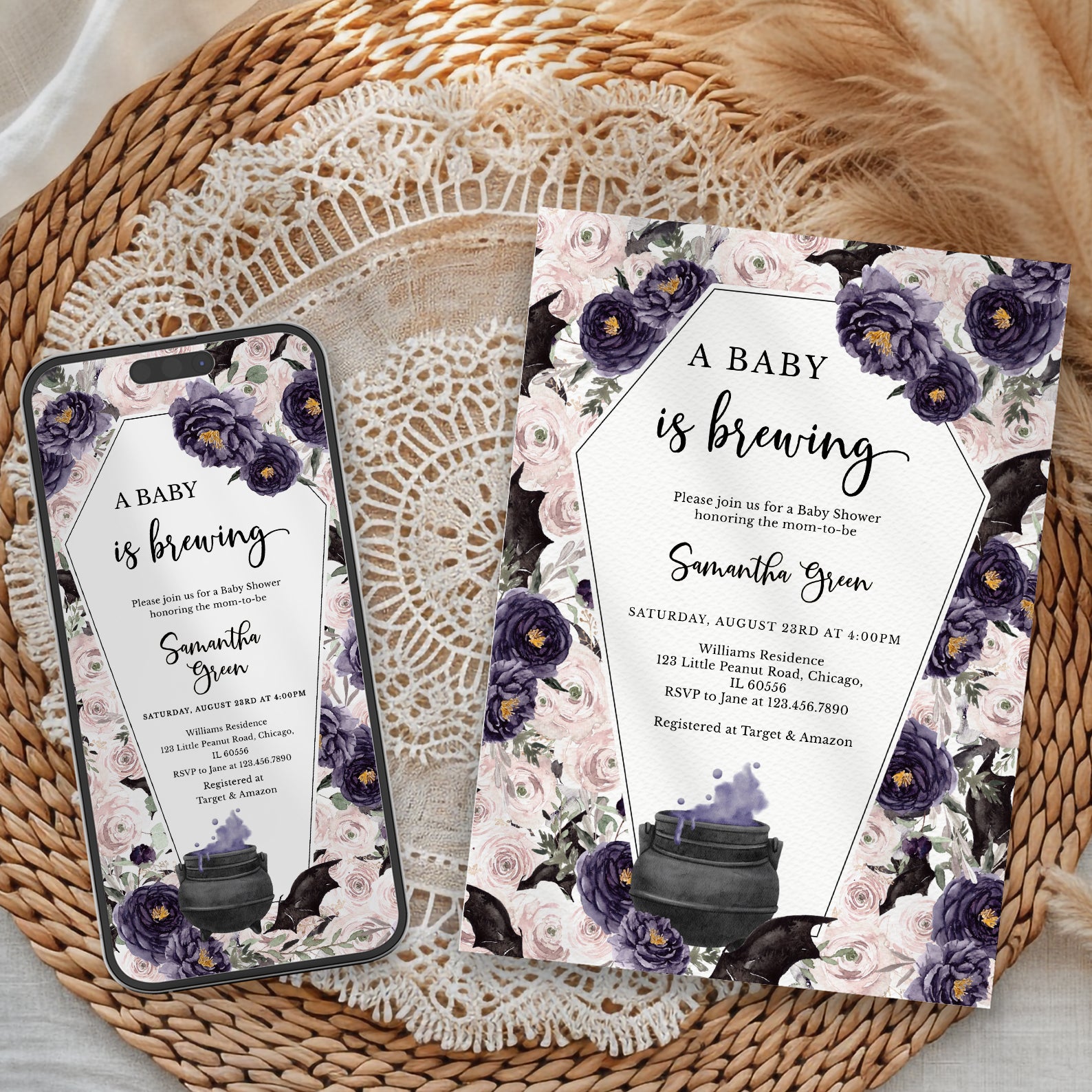 Celebrate your little one with our 'A Baby is Brewing' invitation bundle! This enchanting set includes: Invitation: Coffin-shaped design with a whimsical cauldron, playful bats, and watercolor roses. Mobile Invitation: A digital version perfect for on-the-go sharing. Diaper Raffle Card: Match your theme and encourage guests to bring diapers for a chance to win. Books for Baby Card: Request cherished books with a coordinating card. Thank You Card: Show your appreciation with a matching thank you card. Set the tone for a magical baby shower with this charming bundle!